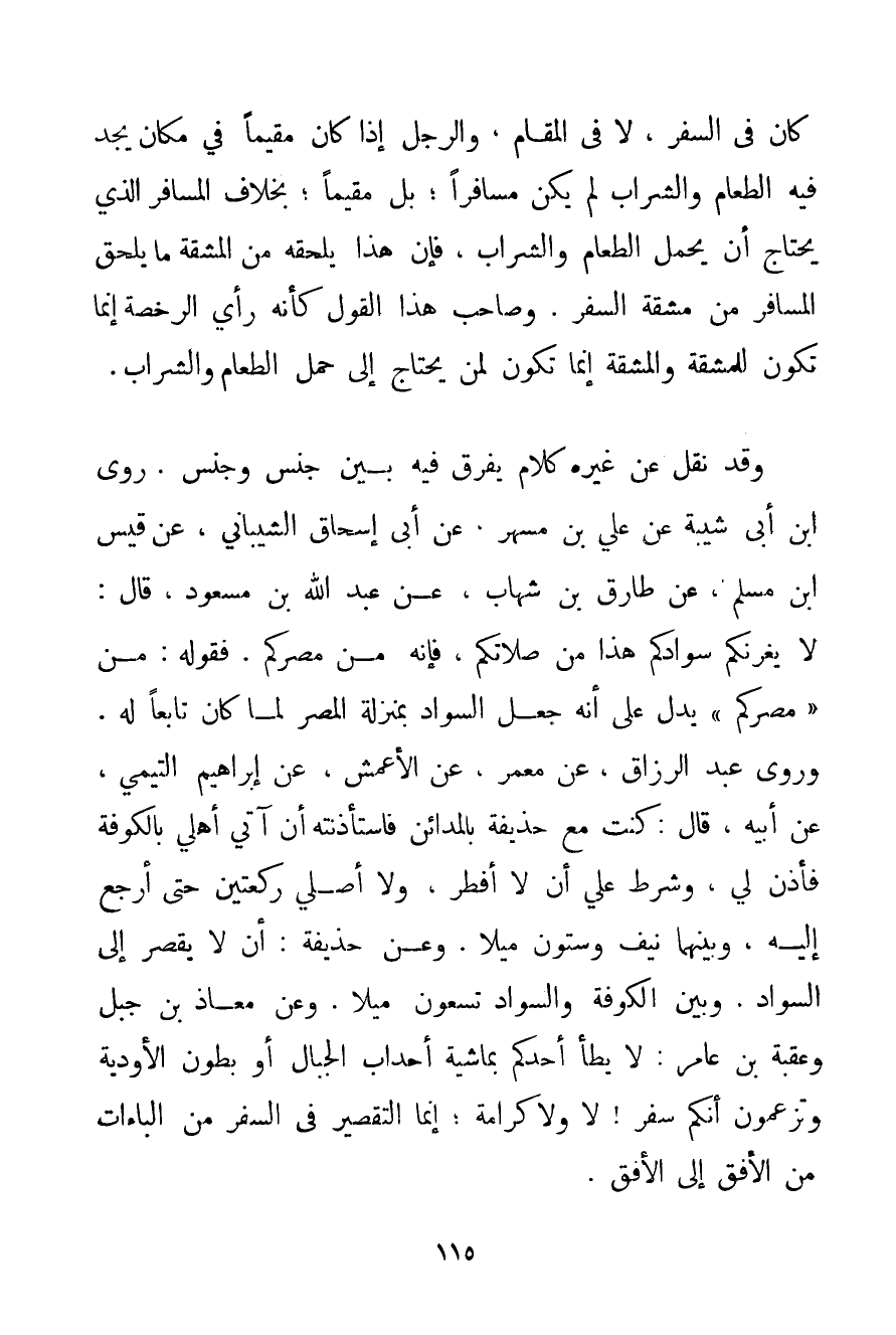 كَانَ فِي السَّفَرِ لَا فِي الْمُقَامِ وَالرَّجُلُ إذَا كَانَ مُقِيمًا فِي مَكَانٍ يَجِدُ فِيهِ الطَّعَامَ وَالشَّرَابَ لَمْ يَكُنْ مُسَافِرًا؛ بَلْ مُقِيمًا؛ بِخِلَافِ الْمُسَافِرِ الَّذِي يَحْتَاجُ أَنْ يَحْمِلَ الطَّعَامَ وَالشَّرَابَ فَإِنَّ هَذَا يَلْحَقُهُ مِنْ الْمَشَقَّةِ مَا يَلْحَقُ الْمُسَافِرَ مِنْ مَشَقَّةِ السَّفَرِ. وَصَاحِبُ هَذَا الْقَوْلِ كَأَنَّهُ رَأَى الرُّخْصَةَ إنَّمَا تَكُونُ لِلْمَشَقَّةِ وَالْمَشَقَّةُ إنَّمَا تَكُونُ لِمَنْ يَحْتَاجُ إلَى حَمْلِ الطَّعَامِ وَالشَّرَابِ. وَقَدْ نُقِلَ عَنْ غَيْرِهِ كَلَامٌ يُفَرِّقُ فِيهِ بَيْنَ جِنْسٍ وَجِنْسٍ. رَوَى ابْنُ أَبِي شَيْبَةَ عَنْ عَلِيِّ بْنِ مُسْهِرٍ عَنْ أَبِي إسْحَاقَ الشيباني عَنْ قَيْسِ بْنِ مُسْلِمٍ عَنْ طَارِقِ بْنِ شِهَابٍ عَنْ عَبْدِ اللَّهِ بْنِ مَسْعُودٍ قَالَ: لَا يَغُرَّنكُمْ سَوَادُكُمْ هَذَا مِنْ صَلَاتِكُمْ فَإِنَّهُ مِنْ مِصْرِكُمْ. فَقَوْلُهُ: مِنْ " مِصْرِكُمْ " يَدُلُّ عَلَى أَنَّهُ جَعَلَ السَّوَادَ بِمَنْزِلَةِ الْمِصْرِ لَمَّا كَانَ تَابِعًا لَهُ. وَرَوَى عَبْدُ الرَّزَّاقِ عَنْ مَعْمَرٍ عَنْ الْأَعْمَشِ عَنْ إبْرَاهِيمَ التيمي عَنْ أَبِيهِ قَالَ: كُنْت مَعَ حُذَيْفَةَ بِالْمَدَائِنِ فَاسْتَأْذَنْته أَنْ آتِيَ أَهْلِي بِالْكُوفَةِ فَأَذِنَ لِي وَشَرَطَ عَلَيَّ أَنْ لَا أُفْطِرَ وَلَا أُصَلِّيَ رَكْعَتَيْنِ حَتَّى أَرْجِعَ إلَيْهِ وَبَيْنَهُمَا نَيِّفٌ وَسِتُّونَ مِيلًا. وَعَنْ حُذَيْفَةَ: أَنْ لَا يُقْصِرَ إلَى السَّوَادِ. وَبَيْنَ الْكُوفَةِ وَالسَّوَادِ تِسْعُونَ مِيلًا. وَعَنْ مُعَاذِ بْنِ جَبَلٍ وَعُقْبَةَ بْنِ عَامِرٍ: لَا يَطَأُ أَحَدُكُمْ بِمَاشِيَةِ أَحْدَابَ الْجِبَالِ أَوْ بُطُونَ الْأَوْدِيَةِ وَتَزْعُمُونَ أَنَّكُمْ سَفَرٌ لَا وَلَا كَرَامَةَ؛ إنَّمَا التَّقْصِيرُ فِي السَّفَرِ مِنْ الْبَاءَاتِ مِنْ الْأُفُقِ إلَى الْأُفُقِ.