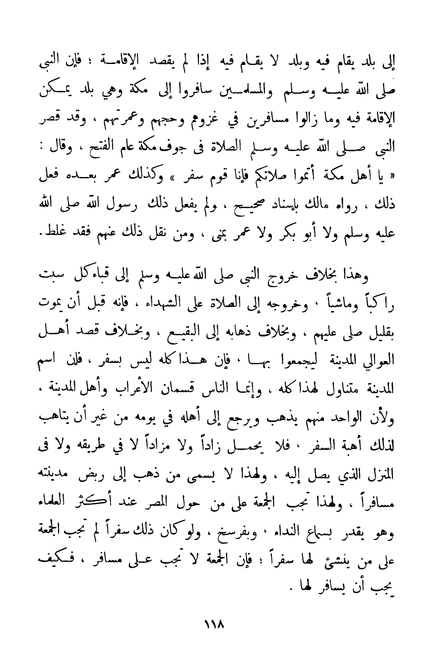 إلَى بَلَدٍ يُقَامُ فِيهِ وَبَلَدٍ لَا يُقَامُ فِيهِ إذَا لَمْ يَقْصِدْ الْإِقَامَةَ؛ فَإِنَّ النَّبِيَّ صَلَّى اللَّهُ عَلَيْهِ وَسَلَّمَ وَالْمُسْلِمِينَ سَافَرُوا إلَى مَكَّةَ وَهِيَ بَلَدٌ يُمْكِنُ الْإِقَامَةُ فِيهِ وَمَا زَالُوا مُسَافِرِينَ فِي غَزْوِهِمْ وَحَجِّهِمْ وَعُمْرَتِهِمْ وَقَدْ قَصَرَ النَّبِيُّ صَلَّى اللَّهُ عَلَيْهِ وَسَلَّمَ الصَّلَاةَ فِي جَوْفِ مَكَّةَ عَامَ الْفَتْحِ وَقَالَ: {يَا أَهْلَ مَكَّةَ أَتِمُّوا صَلَاتَكُمْ فَإِنَّا قَوْمٌ سَفَرٌ} وَكَذَلِكَ عُمَرُ بَعْدَهُ فَعَلَ ذَلِكَ رَوَاهُ مَالِكٌ بِإِسْنَادٍ صَحِيحٍ وَلَمْ يَفْعَلْ ذَلِكَ رَسُولُ اللَّهِ صَلَّى اللَّهُ عَلَيْهِ وَسَلَّمَ وَلَا أَبُو بَكْرٍ وَلَا عُمَرُ بِمِنَى وَمَنْ نَقَلَ ذَلِكَ عَنْهُمْ فَقَدْ غَلِطَ. وَهَذَا بِخِلَافِ خُرُوجِ النَّبِيِّ صَلَّى اللَّهُ عَلَيْهِ وَسَلَّمَ إلَى قُبَاء كُلَّ سَبْتٍ رَاكِبًا وَمَاشِيًا وَخُرُوجِهِ إلَى الصَّلَاةِ عَلَى الشُّهَدَاءِ فَإِنَّهُ قَبْلَ أَنْ يَمُوتَ بِقَلِيلٍ صَلَّى عَلَيْهِمْ وَبِخِلَافِ ذَهَابِهِ إلَى الْبَقِيعِ وَبِخِلَافِ قَصْدِ أَهْلِ الْعَوَالِي الْمَدِينَةَ لِيَجْمَعُوا بِهَا فَإِنَّ هَذَا كُلَّهُ لَيْسَ بِسَفَرِ فَإِنَّ اسْمَ الْمَدِينَةِ مُتَنَاوِلٌ لِهَذَا كُلِّهِ وَإِنَّمَا النَّاسُ قِسْمَانِ الْأَعْرَابُ وَأَهْلُ الْمَدِينَةِ وَلِأَنَّ الْوَاحِدَ مِنْهُمْ يَذْهَبُ وَيَرْجِعُ إلَى أَهْلِهِ فِي يَوْمِهِ مِنْ غَيْرِ أَنْ يَتَأَهَّبَ لِذَلِكَ أُهْبَةَ السَّفَرِ فَلَا يَحْمِلُ زَادًا وَلَا مَزَادًا لَا فِي طَرِيقِهِ وَلَا فِي الْمَنْزِلِ الَّذِي يَصِلُ إلَيْهِ وَلِهَذَا لَا يُسَمَّى مَنْ ذَهَبَ إلَى رُبَضِ مَدِينَتِهِ مُسَافِرًا وَلِهَذَا تَجِبُ الْجُمُعَةُ عَلَى مَنْ حَوْلَ الْمِصْرِ عِنْدَ أَكْثَرِ الْعُلَمَاءِ وَهُوَ يُقَدَّرُ بِسَمَاعِ النِّدَاءِ وَبِفَرْسَخِ وَلَوْ كَانَ ذَلِكَ سَفَرًا لَمْ تَجِبْ الْجُمُعَةُ عَلَى مَنْ يُنْشِئُ لَهَا سَفَرًا؛ فَإِنَّ الْجُمُعَةَ لَا تَجِبُ عَلَى مُسَافِرٍ فَكَيْفَ يَجِبُ أَنْ يُسَافِرَ لَهَا.