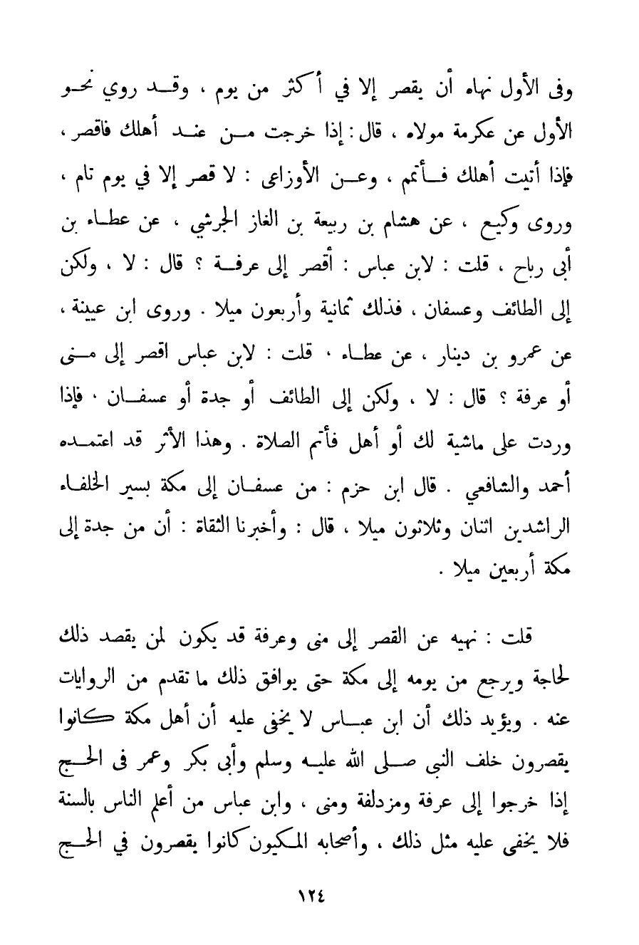 وَفِي الْأَوَّلِ نَهَاهُ أَنْ يَقْصُرَ إلَّا فِي أَكْثَرَ مِنْ يَوْمٍ وَقَدْ رُوِيَ نَحْوُ الْأَوَّلِ عَنْ عِكْرِمَةَ مَوْلَاهُ قَالَ: إذَا خَرَجْت مِنْ عِنْدِ أَهْلِك فَاقْصُرْ فَإِذَا أَتَيْت أَهْلَك فَأَتْمِمْ وَعَنْ الأوزاعي: لَا قَصْرَ إلَّا فِي يَوْمٍ تَامٍّ وَرَوَى وَكِيعٌ عَنْ هِشَامِ بْنِ رَبِيعَةَ بْنِ الْغَازِ الجرشي عَنْ عَطَاءِ بْنِ أَبَى رَبَاحٍ قُلْت: لِابْنِ عَبَّاسٍ: أَقْصُرُ إلَى عَرَفَةَ؟ قَالَ: لَا وَلَكِنْ إلَى الطَّائِفِ وعسفان فَذَلِكَ ثَمَانِيَةٌ وَأَرْبَعُونَ مِيلًا. وَرَوَى ابْنُ عُيَيْنَة عَنْ عَمْرِو بْنِ دِينَارٍ عَنْ عَطَاءٍ قُلْت: لِابْنِ عَبَّاسٍ أَقْصُرُ إلَى مِنًى أَوْ عَرَفَةَ؟ قَالَ: لَا وَلَكِنْ إلَى الطَّائِفِ أَوْ جُدَّةَ أَوْ عسفان فَإِذَا وَرَدْت عَلَى مَاشِيَةٍ لَك أَوْ أَهْلٍ فَأَتِمَّ الصَّلَاةَ. وَهَذَا الْأَثَرُ قَدْ اعْتَمَدَهُ أَحْمَد وَالشَّافِعِيُّ. قَالَ ابْنُ حَزْمٍ: مِنْ عسفان إلَى مَكَّةَ بِسَيْرِ الْخُلَفَاءِ الرَّاشِدِينَ اثْنَانِ وَثَلَاثُونَ مِيلًا قَالَ: وَأَخْبَرَنَا الثقاة: أَنَّ مِنْ جُدَّةَ إلَى مَكَّةَ أَرْبَعِينَ مِيلًا. قُلْت: نَهْيُهُ عَنْ الْقَصْرِ إلَى مِنًى وَعَرَفَةَ قَدْ يَكُونُ لِمَنْ يَقْصِدُ ذَلِكَ لِحَاجَةٍ وَيَرْجِعُ مِنْ يَوْمِهِ إلَى مَكَّةَ حَتَّى يُوَافِقَ ذَلِكَ مَا تَقَدَّمَ مِنْ الرِّوَايَاتِ عَنْهُ. وَيُؤَيِّدُ ذَلِكَ أَنَّ ابْنَ عَبَّاسٍ لَا يَخْفَى عَلَيْهِ أَنَّ أَهْلَ مَكَّةَ كَانُوا يَقْصُرُونَ خَلْفَ النَّبِيِّ صَلَّى اللَّهُ عَلَيْهِ وَسَلَّمَ وَأَبِي بَكْرٍ وَعُمَرَ فِي الْحَجِّ إذَا خَرَجُوا إلَى عَرَفَةَ وَمُزْدَلِفَةَ وَمِنًى وَابْنُ عَبَّاسٍ مِنْ أَعْلَمِ النَّاسِ بِالسُّنَّةِ فَلَا يَخْفَى عَلَيْهِ مِثْلُ ذَلِكَ وَأَصْحَابُهُ الْمَكِّيُّونَ كَانُوا يَقْصُرُونَ فِي الْحَجِّ