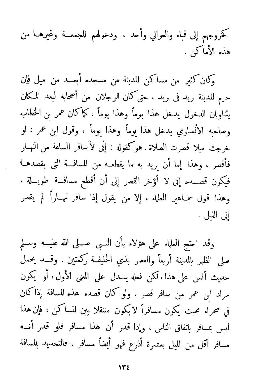 كَخُرُوجِهِمْ إلَى قُبَاء وَالْعَوَالِي وَأُحُدٍ وَدُخُولِهِمْ لِلْجُمُعَةِ وَغَيْرِهَا مِنْ هَذِهِ الْأَمَاكِنِ. وَكَانَ كَثِيرٌ مِنْ مَسَاكِنِ الْمَدِينَةِ عَنْ مَسْجِدِهِ أَبْعَدَ مِنْ مِيلٍ فَإِنَّ حَرَمَ الْمَدِينَةِ بَرِيدٌ فِي بَرِيدٍ حَتَّى كَانَ الرَّجُلَانِ مِنْ أَصْحَابِهِ لِبُعْدِ الْمَكَانِ يَتَنَاوَبَانِ الدُّخُولَ يَدْخُلُ هَذَا يَوْمًا وَهَذَا يَوْمًا كَمَا كَانَ عُمَرُ بْنُ الْخَطَّابِ وَصَاحِبُهُ الْأَنْصَارِيُّ يَدْخُلُ هَذَا يَوْمًا وَهَذَا يَوْمًا وَقَوْلُ ابْنِ عُمَرَ: لَوْ خَرَجْت مِيلًا قَصَرْت الصَّلَاةَ. هُوَ كَقَوْلِهِ: إنِّي لَأُسَافِرُ السَّاعَةَ مِنْ النَّهَارِ فَأَقْصُرُ وَهَذَا إمَّا أَنْ يُرِيدَ بِهِ مَا يَقْطَعُهُ مِنْ الْمَسَافَةِ الَّتِي يَقْصِدُهَا فَيَكُونُ قَصْدُهُ إنِّي لَا أُؤَخِّرُ الْقَصْرَ إلَى أَنْ أَقْطَعَ مَسَافَةً طَوِيلَةً وَهَذَا قَوْلُ جَمَاهِيرِ الْعُلَمَاءِ إلَّا مَنْ يَقُولُ إذَا سَافَرَ نَهَارًا لَمْ يَقْصُرْ إلَى اللَّيْلِ. وَقَدْ احْتَجَّ الْعُلَمَاءُ عَلَى هَؤُلَاءِ بِأَنَّ النَّبِيَّ صَلَّى اللَّهُ عَلَيْهِ وَسَلَّمَ صَلَّى الظُّهْرَ بِالْمَدِينَةِ أَرْبَعًا وَالْعَصْرَ بِذِي الحليفة رَكْعَتَيْنِ وَقَدْ يُحْمَلُ حَدِيثُ أَنَسٍ عَلَى هَذَا لَكِنَّ فِعْلَهُ يَدُلُّ عَلَى الْمَعْنَى الْأَوَّلِ أَوْ يَكُونُ مُرَادُ ابْنِ عُمَرَ مَنْ سَافَرَ قَصَرَ وَلَوْ كَانَ قَصْدُهُ هَذِهِ الْمَسَافَةَ إذَا كَانَ فِي صَحْرَاءَ بِحَيْثُ يَكُونُ مُسَافِرًا لَا يَكُونُ مُتَنَقِّلًا بَيْنَ الْمَسَاكِنِ؛ فَإِنَّ هَذَا لَيْسَ بِمُسَافِرٍ بِاتِّفَاقِ النَّاسِ وَإِذَا قُدِّرَ أَنَّ هَذَا مُسَافِرٌ فَلَوْ قُدِّرَ أَنَّهُ مُسَافِرٌ أَقَلَّ مِنْ الْمِيلِ بِعَشَرَةِ أَذْرُعٍ فَهُوَ أَيْضًا مُسَافِرٌ فَالتَّحْدِيدُ بِالْمَسَافَةِ