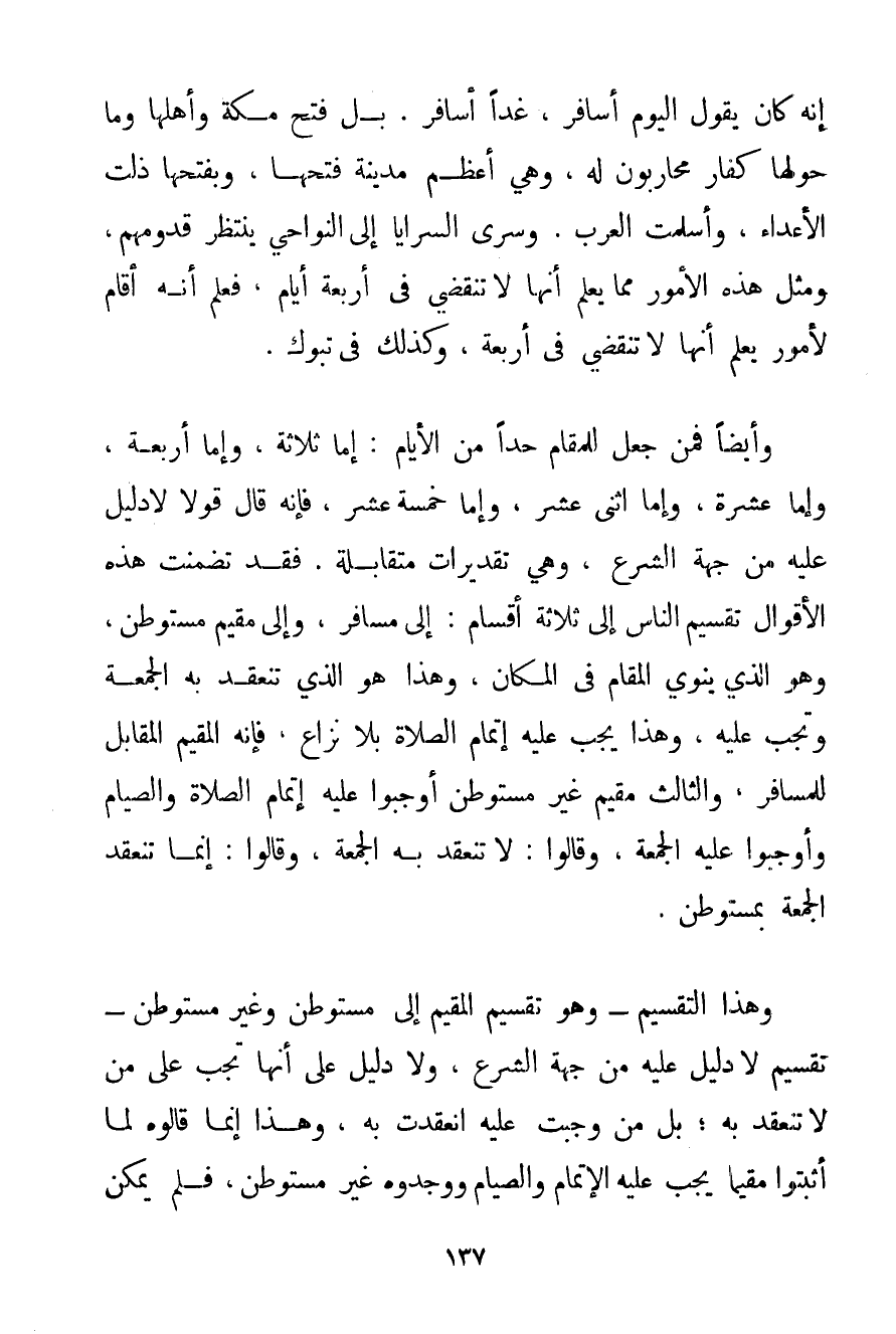 إنَّهُ كَانَ يَقُولُ الْيَوْمَ أُسَافِرُ غَدًا أُسَافِرُ. بَلْ فَتَحَ مَكَّةَ وَأَهْلُهَا وَمَا حَوْلَهَا كُفَّارٌ مُحَارِبُونَ لَهُ وَهِيَ أَعْظَمُ مَدِينَةٍ فَتَحَهَا وَبِفَتْحِهَا ذَلَّتْ الْأَعْدَاءُ وَأَسْلَمَتْ الْعَرَبُ. وَسَرَى السَّرَايَا إلَى النَّوَاحِي يَنْتَظِرُ قُدُومَهُمْ وَمِثْلُ هَذِهِ الْأُمُورِ مِمَّا يُعْلَمُ أَنَّهَا لَا تَنْقَضِي فِي أَرْبَعَةِ أَيَّامٍ فَعُلِمَ أَنَّهُ أَقَامَ لِأُمُورٍ يَعْلَمُ أَنَّهَا لَا تَنْقَضِي فِي أَرْبَعَةٍ وَكَذَلِكَ فِي تَبُوكَ. وَأَيْضًا فَمَنْ جَعَلَ لِلْمُقَامِ حَدًّا مِنْ الْأَيَّامِ: إمَّا ثَلَاثَةً وَإِمَّا أَرْبَعَةً وَإِمَّا عَشَرَةً وَإِمَّا اثْنَيْ عَشَرَ وَإِمَّا خَمْسَةَ عَشَرَ فَإِنَّهُ قَالَ قَوْلًا لَا دَلِيلَ عَلَيْهِ مِنْ جِهَةِ الشَّرْعِ وَهِيَ تَقْدِيرَاتٌ مُتَقَابِلَةٌ. فَقَدْ تَضَمَّنَتْ هَذِهِ الْأَقْوَالُ تَقْسِيمَ النَّاسِ إلَى ثَلَاثَةِ أَقْسَامٍ: إلَى مُسَافِرٍ وَإِلَى مُقِيمٍ مُسْتَوْطِنٍ وَهُوَ الَّذِي يَنْوِي الْمُقَامَ فِي الْمَكَانِ وَهَذَا هُوَ الَّذِي تَنْعَقِدُ بِهِ الْجُمُعَةُ وَتَجِبُ عَلَيْهِ وَهَذَا يَجِبُ عَلَيْهِ إتْمَامُ الصَّلَاةِ بِلَا نِزَاعٍ فَإِنَّهُ الْمُقِيمُ الْمُقَابِلُ لِلْمُسَافِرِ وَالثَّالِثُ مُقِيمٌ غَيْرُ مُسْتَوْطِنٍ أَوْجَبُوا عَلَيْهِ إتْمَامَ الصَّلَاةِ وَالصِّيَامِ وَأَوْجَبُوا عَلَيْهِ الْجُمُعَةَ وَقَالُوا: لَا تَنْعَقِدُ بِهِ الْجُمُعَةُ وَقَالُوا: إنَّمَا تَنْعَقِدُ الْجُمُعَةُ بِمُسْتَوْطِنِ. وَهَذَا التَّقْسِيمُ - وَهُوَ تَقْسِيمُ الْمُقِيمِ إلَى مُسْتَوْطِنٍ وَغَيْرِ مُسْتَوْطِنٍ - تَقْسِيمٌ لَا دَلِيلَ عَلَيْهِ مِنْ جِهَةِ الشَّرْعِ وَلَا دَلِيلَ عَلَى أَنَّهَا تَجِبُ عَلَى مَنْ لَا تَنْعَقِدُ بِهِ؛ بَلْ مَنْ وَجَبَتْ عَلَيْهِ انْعَقَدَتْ بِهِ وَهَذَا إنَّمَا قَالُوهُ لَمَّا أَثْبَتُوا مُقِيمًا يَجِبُ عَلَيْهِ الْإِتْمَامُ وَالصِّيَامُ وَوَجَدُوهُ غَيْرَ مُسْتَوْطِنٍ فَلَمْ يُمْكِنْ