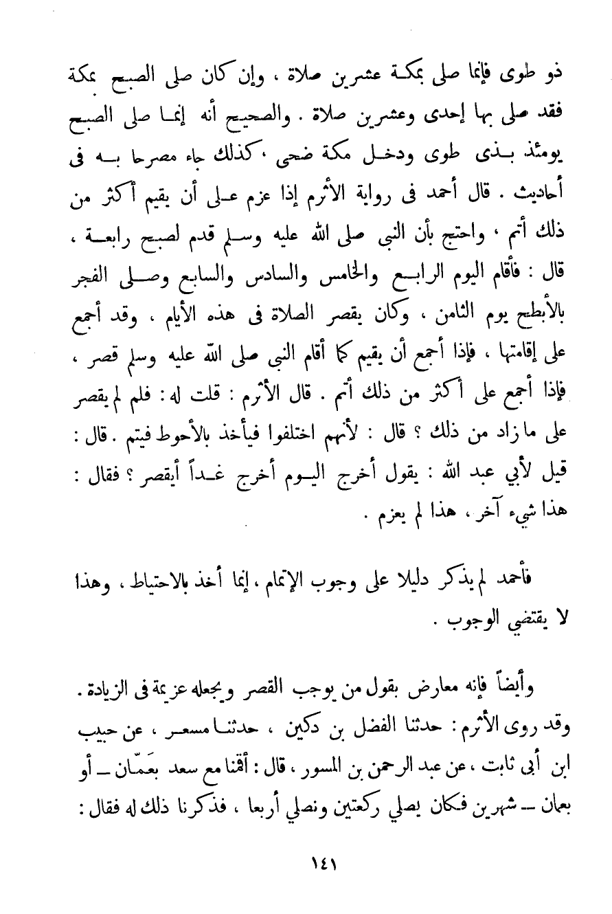 ذُو طُوًى فَإِنَّمَا صَلَّى بِمَكَّةَ عِشْرِينَ صَلَاةً وَإِنْ كَانَ صَلَّى الصُّبْحَ بِمَكَّةَ فَقَدْ صَلَّى بِهَا إحْدَى وَعِشْرِينَ صَلَاةً. وَالصَّحِيحُ أَنَّهُ إنَّمَا صَلَّى الصُّبْحَ يَوْمَئِذٍ بِذِي طُوًى وَدَخَلَ مَكَّةَ ضُحًى كَذَلِكَ جَاءَ مُصَرَّحًا بِهِ فِي أَحَادِيثَ. قَالَ أَحْمَد فِي رِوَايَةِ الْأَثْرَمِ إذَا عَزَمَ عَلَى أَنْ يُقِيمَ أَكْثَرَ مِنْ ذَلِكَ أَتَمَّ وَاحْتَجَّ بِأَنَّ النَّبِيَّ صَلَّى اللَّهُ عَلَيْهِ وَسَلَّمَ قَدِمَ لِصُبْحِ رَابِعَةٍ قَالَ: فَأَقَامَ الْيَوْمَ الرَّابِعَ وَالْخَامِسَ وَالسَّادِسَ وَالسَّابِعَ وَصَلَّى الْفَجْرَ بِالْأَبْطُحِ يَوْمَ الثَّامِنِ وَكَانَ يَقْصُرُ الصَّلَاةَ فِي هَذِهِ الْأَيَّامِ وَقَدْ أَجْمَعَ عَلَى إقَامَتِهَا فَإِذَا أَجْمَعَ أَنْ يُقِيمَ كَمَا أَقَامَ النَّبِيُّ صَلَّى اللَّهُ عَلَيْهِ وَسَلَّمَ قَصَرَ فَإِذَا أَجْمَعَ عَلَى أَكْثَرَ مِنْ ذَلِكَ أَتَمَّ. قَالَ الْأَثْرَمُ: قُلْت لَهُ: فَلِمَ لَمْ يَقْصُرْ عَلَى مَا زَادَ مِنْ ذَلِكَ؟ قَالَ: لِأَنَّهُمْ اخْتَلَفُوا فَيَأْخُذُ بِالْأَحْوَطِ فَيُتِمُّ. قَالَ: قِيلَ لِأَبِي عَبْدِ اللَّهِ: يَقُولُ أَخْرُجُ الْيَوْمَ أَخْرُجُ غَدًا أَيَقْصُرُ؟ فَقَالَ: هَذَا شَيْءٌ آخَرُ هَذَا لَمْ يَعْزِمْ. فَأَحْمَدُ لَمْ يَذْكُرْ دَلِيلًا عَلَى وُجُوبِ الْإِتْمَامِ إنَّمَا أَخَذَ بِالِاحْتِيَاطِ وَهَذَا لَا يَقْتَضِي الْوُجُوبَ. وَأَيْضًا فَإِنَّهُ مُعَارَضٌ بِقَوْلِ مَنْ يُوجِبُ الْقَصْرَ وَيَجْعَلُهُ عَزِيمَةً فِي الزِّيَادَةِ. وَقَدْ رَوَى الْأَثْرَمُ: حَدَّثَنَا الْفَضْلُ بْنُ دكين حَدَّثَنَا مِسْعَرٌ عَنْ حَبِيبِ ابْنِ أَبِي ثَابِتٍ عَنْ عَبْدِ الرَّحْمَنِ بْنِ الْمِسْوَرِ قَالَ: أَقَمْنَا مَعَ سَعْدٍ بِعُمَانَ - أَوْ بِعَمَّانَ - شَهْرَيْنِ فَكَانَ يُصَلِّي رَكْعَتَيْنِ وَنُصَلِّي أَرْبَعًا فَذَكَرْنَا ذَلِكَ لَهُ فَقَالَ:
