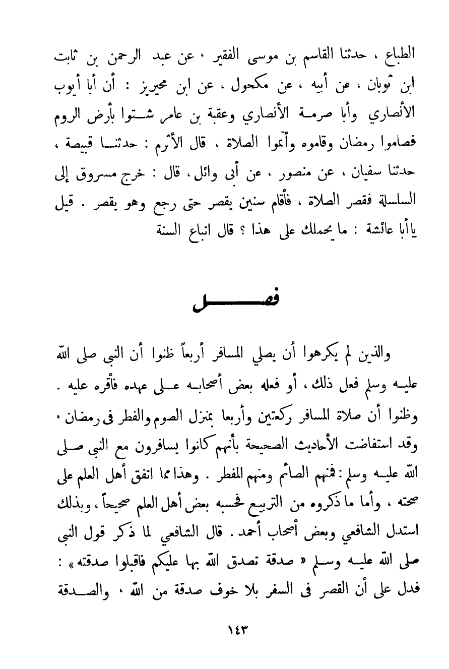 الطَّبَّاعِ حَدَّثَنَا الْقَاسِمُ بْنُ مُوسَى الْفَقِيرُ عَنْ عَبْدِ الرَّحْمَنِ بْنِ ثَابِتِ بْنِ ثوبان عَنْ أَبِيهِ عَنْ مَكْحُولٍ عَنْ ابْنِ محيريز: أَنَّ أَبَا أَيُّوبَ الْأَنْصَارِيَّ وَأَبَا صِرْمَةَ الْأَنْصَارِيَّ وَعَقَبَةَ بْنَ عَامِرٍ شَتَّوْا بِأَرْضِ الرُّومِ فَصَامُوا رَمَضَانَ وَقَامُوهُ وَأَتَمُّوا الصَّلَاةَ قَالَ الْأَثْرَمُ: حَدَّثَنَا قَبِيصَةُ حَدَّثَنَا سُفْيَانُ عَنْ مَنْصُورٍ عَنْ أَبِي وَائِلٍ قَالَ: خَرَجَ مَسْرُوقٌ إلَى السِّلْسِلَةِ فَقَصَرَ الصَّلَاةَ فَأَقَامَ سِنِينَ يَقْصُرُ حَتَّى رَجَعَ وَهُوَ يَقْصُرُ. قِيلَ يَا أَبَا عَائِشَةَ: مَا يَحْمِلُك عَلَى هَذَا؟ قَالَ: اتِّبَاعُ السُّنَّةِ.