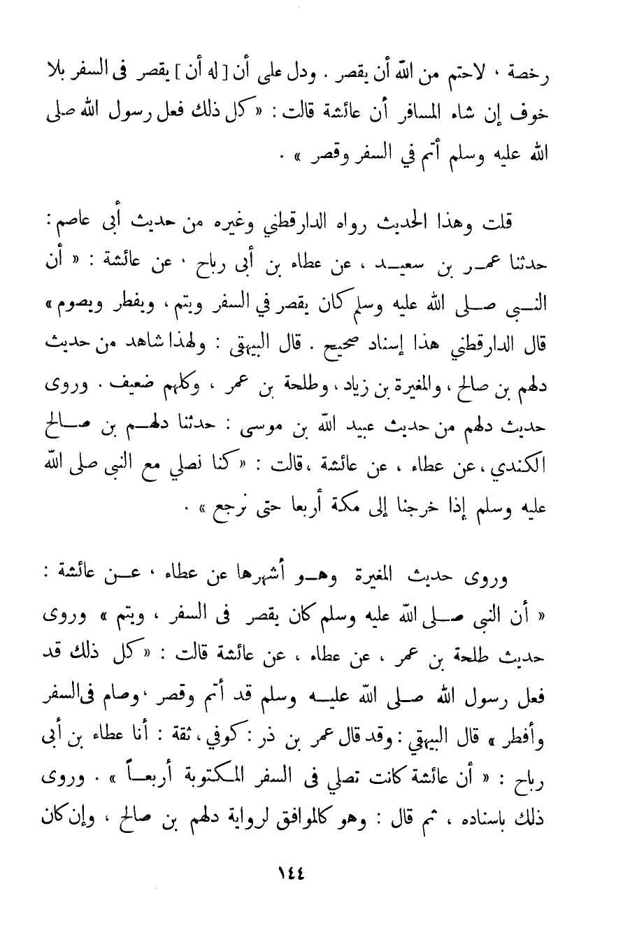رُخْصَةٌ لَا حَتْمٌ مِنْ اللَّهِ أَنْ يَقْصُرَ. وَدَلَّ عَلَى أَنَّ لَهُ أَنْ يَقْصُرَ فِي السَّفَرِ بِلَا خَوْفٍ إنْ شَاءَ الْمُسَافِرُ أَنَّ {عَائِشَةَ قَالَتْ: كُلُّ ذَلِكَ فَعَلَ رَسُولُ اللَّهِ صَلَّى اللَّهُ عَلَيْهِ وَسَلَّمَ أَتَمَّ فِي السَّفَرِ وَقَصَرَ.} قُلْت وَهَذَا الْحَدِيثُ رَوَاهُ الدارقطني وَغَيْرُهُ مِنْ حَدِيثِ أَبِي عَاصِمٍ: حَدَّثَنَا عُمَرُ بْنُ سَعِيدٍ عَنْ عَطَاءِ بْنِ أَبِي رَبَاحٍ عَنْ عَائِشَةَ: " {أَنَّ النَّبِيَّ صَلَّى اللَّهُ عَلَيْهِ وَسَلَّمَ كَانَ يَقْصُرُ فِي السَّفَرِ وَيُتِمُّ وَيُفْطِرُ وَيَصُومُ} قَالَ الدارقطني هَذَا إسْنَادٌ صَحِيحٌ. قَالَ البيهقي: وَلِهَذَا شَاهِدٌ مِنْ حَدِيثِ دلهم بْنِ صَالِحٍ وَالْمُغِيرَةِ بْنِ زِيَادٍ وَطَلْحَةَ بْنِ عُمَرَ وَكُلُّهُمْ ضَعِيفٌ. وَرَوَى حَدِيثَ دلهم مِنْ حَدِيثِ عُبَيْدِ اللَّهِ بْنِ مُوسَى: حَدَّثَنَا دلهم بْنُ صَالِحٍ الْكِنْدِيُّ عَنْ عَطَاءٍ عَنْ {عَائِشَةَ قَالَتْ: كُنَّا نُصَلِّي مَعَ النَّبِيِّ صَلَّى اللَّهُ عَلَيْهِ وَسَلَّمَ إذَا خَرَجْنَا إلَى مَكَّةَ أَرْبَعًا حَتَّى نَرْجِعَ} . وَرَوَى حَدِيثَ الْمُغِيرَةِ وَهُوَ أَشْهَرُهَا عَنْ عَطَاءٍ عَنْ عَائِشَةَ: {أَنَّ النَّبِيَّ صَلَّى اللَّهُ عَلَيْهِ وَسَلَّمَ كَانَ يَقْصُرُ فِي السَّفَرِ وَيُتِمُّ} وَرَوَى حَدِيثَ طَلْحَةَ بْنِ عُمَرَ عَنْ عَطَاءٍ عَنْ {عَائِشَةَ قَالَتْ: كُلُّ ذَلِكَ قَدْ فَعَلَ رَسُولُ اللَّهِ صَلَّى اللَّهُ عَلَيْهِ وَسَلَّمَ قَدْ أَتَمَّ وَقَصَرَ وَصَامَ فِي السَّفَرِ وَأَفْطَرَ} قَالَ البيهقي: وَقَدْ قَالَ عُمَرُ بْنُ ذَرٍّ: كُوفِيٌّ ثِقَةٌ: أَنَا عَطَاءُ بْنُ أَبِي رَبَاحٍ: " أَنَّ عَائِشَةَ كَانَتْ تُصَلِّي فِي السَّفَرِ الْمَكْتُوبَةَ أَرْبَعًا " وَرَوَى ذَلِكَ بِإِسْنَادِهِ ثُمَّ قَالَ: وَهُوَ كَالْمُوَافِقِ لِرِوَايَةِ دلهم بْنِ صَالِحٍ وَإِنْ كَانَ