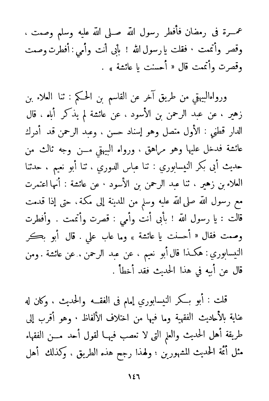 رَمَضَانَ فَأَفْطَرَ رَسُولُ اللَّهِ صَلَّى اللَّهُ عَلَيْهِ وَسَلَّمَ وَصُمْت وَقَصَرَ وَأَتْمَمْت فَقُلْت يَا رَسُول اللَّهِ بِأَبِي أَنْتَ وَأُمِّي: أَفْطَرْت وَصُمْت وَقَصَرْت وَأَتْمَمْت قَالَ أَحْسَنْت يَا عَائِشَةُ.} وَرَوَاهُ البيهقي مِنْ طَرِيقٍ آخَرَ عَنْ الْقَاسِمِ بْنِ الْحَكَمِ: ثَنَا الْعَلَاءُ بْنُ زُهَيْرٍ عَنْ عَبْدِ الرَّحْمَنِ بْنِ الْأَسْوَدِ عَنْ عَائِشَةَ لَمْ يَذْكُرْ أَبَاهُ قَالَ الدارقطني: الْأَوَّلُ مُتَّصِلٌ وَهُوَ إسْنَادٌ حَسَنٌ وَعَبْدُ الرَّحْمَنِ قَدْ أَدْرَكَ عَائِشَةَ فَدَخَلَ عَلَيْهَا وَهُوَ مُرَاهِقٌ وَرَوَاهُ البيهقي مِنْ وَجْهٍ ثَالِثٍ مِنْ حَدِيثِ أَبِي بَكْرٍ النَّيْسَابُورِيِّ: ثَنَا عَبَّاسٌ الدُّورِيُّ ثَنَا أَبُو نُعَيْمٍ حَدَّثَنَا الْعَلَاءُ بْنُ زُهَيْرٍ ثَنَا عَبْدُ الرَّحْمَنِ بْنُ الْأَسْوَدِ عَنْ {عَائِشَةَ: أَنَّهَا اعْتَمَرَتْ مَعَ رَسُولِ اللَّهِ صَلَّى اللَّهُ عَلَيْهِ وَسَلَّمَ مِنْ الْمَدِينَةِ إلَى مَكَّةَ حَتَّى إذَا قَدِمَتْ قَالَتْ: يَا رَسُولَ اللَّهِ بِأَبِي أَنْتَ وَأُمِّي: قَصَرْت وَأَتْمَمْت. وَأَفْطَرْت وَصُمْت فَقَالَ أَحْسَنْت يَا عَائِشَةُ وَمَا عَابَ عَلَيَّ} . قَالَ أَبُو بَكْرٍ النَّيْسَابُورِيُّ: هَكَذَا قَالَ أَبُو نُعَيْمٍ عَنْ عَبْدِ الرَّحْمَنِ عَنْ عَائِشَةَ. وَمَنْ قَالَ عَنْ أَبِيهِ فِي هَذَا الْحَدِيثِ فَقَدْ أَخْطَأَ. قُلْت: أَبُو بَكْرٍ النَّيْسَابُورِيُّ إمَامٌ فِي الْفِقْهِ وَالْحَدِيثِ وَكَانَ لَهُ عِنَايَةٌ بِالْأَحَادِيثِ الْفِقْهِيَّةِ وَمَا فِيهَا مِنْ اخْتِلَافِ الْأَلْفَاظِ وَهُوَ أَقْرَبُ إلَى طَرِيقَة أَهْلِ الْحَدِيثِ وَالْعِلْمِ الَّتِي لَا تَعَصُّبَ فِيهَا لِقَوْلِ أَحَدٍ مِنْ الْفُقَهَاءِ مِثْلَ أَئِمَّةِ الْحَدِيثِ الْمَشْهُورِينَ؛ وَلِهَذَا رَجَّحَ هَذِهِ الطَّرِيقَ وَكَذَلِكَ أَهْلُ