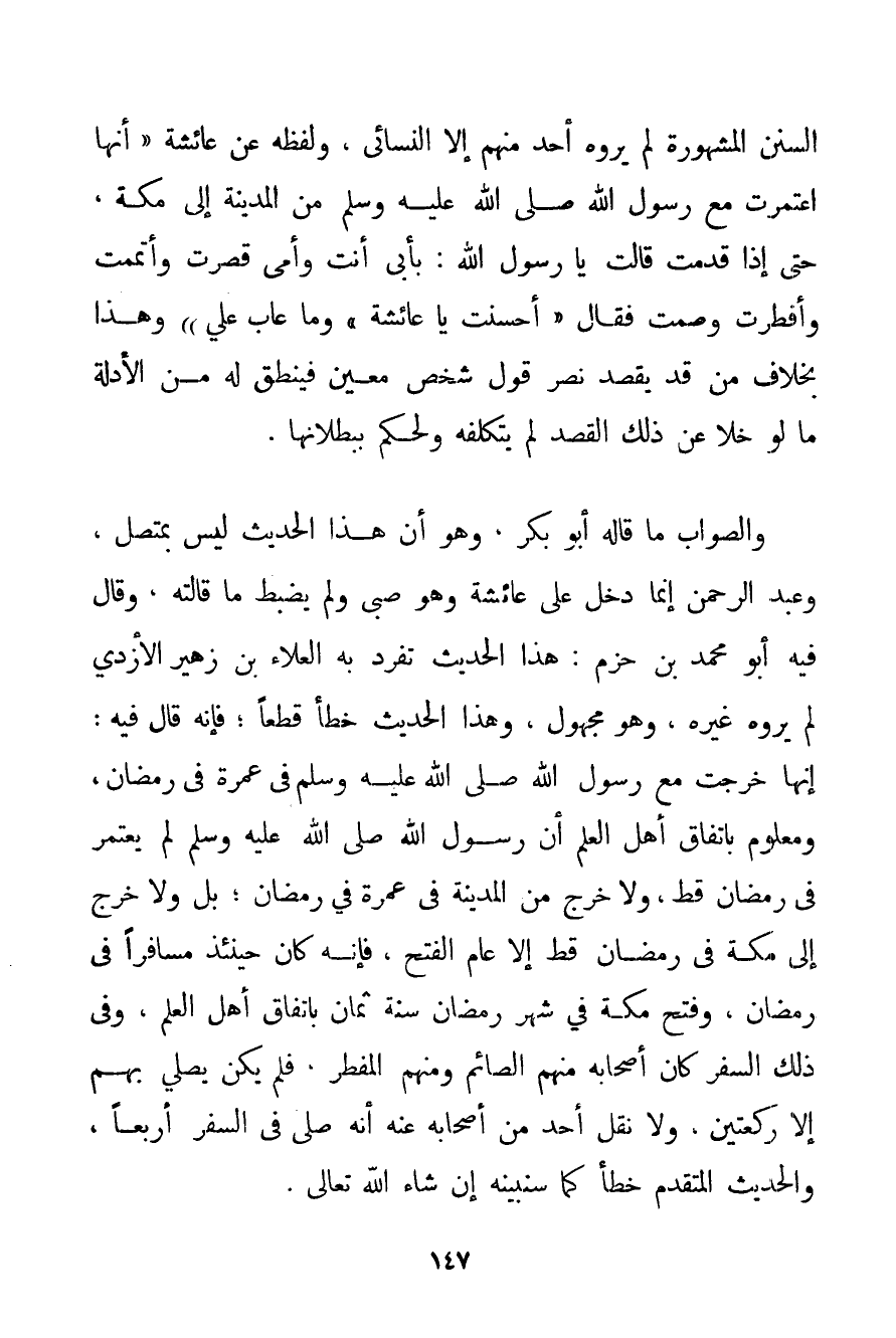 السُّنَنِ الْمَشْهُورَةِ لَمْ يَرْوِهِ أَحَدٌ مِنْهُمْ إلَّا النَّسَائِي وَلَفْظُهُ عَنْ {عَائِشَةَ أَنَّهَا اعْتَمَرَتْ مَعَ رَسُولِ اللَّهِ صَلَّى اللَّهُ عَلَيْهِ وَسَلَّمَ مِنْ الْمَدِينَةِ إلَى مَكَّةَ حَتَّى إذَا قَدِمَتْ قَالَتْ يَا رَسُولَ اللَّهِ: بِأَبِي أَنْتَ وَأُمِّي قَصَرْت وَأَتْمَمْت وَأَفْطَرْت وَصُمْت فَقَالَ أَحْسَنْت يَا عَائِشَةُ وَمَا عَابَ عَلَيَّ} وَهَذَا بِخِلَافِ مَنْ قَدْ يَقْصِدُ نَصْرَ قَوْلِ شَخْصٍ مُعَيَّنٍ فَيَنْطِقُ لَهُ مِنْ الْأَدِلَّةِ مَا لَوْ خَلَا عَنْ ذَلِكَ الْقَصْدِ لَمْ يَتَكَلَّفْهُ وَلَحَكَمَ بِبُطْلَانِهَا. وَالصَّوَابُ مَا قَالَهُ أَبُو بَكْرٍ وَهُوَ أَنَّ هَذَا الْحَدِيثَ لَيْسَ بِمُتَّصِلِ وَعَبْدُ الرَّحْمَنِ إنَّمَا دَخَلَ عَلَى عَائِشَةَ وَهُوَ صَبِيٌّ وَلَمْ يَضْبِطْ مَا قَالَتْهُ وَقَالَ فِيهِ أَبُو مُحَمَّدٍ بْنُ حَزْمٍ: هَذَا الْحَدِيثُ تَفَرَّدَ بِهِ الْعَلَاءُ بْنُ زُهَيْرٍ الأزدي لَمْ يَرْوِهِ غَيْرُهُ وَهُوَ مَجْهُولٌ وَهَذَا الْحَدِيثُ خَطَأٌ قَطْعًا؛ فَإِنَّهُ قَالَ فِيهِ: إنَّهَا خَرَجَتْ مَعَ رَسُولِ اللَّهِ صَلَّى اللَّهُ عَلَيْهِ وَسَلَّمَ فِي عُمْرَةٍ فِي رَمَضَانَ وَمَعْلُومٌ بِاتِّفَاقِ أَهْلِ الْعِلْمِ أَنَّ رَسُولَ اللَّهِ صَلَّى اللَّهُ عَلَيْهِ وَسَلَّمَ لَمْ يَعْتَمِرْ فِي رَمَضَانَ قَطُّ وَلَا خَرَجَ مِنْ الْمَدِينَةِ فِي عُمْرَةٍ فِي رَمَضَانَ؛ بَلْ وَلَا خَرَجَ إلَى مَكَّةَ فِي رَمَضَانَ قَطُّ إلَّا عَامَ الْفَتْحِ فَإِنَّهُ كَانَ حِينَئِذٍ مُسَافِرًا فِي رَمَضَانَ وَفَتَحَ مَكَّةَ فِي شَهْرِ رَمَضَانَ سَنَةَ ثَمَانٍ بِاتِّفَاقِ أَهْلِ الْعِلْمِ وَفِي ذَلِكَ السَّفَرِ كَانَ أَصْحَابُهُ مِنْهُمْ الصَّائِمُ وَمِنْهُمْ الْمُفْطِرُ فَلَمْ يَكُنْ يُصَلِّي بِهِمْ إلَّا رَكْعَتَيْنِ وَلَا نَقَلَ أَحَدٌ مِنْ أَصْحَابِهِ عَنْهُ أَنَّهُ صَلَّى فِي السَّفَرِ أَرْبَعًا وَالْحَدِيثُ الْمُتَقَدِّمُ خَطَأٌ كَمَا سَنُبَيِّنُهُ إنْ شَاءَ اللَّهُ تَعَالَى.