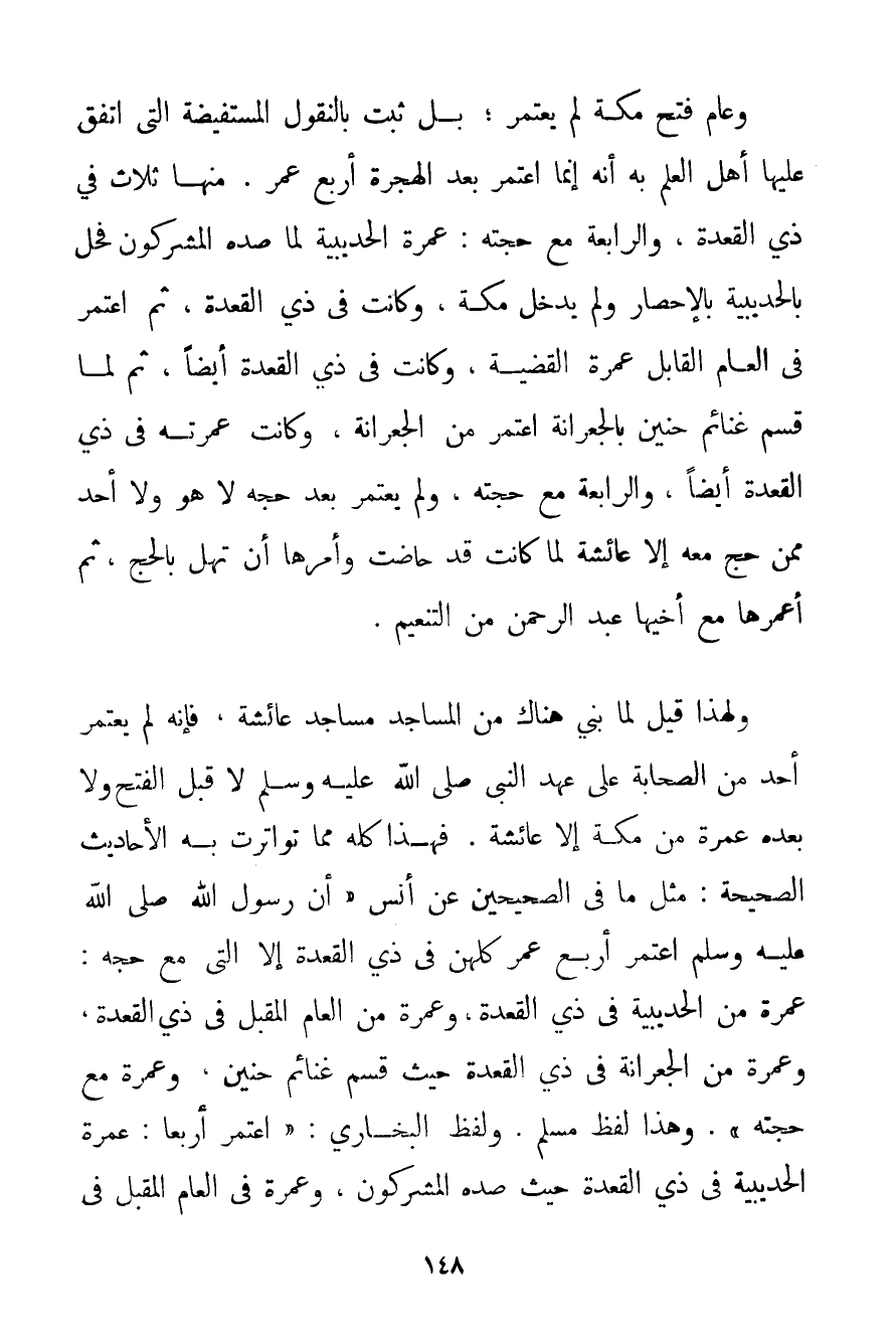 وَعَامَ فَتْحِ مَكَّةَ لَمْ يَعْتَمِرْ؛ بَلْ ثَبَتَ بِالنُّقُولِ الْمُسْتَفِيضَةِ الَّتِي اتَّفَقَ عَلَيْهَا أَهْلُ الْعِلْمِ بِهِ أَنَّهُ إنَّمَا اعْتَمَرَ بَعْدَ الْهِجْرَةِ أَرْبَعَ عُمَرٍ. مِنْهَا ثَلَاثٌ فِي ذِي الْقَعْدَةِ وَالرَّابِعَةُ مَعَ حَجَّتِهِ: عُمْرَةُ الْحُدَيْبِيَةِ لَمَّا صَدَّهُ الْمُشْرِكُونَ فَحَلَّ بِالْحُدَيْبِيَةِ بِالْإِحْصَارِ وَلَمْ يَدْخُلْ مَكَّةَ وَكَانَتْ فِي ذِي الْقَعْدَةِ ثُمَّ اعْتَمَرَ فِي الْعَامِ الْقَابِلِ عُمْرَةَ الْقَضِيَّةِ وَكَانَتْ فِي ذِي الْقَعْدَةِ أَيْضًا ثُمَّ لَمَّا قَسَّمَ غَنَائِمَ حنين بِالْجِعْرَانَةِ اعْتَمَرَ مِنْ الْجِعْرَانَةِ وَكَانَتْ عُمْرَتُهُ فِي ذِي الْقَعْدَةِ أَيْضًا وَالرَّابِعَةُ مَعَ حَجَّتِهِ وَلَمْ يَعْتَمِرْ بَعْدَ حَجِّهِ لَا هُوَ وَلَا أَحَدٌ مِمَّنْ حَجَّ مَعَهُ إلَّا عَائِشَةُ لَمَّا كَانَتْ قَدْ حَاضَتْ وَأَمَرَهَا أَنْ تُهِلَّ بِالْحَجِّ ثُمَّ أَعْمَرَهَا مَعَ أَخِيهَا عَبْدِ الرَّحْمَنِ مِنْ التَّنْعِيمِ. وَلِهَذَا قِيلَ لَمَّا بُنِيَ هُنَاكَ مِنْ الْمَسَاجِدِ مَسَاجِدُ عَائِشَةَ فَإِنَّهُ لَمْ يَعْتَمِرْ أَحَدٌ مِنْ الصَّحَابَةِ عَلَى عَهْدِ النَّبِيِّ صَلَّى اللَّهُ عَلَيْهِ وَسَلَّمَ لَا قَبْلَ الْفَتْحِ وَلَا بَعْدَهُ عُمْرَةً مِنْ مَكَّةَ إلَّا عَائِشَةُ. فَهَذَا كُلُّهُ مِمَّا تَوَاتَرَتْ بِهِ الْأَحَادِيثُ الصَّحِيحَةُ: مِثْلُ مَا فِي الصَّحِيحَيْنِ عَنْ أَنَسٍ {أَنَّ رَسُولَ اللَّهِ صَلَّى اللَّهُ عَلَيْهِ وَسَلَّمَ اعْتَمَرَ أَرْبَعَ عُمَرٍ كُلُّهُنَّ فِي ذِي الْقَعْدَةِ إلَّا الَّتِي مَعَ حَجِّهِ: عُمْرَةٌ مِنْ الْحُدَيْبِيَة فِي ذِي الْقَعْدَةِ وَعُمْرَةٌ مِنْ الْعَامِ الْمُقْبِلِ فِي ذِي الْقَعْدَةِ وَعُمْرَةٌ مِنْ الْجِعْرَانَةِ فِي ذِي الْقَعْدَةِ حَيْثُ قَسَّمَ غَنَائِمَ حنين وَعُمْرَةٌ مَعَ حَجَّتِهِ} . وَهَذَا لَفْظُ مُسْلِمٍ. وَلَفْظُ الْبُخَارِيِّ {: اعْتَمَرَ أَرْبَعًا: عُمْرَةُ الْحُدَيْبِيَة فِي ذِي الْقَعْدَةِ حَيْثُ صَدَّهُ الْمُشْرِكُونَ وَعُمْرَةٌ فِي الْعَامِ الْمُقْبِلِ فِي
