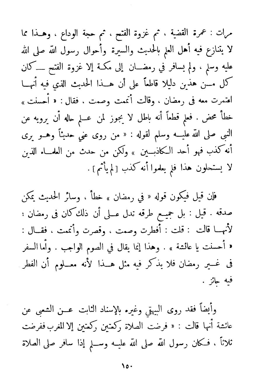 (فَعُلِمَ قَطْعًا أَنَّهُ بَاطِلٌ لَا يَجُوزُ لِمَنْ عُلِمَ حَالُهُ أَنْ يَرْوِيَهُ عَنْ النَّبِيِّ صَلَّى اللَّهُ عَلَيْهِ وَسَلَّمَ لِقَوْلِهِ: {مَنْ رَوَى عَنِّي حَدِيثًا وَهُوَ يَرَى أَنَّهُ كَذِبٌ فَهُوَ أَحَدُ الْكَاذِبِينَ} وَلَكِنْ مَنْ حَدَّثَ مِنْ الْعُلَمَاءِ الَّذِينَ لَا يَسْتَحِلُّونَ هَذَا فَلَمْ يَعْلَمُوا أَنَّهُ كَذِبٌ [لَمْ يَأْثَمْ] ) (*) . فَإِنْ قِيلَ فَيَكُونُ قَوْلُهُ " فِي رَمَضَانَ " خَطَأٌ وَسَائِرُ الْحَدِيثِ يُمْكِنُ صِدْقُهُ. قِيلَ: بَلْ جَمِيعُ طُرُقِهِ تَدُلُّ عَلَى أَنَّ ذَلِكَ كَانَ فِي رَمَضَانَ؛ لِأَنَّهَا قَالَتْ: قُلْت: أَفْطَرْت وَصُمْت وَقَصَرْت وَأَتْمَمْت فَقَالَ: " أَحْسَنْت يَا عَائِشَةُ ". وَهَذَا إنَّمَا يُقَالُ فِي الصَّوْمِ الْوَاجِبِ. وَأَمَّا السَّفَرُ فِي غَيْرِ رَمَضَانَ فَلَا يُذْكَرُ فِيهِ مِثْلُ هَذَا لِأَنَّهُ مَعْلُومٌ أَنَّ الْفِطْرَ فِيهِ جَائِزٌ. وَأَيْضًا فَقَدْ رَوَى البيهقي وَغَيْرُهُ بِالْإِسْنَادِ الثَّابِتِ عَنْ الشَّعْبِيِّ عَنْ {عَائِشَةَ أَنَّهَا قَالَتْ: فُرِضَتْ الصَّلَاةُ رَكْعَتَيْنِ رَكْعَتَيْنِ إلَّا الْمَغْرِبَ فَفُرِضَتْ ثَلَاثًا فَكَانَ رَسُولُ اللَّهِ صَلَّى اللَّهُ عَلَيْهِ وَسَلَّمَ إذَا سَافَرَ صَلَّى الصَّلَاةَ