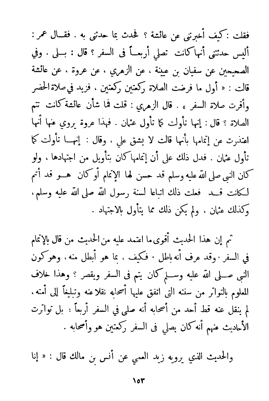 فَقُلْت: كَيْفَ أَخْبَرْتنِي عَنْ عَائِشَةَ؟ فَحَدَّثَ بِمَا حَدَّثَنِي بِهِ. فَقَالَ عُمَرُ: أَلَيْسَ حَدَّثْتنِي أَنَّهَا كَانَتْ تُصَلِّي أَرْبَعًا فِي السَّفَرِ؟ قَالَ: بَلَى} . وَفِي الصَّحِيحَيْنِ عَنْ سُفْيَانَ بْنِ عُيَيْنَة عَنْ الزُّهْرِيِّ عَنْ عُرْوَةَ عَنْ عَائِشَةَ قَالَتْ: " أَوَّلُ مَا فُرِضَتْ الصَّلَاةُ رَكْعَتَيْنِ رَكْعَتَيْنِ فَزِيدَ فِي صَلَاةِ الْحَضَرِ وَأُقِرَّتْ صَلَاةُ السَّفَرِ ". قَالَ الزُّهْرِيُّ: قُلْت فَمَا شَأْنُ عَائِشَةَ كَانَتْ تُتِمُّ الصَّلَاةَ؟ قَالَ: إنَّهَا تَأَوَّلَتْ كَمَا تَأَوَّلَ عُثْمَانُ. فَهَذَا عُرْوَةُ يَرْوِي عَنْهَا أَنَّهَا اعْتَذَرَتْ عَنْ إتْمَامِهَا بِأَنَّهَا قَالَتْ لَا يَشُقُّ عَلَيَّ وَقَالَ: إنَّهَا تَأَوَّلَتْ كَمَا تَأَوَّلَ عُثْمَانُ. فَدَلَّ ذَلِكَ عَلَى أَنَّ إتْمَامَهَا كَانَ بِتَأْوِيلٍ مِنْ اجْتِهَادِهَا وَلَوْ كَانَ النَّبِيُّ صَلَّى اللَّهُ عَلَيْهِ وَسَلَّمَ قَدْ حَسَّنَ لَهَا الْإِتْمَامَ أَوْ كَانَ هُوَ قَدْ أَتَمَّ لَكَانَتْ قَدْ فَعَلَتْ ذَلِكَ اتِّبَاعًا لِسُنَّةِ رَسُولِ اللَّهِ صَلَّى اللَّهُ عَلَيْهِ وَسَلَّمَ وَكَذَلِكَ عُثْمَانُ وَلَمْ يَكُنْ ذَلِكَ مِمَّا يُتَأَوَّلُ بِالِاجْتِهَادِ. ثُمَّ إنَّ هَذَا الْحَدِيثَ أَقْوَى مَا اُعْتُمِدَ عَلَيْهِ مِنْ الْحَدِيثِ مَنْ قَالَ بِالْإِتْمَامِ فِي السَّفَرِ وَقَدْ عُرِفَ أَنَّهُ بَاطِلٌ فَكَيْفَ بِمَا هُوَ أَبْطَلُ مِنْهُ وَهُوَ كَوْنُ النَّبِيِّ صَلَّى اللَّهُ عَلَيْهِ وَسَلَّمَ كَانَ يُتِمُّ فِي السَّفَرِ وَيَقْصُرُ؟ وَهَذَا خِلَافُ الْمَعْلُومِ بِالتَّوَاتُرِ مِنْ سُنَّتِهِ الَّتِي اتَّفَقَ عَلَيْهَا أَصْحَابُهُ نَقْلًا عَنْهُ وَتَبْلِيغًا إلَى أُمَّتِهِ لَمْ يَنْقُلْ عَنْهُ قَطُّ أَحَدٌ مِنْ أَصْحَابِهِ أَنَّهُ صَلَّى فِي السَّفَرِ أَرْبَعًا؛ بَلْ تَوَاتَرَتْ الْأَحَادِيثُ عَنْهُمْ أَنَّهُ كَانَ يُصَلِّي فِي السَّفَرِ رَكْعَتَيْنِ هُوَ وَأَصْحَابُهُ. وَالْحَدِيثُ الَّذِي يَرْوِيهِ زَيْدٌ العمي عَنْ أَنَسِ بْنِ مَالِكٍ قَالَ: " إنَّا