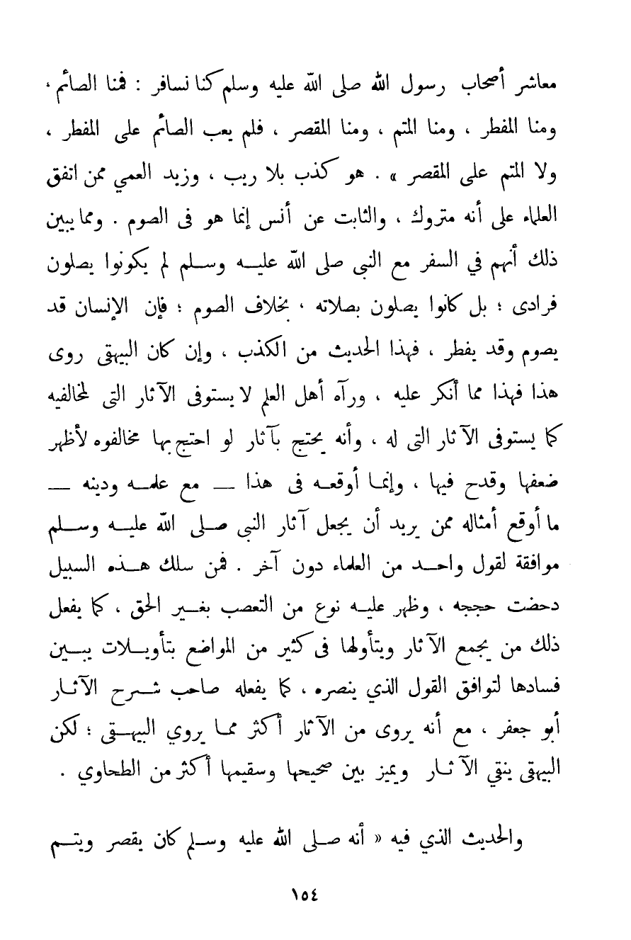 مَعَاشِرَ أَصْحَابِ رَسُولِ اللَّهِ صَلَّى اللَّهُ عَلَيْهِ وَسَلَّمَ كُنَّا نُسَافِرُ: فَمِنَّا الصَّائِمُ وَمِنَّا الْمُفْطِرُ وَمِنَّا الْمُتِمُّ وَمِنَّا الْمُقْصِرُ فَلَمْ يَعِبْ الصَّائِمُ عَلَى الْمُفْطِرِ وَلَا الْمُتِمُّ عَلَى الْمُقْصِرِ ". هُوَ كَذِبٌ بِلَا رَيْبٍ وَزَيْدٌ العمي مِمَّنْ اتَّفَقَ الْعُلَمَاءُ عَلَى أَنَّهُ مَتْرُوكٌ وَالثَّابِتُ عَنْ أَنَسٍ إنَّمَا هُوَ فِي الصَّوْمِ. وَمِمَّا يُبَيِّنُ ذَلِكَ أَنَّهُمْ فِي السَّفَرِ مَعَ النَّبِيِّ صَلَّى اللَّهُ عَلَيْهِ وَسَلَّمَ لَمْ يَكُونُوا يُصَلُّونَ فُرَادَى؛ بَلْ كَانُوا يُصَلُّونَ بِصَلَاتِهِ بِخِلَافِ الصَّوْمِ؛ فَإِنَّ الْإِنْسَانَ قَدْ يَصُومُ وَقَدْ يُفْطِرُ فَهَذَا الْحَدِيثُ مِنْ الْكَذِبِ وَإِنْ كَانَ البيهقي رَوَى هَذَا فَهَذَا مِمَّا أُنْكِرَ عَلَيْهِ وَرَآهُ أَهْلُ الْعِلْمِ لَا يَسْتَوْفِي الْآثَارَ الَّتِي لِمُخَالِفِيهِ كَمَا يَسْتَوْفِي الْآثَارَ الَّتِي لَهُ وَأَنَّهُ يَحْتَجُّ بِآثَارٍ لَوْ احْتَجَّ بِهَا مُخَالِفُوهُ لَأَظْهَرَ ضَعْفَهَا وَقَدَحَ فِيهَا وَإِنَّمَا أَوْقَعَهُ فِي هَذَا - مَعَ عِلْمِهِ وَدِينِهِ - مَا أَوْقَعَ أَمْثَالَهُ مِمَّنْ يُرِيدُ أَنْ يَجْعَلَ آثَارَ النَّبِيِّ صَلَّى اللَّهُ عَلَيْهِ وَسَلَّمَ مُوَافِقَةً لِقَوْلِ وَاحِدٍ مِنْ الْعُلَمَاءِ دُونَ آخَرَ. فَمَنْ سَلَكَ هَذِهِ السَّبِيلَ دُحِضَتْ حُجَجُهُ وَظَهَرَ عَلَيْهِ نَوْعٌ مِنْ التَّعَصُّبِ بِغَيْرِ الْحَقِّ كَمَا يَفْعَلُ ذَلِكَ مَنْ يَجْمَعُ الْآثَارَ وَيَتَأَوَّلُهَا فِي كَثِيرٍ مِنْ الْمَوَاضِعِ بِتَأْوِيلَاتٍ يُبَيِّنُ فَسَادَهَا لِتُوَافِقَ الْقَوْلَ الَّذِي يَنْصُرُهُ كَمَا يَفْعَلُهُ صَاحِبُ شَرْحِ الْآثَارِ أَبُو جَعْفَرٍ مَعَ أَنَّهُ يَرْوِي مِنْ الْآثَارِ أَكْثَرَ مِمَّا يَرْوِي البيهقي؛ لَكِنَّ البيهقي يُنَقِّي الْآثَارَ وَيُمَيِّزُ بَيْنَ صَحِيحِهَا وَسَقِيمِهَا أَكْثَرَ مِنْ الطَّحَاوِي. وَالْحَدِيثُ الَّذِي فِيهِ {أَنَّهُ صَلَّى اللَّهُ عَلَيْهِ وَسَلَّمَ كَانَ يَقْصُرُ وَيُتِمُّ