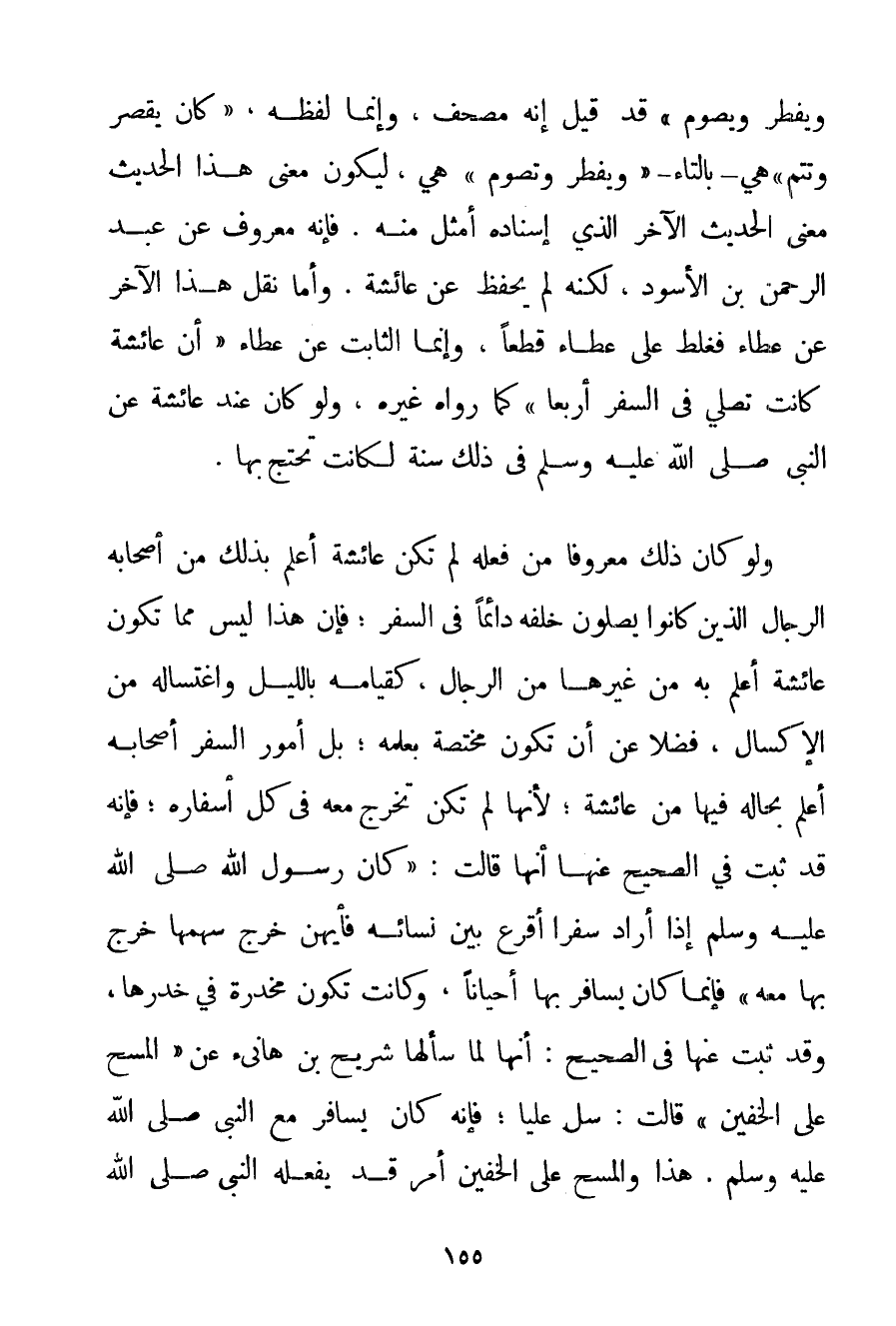 وَيُفْطِرُ وَيَصُومُ} قَدْ قِيلَ إنَّهُ مُصَحَّفٌ وَإِنَّمَا لَفْظُهُ " كَانَ يَقْصُرُ وَتُتِمُّ " هِيَ - بِالتَّاءِ - " وَيُفْطِرُ وَتَصُومُ " هِيَ لِيَكُونَ مَعْنَى هَذَا الْحَدِيثِ مَعْنَى الْحَدِيثِ الْآخَرِ الَّذِي إسْنَادُهُ أَمْثَلُ مِنْهُ. فَإِنَّهُ مَعْرُوفٌ عَنْ عَبْدِ الرَّحْمَنِ بْنِ الْأَسْوَدِ لَكِنَّهُ لَمْ يُحْفَظْ عَنْ عَائِشَةَ. وَأَمَّا نَقْلُ هَذَا الْآخَرِ عَنْ عَطَاءٍ فَغَلَطٌ عَلَى عَطَاءٍ قَطْعًا وَإِنَّمَا الثَّابِتُ عَنْ عَطَاءٍ " أَنَّ عَائِشَةَ كَانَتْ تُصَلِّي فِي السَّفَرِ أَرْبَعًا " كَمَا رَوَاهُ غَيْرُهُ وَلَوْ كَانَ عِنْدَ عَائِشَةَ عَنْ النَّبِيِّ صَلَّى اللَّهُ عَلَيْهِ وَسَلَّمَ فِي ذَلِكَ سُنَّةٌ لَكَانَتْ تَحْتَجُّ بِهَا. وَلَوْ كَانَ ذَلِكَ مَعْرُوفًا مِنْ فِعْلِهِ لَمْ تَكُنْ عَائِشَةُ أَعْلَمَ بِذَلِكَ مِنْ أَصْحَابِهِ الرِّجَالِ الَّذِينَ كَانُوا يُصَلُّونَ خَلْفَهُ دَائِمًا فِي السَّفَرِ؛ فَإِنَّ هَذَا لَيْسَ مِمَّا تَكُونُ عَائِشَةُ أَعْلَمَ بِهِ مِنْ غَيْرِهَا مِنْ الرِّجَالِ كَقِيَامِهِ بِاللَّيْلِ وَاغْتِسَالِهِ مِنْ الْإِكْسَالِ فَضْلًا عَنْ أَنْ تَكُونَ مُخْتَصَّةً بِعِلْمِهِ؛ بَلْ أُمُورُ السَّفَرِ أَصْحَابُهُ أَعْلَمُ بِحَالِهِ فِيهَا مِنْ عَائِشَةَ؛ لِأَنَّهَا لَمْ تَكُنْ تَخْرُجُ مَعَهُ فِي كُلِّ أَسْفَارِهِ؛ فَإِنَّهُ قَدْ ثَبَتَ فِي الصَّحِيحِ عَنْهَا أَنَّهَا قَالَتْ: {كَانَ رَسُولُ اللَّهِ صَلَّى اللَّهُ عَلَيْهِ وَسَلَّمَ إذَا أَرَادَ سَفَرًا أَقْرَعَ بَيْنَ نِسَائِهِ فَأَيَّهنَّ خَرَجَ سَهْمُهَا خَرَجَ بِهَا مَعَهُ} فَإِنَّمَا كَانَ يُسَافِرُ بِهَا أَحْيَانًا وَكَانَتْ تَكُونُ مُخَدَّرَةً فِي خِدْرِهَا وَقَدْ ثَبَتَ عَنْهَا فِي الصَّحِيحِ: أَنَّهَا لَمَّا سَأَلَهَا شريح بْنُ هَانِئٍ عَنْ " الْمَسْحِ عَلَى الْخُفَّيْنِ " قَالَتْ: سَلْ عَلِيًّا؛ فَإِنَّهُ كَانَ يُسَافِرُ مَعَ النَّبِيِّ صَلَّى اللَّهُ عَلَيْهِ وَسَلَّمَ. هَذَا وَالْمَسْحُ عَلَى الْخُفَّيْنِ أَمْرٌ قَدْ يَفْعَلُهُ النَّبِيُّ صَلَّى اللَّهُ عَلَيْهِ وَسَلَّمَ