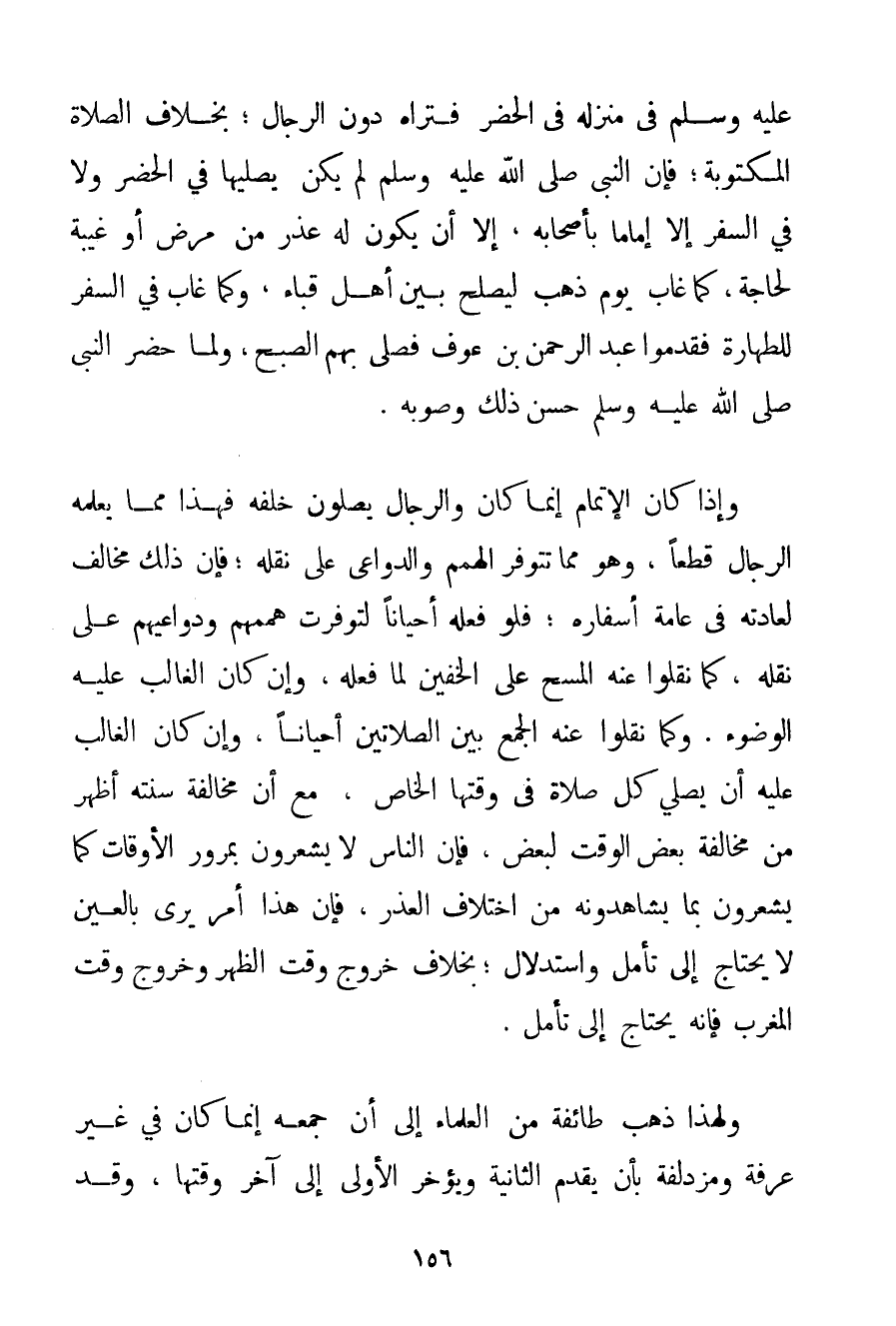 فِي مَنْزِلِهِ فِي الْحَضَرِ فَتَرَاهُ دُونَ الرِّجَالِ؛ بِخِلَافِ الصَّلَاةِ الْمَكْتُوبَةِ؛ فَإِنَّ النَّبِيَّ صَلَّى اللَّهُ عَلَيْهِ وَسَلَّمَ لَمْ يَكُنْ يُصَلِّيهَا فِي الْحَضَرِ وَلَا فِي السَّفَرِ إلَّا إمَامًا بِأَصْحَابِهِ إلَّا أَنْ يَكُونَ لَهُ عُذْرٌ مِنْ مَرَضٍ أَوْ غَيْبَةٍ لِحَاجَةِ كَمَا غَابَ يَوْمَ ذَهَبَ لِيُصْلِحَ بَيْنَ أَهْلِ قُبَاء وَكَمَا غَابَ فِي السَّفَرِ لِلطَّهَارَةِ فَقَدَّمُوا عَبْدَ الرَّحْمَنِ بْنَ عَوْفٍ فَصَلَّى بِهِمْ الصُّبْحَ وَلَمَّا حَضَرَ النَّبِيُّ صَلَّى اللَّهُ عَلَيْهِ وَسَلَّمَ حَسَّنَ ذَلِكَ وَصَوَّبَهُ. وَإِذَا كَانَ الْإِتْمَامُ إنَّمَا كَانَ وَالرِّجَالُ يُصَلُّونَ خَلْفَهُ فَهَذَا مِمَّا يَعْلَمُهُ الرِّجَالُ قَطْعًا وَهُوَ مِمَّا تَتَوَفَّرُ الْهِمَمُ وَالدَّوَاعِي عَلَى نَقْلِهِ؛ فَإِنَّ ذَلِكَ مُخَالِفٌ لِعَادَتِهِ فِي عَامَّةِ أَسْفَارِهِ؛ فَلَوْ فَعَلَهُ أَحْيَانًا لَتَوَفَّرَتْ هِمَمُهُمْ وَدَوَاعِيهِمْ عَلَى نَقْلِهِ كَمَا نَقَلُوا عَنْهُ الْمَسْحَ عَلَى الْخُفَّيْنِ لَمَّا فَعَلَهُ وَإِنْ كَانَ الْغَالِبُ عَلَيْهِ الْوُضُوءَ. وَكَمَا نَقَلُوا عَنْهُ الْجَمْعَ بَيْنَ الصَّلَاتَيْنِ أَحْيَانًا وَإِنْ كَانَ الْغَالِبُ عَلَيْهِ أَنْ يُصَلِّيَ كُلَّ صَلَاةٍ فِي وَقْتِهَا الْخَاصِّ مَعَ أَنَّ مُخَالَفَةَ سُنَّتِهِ أَظْهَرُ مِنْ مُخَالَفَةِ بَعْضِ الْوَقْتِ لِبَعْضِ فَإِنَّ النَّاسَ لَا يَشْعُرُونَ بِمُرُورِ الْأَوْقَاتِ كَمَا يَشْعُرُونَ بِمَا يُشَاهِدُونَهُ مِنْ اخْتِلَافِ الْعُذْرِ فَإِنَّ هَذَا أَمْرٌ يُرَى بِالْعَيْنِ لَا يَحْتَاجُ إلَى تَأَمُّلٍ وَاسْتِدْلَالٍ؛ بِخِلَافِ خُرُوجِ وَقْتِ الظُّهْرِ وَخُرُوجِ وَقْتِ الْمَغْرِبِ فَإِنَّهُ يَحْتَاجُ إلَى تَأَمُّلٍ. وَلِهَذَا ذَهَبَ طَائِفَةٌ مِنْ الْعُلَمَاءِ إلَى أَنَّ جَمْعَهُ إنَّمَا كَانَ فِي غَيْرِ عَرَفَةَ وَمُزْدَلِفَةَ بِأَنْ يُقَدِّمَ الثَّانِيَةَ وَيُؤَخِّرَ الْأُولَى إلَى آخِرِ وَقْتِهَا وَقَدْ