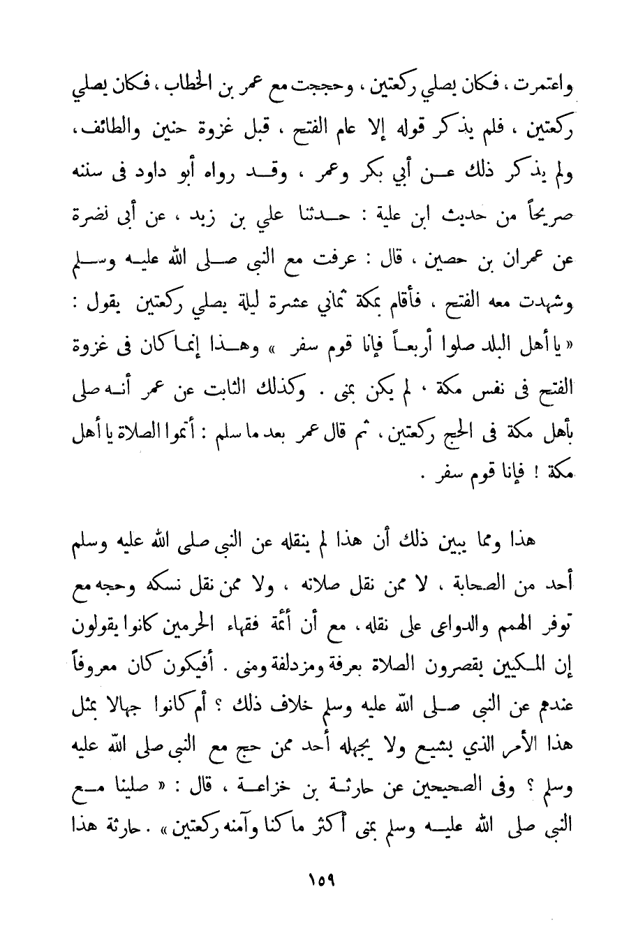 وَاعْتَمَرْت فَكَانَ يُصَلِّي رَكْعَتَيْنِ وَحَجَجْت مَعَ عُمَرَ بْنِ الْخَطَّابِ فَكَانَ يُصَلِّي رَكْعَتَيْنِ} فَلَمْ يَذْكُرْ قَوْلَهُ إلَّا عَامَ الْفَتْحِ قَبْلَ غَزْوَةِ حنين وَالطَّائِفِ وَلَمْ يَذْكُرْ ذَلِكَ عَنْ أَبِي بَكْرٍ وَعُمَرَ وَقَدْ رَوَاهُ أَبُو دَاوُد فِي سُنَنِهِ صَرِيحًا مِنْ حَدِيثِ ابْنِ عُلَيَّةَ: حَدَّثَنَا عَلِيُّ بْنُ زَيْدٍ عَنْ أَبِي نَضْرَةَ عَنْ {عِمْرَانَ بْنِ حُصَيْنٍ قَالَ: عَرَفْت مَعَ النَّبِيِّ صَلَّى اللَّهُ عَلَيْهِ وَسَلَّمَ وَشَهِدْت مَعَهُ الْفَتْحَ فَأَقَامَ بِمَكَّةَ ثَمَانِي عَشْرَةَ لَيْلَةً يُصَلِّي رَكْعَتَيْنِ يَقُولُ: يَا أَهْلَ الْبَلَدِ صَلُّوا أَرْبَعًا فَإِنَّا قَوْمٌ سَفْرٌ} وَهَذَا إنَّمَا كَانَ فِي غَزْوَةِ الْفَتْحِ فِي نَفْسِ مَكَّةَ لَمْ يَكُنْ بِمِنَى. وَكَذَلِكَ الثَّابِتُ عَنْ عُمَرَ أَنَّهُ صَلَّى بِأَهْلِ مَكَّةَ فِي الْحَجِّ رَكْعَتَيْنِ ثُمَّ قَالَ عُمَرُ بَعْدَ مَا سَلَّمَ: أَتِمُّوا الصَّلَاةَ يَا أَهْلَ مَكَّةَ فَإِنَّا قَوْمٌ سَفْرٌ. هَذَا وَمِمَّا يُبَيِّنُ ذَلِكَ أَنَّ هَذَا لَمْ يَنْقُلْهُ عَنْ النَّبِيِّ صَلَّى اللَّهُ عَلَيْهِ وَسَلَّمَ أَحَدٌ مِنْ الصَّحَابَةِ لَا مِمَّنْ نَقَلَ صَلَاتَهُ وَلَا مِمَّنْ نَقَلَ نُسُكَهُ وَحَجَّهُ مَعَ تَوَفُّرِ الْهِمَمِ وَالدَّوَاعِي عَلَى نَقْلِهِ مَعَ أَنَّ أَئِمَّةَ فُقَهَاءِ الْحَرَمَيْنِ كَانُوا يَقُولُونَ إنَّ الْمَكِّيِّينَ يَقْصُرُونَ الصَّلَاةَ بِعَرَفَةَ وَمُزْدَلِفَةَ وَمِنًى. أَفَيَكُونُ كَانَ مَعْرُوفًا عِنْدَهُمْ عَنْ النَّبِيِّ صَلَّى اللَّهُ عَلَيْهِ وَسَلَّمَ خِلَافُ ذَلِكَ؟ أَمْ كَانُوا جُهَّالًا بِمِثْلِ هَذَا الْأَمْرِ الَّذِي يَشِيعُ وَلَا يَجْهَلُهُ أَحَدٌ مِمَّنْ حَجَّ مَعَ النَّبِيِّ صَلَّى اللَّهُ عَلَيْهِ وَسَلَّمَ؟ وَفِي الصَّحِيحَيْنِ عَنْ {حَارِثَةَ بْنِ خُزَاعَةَ قَالَ: صَلَّيْنَا مَعَ النَّبِيِّ صَلَّى اللَّهُ عَلَيْهِ وَسَلَّمَ بِمِنَى أَكْثَرَ مَا كُنَّا وَآمَنَهُ رَكْعَتَيْنِ} حَارِثَةُ هَذَا