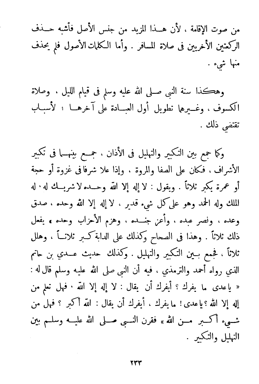 مِنْ صَوْتِ الْإِقَامَةِ لِأَنَّ هَذَا الْمَزِيدَ مِنْ جِنْسِ الْأَصْلِ فَأَشْبَهَ حَذْفَ الرَّكْعَتَيْنِ الْأُخْرَيَيْنِ فِي صَلَاةِ الْمُسَافِرِ. وَأَمَّا الْكَلِمَاتُ الْأُصُولُ فَلَمْ يُحْذَفْ مِنْهَا شَيْءٌ. وَهَكَذَا سُنَّةُ النَّبِيِّ صَلَّى اللَّهُ عَلَيْهِ وَسَلَّمَ فِي قِيَامِ اللَّيْلِ وَصَلَاةِ الْكُسُوفِ وَغَيْرِهِمَا تَطْوِيلُ أَوَّلِ الْعِبَادَةِ عَلَى آخِرِهَا؛ لِأَسْبَابٍ تَقْتَضِي ذَلِكَ. وَكَمَا جَمَعَ بَيْنَ التَّكْبِيرِ وَالتَّهْلِيلِ فِي الْأَذَانِ جَمَعَ بَيْنَهُمَا فِي تَكْبِيرِ الْأَشْرَافِ فَكَانَ عَلَى الصَّفَا وَالْمَرْوَةِ وَإِذَا عَلَا شَرْفًا فِي غَزْوَةٍ أَوْ حَجَّةٍ أَوْ عُمْرَةٍ يُكَبِّرُ ثَلَاثًا. وَيَقُولُ: {لَا إلَهَ إلَّا اللَّهُ وَحْدَهُ لَا شَرِيكَ لَهُ لَهُ الْمُلْكُ وَلَهُ الْحَمْدُ وَهُوَ عَلَى كُلِّ شَيْءٍ قَدِيرٌ لَا إلَهَ إلَّا اللَّهُ وَحْدَهُ صَدَقَ وَعْدَهُ وَنَصَرَ عَبْدَهُ وَأَعَزَّ جُنْدَهُ وَهَزَمَ الْأَحْزَابَ وَحْدَهُ} يَفْعَلُ ذَلِكَ ثَلَاثًا. وَهَذَا فِي الصِّحَاحِ وَكَذَلِكَ عَلَى الدَّابَّةِ كَبَّرَ ثَلَاثًا وَهَلَّلَ ثَلَاثًا فَجَمَعَ بَيْنَ التَّكْبِيرِ وَالتَّهْلِيلِ. وَكَذَلِكَ حَدِيثُ عَدِيِّ بْنِ حَاتِمٍ الَّذِي رَوَاهُ أَحْمَد وَالتِّرْمِذِي فِيهِ {أَنَّ النَّبِيَّ صَلَّى اللَّهُ عَلَيْهِ وَسَلَّمَ قَالَ لَهُ: يَا عَدِيُّ مَا يَفِرُّك؟ أَيَفِرُّك أَنْ يُقَالَ: لَا إلَهَ إلَّا اللَّهُ فَهَلْ تَعْلَمُ مَنْ لَا إلَهَ إلَّا اللَّهُ؟ يَا عَدِيُّ مَا يَفِرُّك أَيَفِرُّك أَنْ يُقَالَ: اللَّهُ أَكْبَرُ؟ فَهَلْ مِنْ شَيْءٍ أَكْبَرُ مِنْ اللَّهِ} فَقَرَنَ النَّبِيُّ صَلَّى اللَّهُ عَلَيْهِ وَسَلَّمَ بَيْنَ التَّهْلِيلِ وَالتَّكْبِيرِ.