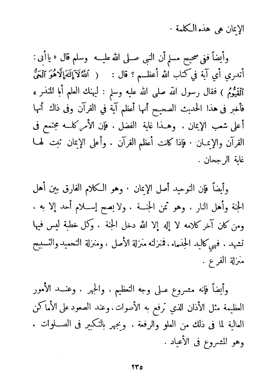الْإِيمَانِ هِيَ هَذِهِ الْكَلِمَةُ. وَأَيْضًا فَفِي صَحِيحِ مُسْلِمٍ {أَنَّ النَّبِيَّ صَلَّى اللَّهُ عَلَيْهِ وَسَلَّمَ قَالَ يَا أبي: أَتَدْرِي أَيَّ آيَةٍ فِي كِتَابِ اللَّهِ أَعْظَمُ؟ قَالَ: {اللَّهُ لَا إلَهَ إلَّا هُوَ الْحَيُّ الْقَيُّومُ} فَقَالَ رَسُولُ اللَّهِ صَلَّى اللَّهُ عَلَيْهِ وَسَلَّمَ ليهنك الْعِلْمُ أَبَا الْمُنْذِرِ} فَأَخْبَرَ فِي هَذَا الْحَدِيثِ الصَّحِيحِ أَنَّهَا أَعْظَمُ آيَةٍ فِي الْقُرْآنِ وَفِي ذَاكَ أَنَّهَا أَعْلَى شُعَبِ الْإِيمَانِ وَهَذَا غَايَةُ الْفَضْلِ فَإِنَّ الْأَمْرَ كُلَّهُ مُجْتَمِعٌ فِي الْقُرْآنِ وَالْإِيمَانِ فَإِذَا كَانَتْ أَعْظَمَ الْقُرْآنِ وَأَعْلَى الْإِيمَانِ ثَبَتَ لَهَا غَايَةُ الرُّجْحَانِ. وَأَيْضًا فَإِنَّ التَّوْحِيدَ أَصْلُ الْإِيمَانِ وَهُوَ الْكَلَامُ الْفَارِقُ بَيْنَ أَهْلِ الْجَنَّةِ وَأَهْلِ النَّارِ وَهُوَ ثَمَنُ الْجَنَّةِ وَلَا يَصِحُّ إسْلَامُ أَحَدٍ إلَّا بِهِ وَمَنْ كَانَ آخِرُ كَلَامِهِ لَا إلَهَ إلَّا اللَّهُ دَخَلَ الْجَنَّةَ وَكُلُّ خُطْبَةٍ لَيْسَ فِيهَا تَشَهُّدٌ فَهِيَ كَالْيَدِ الْجَذْمَاءِ فَمَنْزِلَتُهُ مَنْزِلَةُ الْأَصْلِ وَمَنْزِلَةُ التَّحْمِيدِ وَالتَّسْبِيحِ مَنْزِلَةُ الْفَرْعِ. وَأَيْضًا فَإِنَّهُ مَشْرُوعٌ عَلَى وَجْهِ التَّعْظِيمِ وَالْجَهْرِ وَعِنْدَ الْأُمُورِ الْعَظِيمَةِ مِثْلِ الْأَذَانِ الَّذِي تُرْفَعُ بِهِ الْأَصْوَاتُ وَعِنْدَ الصُّعُودِ عَلَى الْأَمَاكِنِ الْعَالِيَةِ لِمَا فِي ذَلِكَ مِنْ الْعُلُوِّ وَالرِّفْعَةِ وَيَجْهَرُ بِالتَّكْبِيرِ فِي الصَّلَوَاتِ وَهُوَ الْمَشْرُوعُ فِي الْأَعْيَادِ.