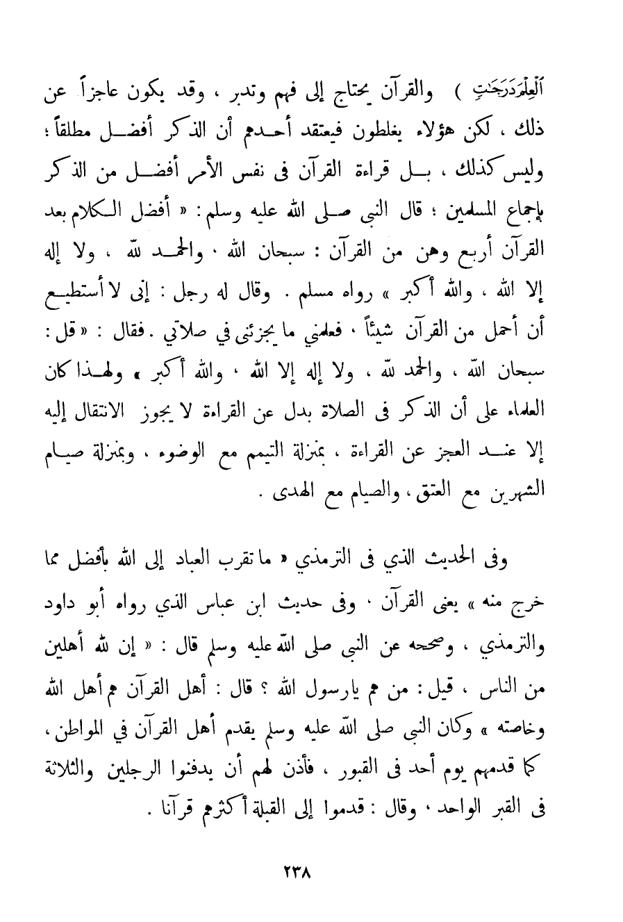 الْعِلْمَ دَرَجَاتٍ} وَالْقُرْآنُ يَحْتَاجُ إلَى فَهْمٍ وَتَدَبُّرٍ وَقَدْ يَكُونُ عَاجِزًا عَنْ ذَلِكَ لَكِنَّ هَؤُلَاءِ يَغْلَطُونَ فَيَعْتَقِدُ أَحَدُهُمْ أَنَّ الذِّكْرَ أَفْضَلُ مُطْلَقًا؛ وَلَيْسَ كَذَلِكَ بَلْ قِرَاءَةُ الْقُرْآنِ فِي نَفْسِ الْأَمْرِ أَفْضَلُ مِنْ الذِّكْرِ بِإِجْمَاعِ الْمُسْلِمِينَ؛ قَالَ النَّبِيُّ صَلَّى اللَّهُ عَلَيْهِ وَسَلَّمَ {أَفْضَلُ الْكَلَامِ بَعْدَ الْقُرْآنِ أَرْبَعٌ وَهُنَّ مِنْ الْقُرْآنِ: سُبْحَانَ اللَّهِ وَالْحَمْدُ لِلَّهِ وَلَا إلَهَ إلَّا اللَّهُ وَاَللَّهُ أَكْبَرُ} رَوَاهُ مُسْلِمٌ. {وَقَالَ لَهُ رَجُلٌ: إنِّي لَا أَسْتَطِيعُ أَنْ أَحْمِلَ مِنْ الْقُرْآنِ شَيْئًا فَعَلِّمْنِي مَا يُجْزِئُنِي فِي صَلَاتِي. فَقَالَ: قُلْ: سُبْحَانَ اللَّهِ وَالْحَمْدُ لِلَّهِ وَلَا إلَّا إلَّا اللَّهُ وَاَللَّهُ أَكْبَرُ} وَلِهَذَا كَانَ الْعُلَمَاءُ عَلَى أَنَّ الذِّكْرَ فِي الصَّلَاةِ بَدَلٌ عَنْ الْقِرَاءَةِ لَا يَجُوزُ الِانْتِقَالُ إلَيْهِ إلَّا عِنْدَ الْعَجْزِ عَنْ الْقِرَاءَةِ بِمَنْزِلَةِ التَّيَمُّمِ مَعَ الْوُضُوءِ وَبِمَنْزِلَةِ صِيَامِ الشَّهْرَيْنِ مَعَ الْعِتْقِ وَالصِّيَامِ مَعَ الْهَدْيِ. وَفِي الْحَدِيثِ الَّذِي فِي التِّرْمِذِيِّ {مَا تَقَرَّبَ الْعِبَادُ إلَى اللَّهِ بِأَفْضَلَ مِمَّا خَرَجَ مِنْهُ} يَعْنِي الْقُرْآنَ وَفِي حَدِيثِ ابْنِ عَبَّاسٍ الَّذِي رَوَاهُ أَبُو دَاوُد وَالتِّرْمِذِي وَصَحَّحَهُ عَنْ النَّبِيِّ صَلَّى اللَّهُ عَلَيْهِ وَسَلَّمَ قَالَ: {إنَّ لِلَّهِ أَهْلِينَ مِنْ النَّاسِ قِيلَ: مَنْ هُمْ يَا رَسُولَ اللَّهِ؟ قَالَ: أَهْلُ الْقُرْآنِ هُمْ أَهْلُ اللَّهِ وَخَاصَّتُهُ} وَكَانَ النَّبِيُّ صَلَّى اللَّهُ عَلَيْهِ وَسَلَّمَ يُقَدِّمُ أَهْلَ الْقُرْآنِ فِي الْمَوَاطِنِ كَمَا قَدَّمَهُمْ يَوْمَ أُحُدٍ فِي الْقُبُورِ فَأَذِنَ لَهُمْ أَنْ يَدْفِنُوا الرَّجُلَيْنِ وَالثَّلَاثَةَ فِي الْقَبْرِ الْوَاحِدِ وَقَالَ: قَدِّمُوا إلَى الْقِبْلَةِ أَكْثَرَهُمْ قُرْآنًا.