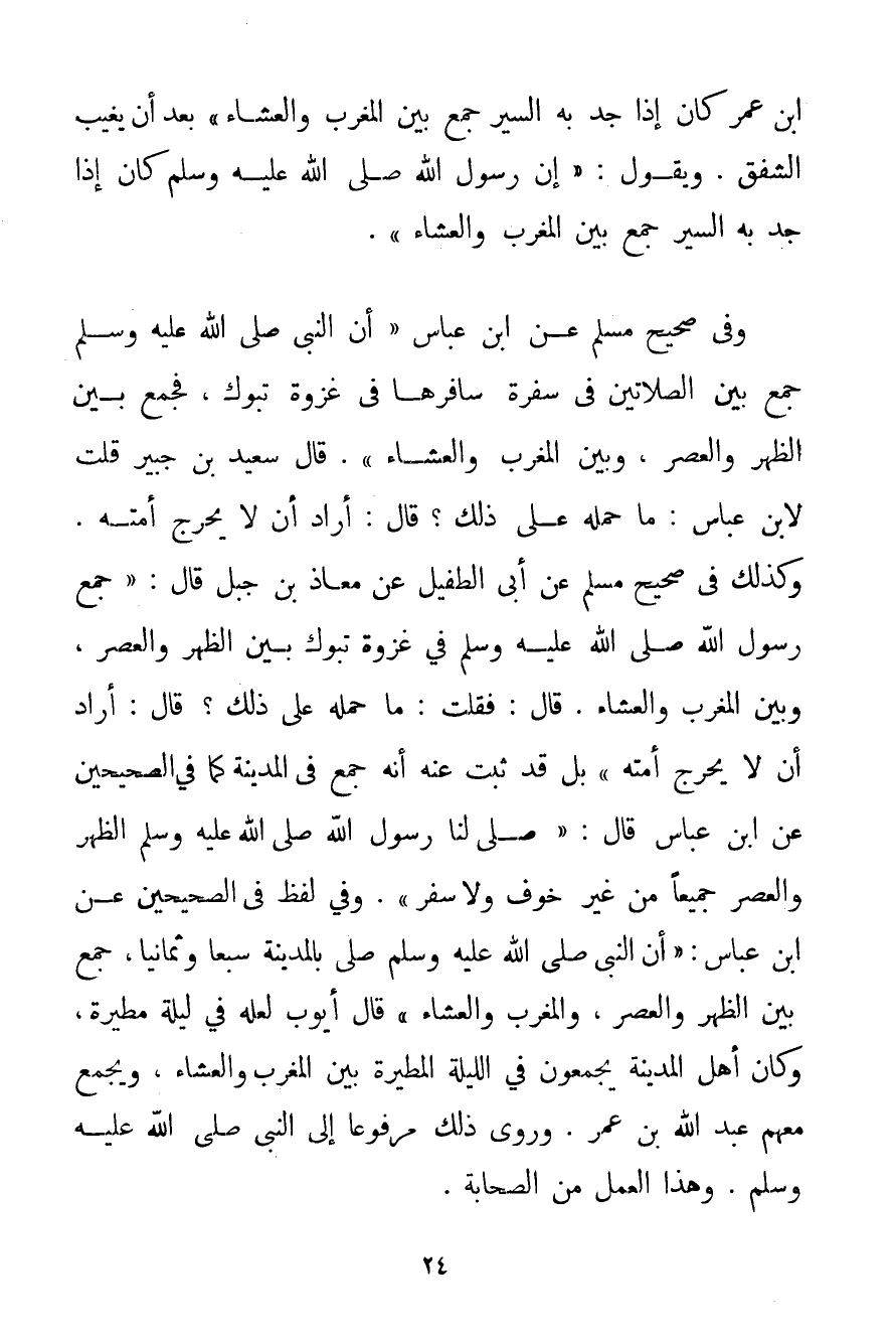 ابْنَ عُمَرَ كَانَ إذَا جَدَّ بِهِ السَّيْرُ جَمَعَ بَيْنَ الْمَغْرِبِ وَالْعِشَاءِ " بَعْدَ أَنْ يَغِيبَ الشَّفَقُ. وَيَقُولُ: {إنَّ رَسُولَ اللَّهِ صَلَّى اللَّهُ عَلَيْهِ وَسَلَّمَ كَانَ إذَا جَدَّ بِهِ السَّيْرُ جَمَعَ بَيْنَ الْمَغْرِبِ وَالْعِشَاءِ} . وَفِي صَحِيحِ مُسْلِمٍ عَنْ ابْنِ عَبَّاسٍ {أَنَّ النَّبِيَّ صَلَّى اللَّهُ عَلَيْهِ وَسَلَّمَ جَمَعَ بَيْنَ الصَّلَاتَيْنِ فِي سَفْرَةٍ سافرها فِي غَزْوَةِ تَبُوكَ فَجَمَعَ بَيْنَ الظُّهْرِ وَالْعَصْرِ وَبَيْنَ الْمَغْرِبِ وَالْعِشَاءِ} . قَالَ سَعِيدُ بْنُ جُبَيْرٍ قُلْت لِابْنِ عَبَّاسٍ: مَا حَمَلَهُ عَلَى ذَلِكَ؟ قَالَ: أَرَادَ أَنْ لَا يُحْرِجَ أُمَّتَهُ. وَكَذَلِكَ فِي صَحِيحِ مُسْلِمٍ عَنْ أَبِي الطُّفَيْلِ عَنْ مُعَاذِ بْنِ جَبَلٍ قَالَ: {جَمَعَ رَسُولُ اللَّهِ صَلَّى اللَّهُ عَلَيْهِ وَسَلَّمَ فِي غَزْوَةِ تَبُوكَ بَيْنَ الظُّهْرِ وَالْعَصْرِ وَبَيْنَ الْمَغْرِبِ وَالْعِشَاءِ. قَالَ: فَقُلْت: مَا حَمَلَهُ عَلَى ذَلِكَ؟ قَالَ: أَرَادَ أَنْ لَا يُحْرِجَ أُمَّتَهُ} بَلْ قَدْ ثَبَتَ عَنْهُ أَنَّهُ جَمَعَ فِي الْمَدِينَةِ كَمَا فِي الصَّحِيحَيْنِ عَنْ ابْنِ عَبَّاسٍ قَالَ: {صَلَّى لَنَا رَسُولُ اللَّهِ صَلَّى اللَّهُ عَلَيْهِ وَسَلَّمَ الظُّهْرَ وَالْعَصْرَ جَمِيعًا مِنْ غَيْرِ خَوْفٍ وَلَا سَفَرٍ} . وَفِي لَفْظٍ فِي الصَّحِيحَيْنِ عَنْ ابْنِ عَبَّاسٍ: {أَنَّ النَّبِيَّ صَلَّى اللَّهُ عَلَيْهِ وَسَلَّمَ صَلَّى بِالْمَدِينَةِ سَبْعًا وَثَمَانِيًا جَمَعَ بَيْنَ الظُّهْرِ وَالْعَصْرِ وَالْمَغْرِبِ وَالْعِشَاءِ} قَالَ أَيُّوبُ لَعَلَّهُ فِي لَيْلَةٍ مَطِيرَةٍ وَكَانَ أَهْلُ الْمَدِينَةِ يَجْمَعُونَ فِي اللَّيْلَةِ الْمَطِيرَةِ بَيْنَ الْمَغْرِبِ وَالْعِشَاءِ وَيَجْمَعُ مَعَهُمْ عَبْدُ اللَّهِ بْنُ عُمَرَ. وَرُوِيَ ذَلِكَ مَرْفُوعًا إلَى النَّبِيِّ صَلَّى اللَّهُ عَلَيْهِ وَسَلَّمَ. وَهَذَا الْعَمَلُ مِنْ الصَّحَابَةِ.