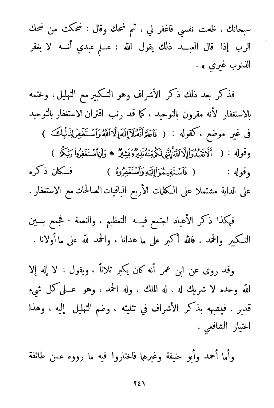 سُبْحَانَك ظَلَمْت نَفْسِي فَاغْفِرْ لِي ثُمَّ ضَحِكَ وَقَالَ: ضَحِكْت مِنْ ضَحِكِ الرَّبِّ إذَا قَالَ الْعَبْدُ ذَلِكَ يَقُولُ اللَّهُ: عَلِمَ عَبْدِي أَنَّهُ لَا يَغْفِرُ الذُّنُوبَ غَيْرِي} . فَذَكَرَ بَعْدَ ذَلِكَ ذِكْرَ الْأَشْرَافِ وَهُوَ التَّكْبِيرُ مَعَ التَّهْلِيلِ وَخَتَمَهُ بِالِاسْتِغْفَارِ لِأَنَّهُ مَقْرُونٌ بِالتَّوْحِيدِ كَمَا قَدْ رَتَّبَ اقْتِرَانَ الِاسْتِغْفَارِ بِالتَّوْحِيدِ فِي غَيْرِ مَوْضِعٍ كَقَوْلِهِ: {فَاعْلَمْ أَنَّهُ لَا إلَهَ إلَّا اللَّهُ وَاسْتَغْفِرْ لِذَنْبِكَ} وَقَوْلِهِ: {أَلَّا تَعْبُدُوا إلَّا اللَّهَ إنَّنِي لَكُمْ مِنْهُ نَذِيرٌ وَبَشِيرٌ وَأَنِ اسْتَغْفِرُوا رَبَّكُمْ} وَقَوْلِهِ: {فَاسْتَقِيمُوا إلَيْهِ وَاسْتَغْفِرُوهُ} فَكَانَ ذِكْرُهُ عَلَى الدَّابَّةِ مُشْتَمِلًا عَلَى الْكَلِمَاتِ الْأَرْبَعِ الْبَاقِيَاتِ الصَّالِحَاتِ مَعَ الِاسْتِغْفَارِ. فَهَكَذَا ذِكْرُ الْأَعْيَادِ اجْتَمَعَ فِيهِ التَّعْظِيمُ وَالنِّعْمَةُ فَجَمَعَ بَيْنَ التَّكْبِيرِ وَالْحَمْدِ. فَاَللَّهُ أَكْبَرُ عَلَى مَا هَدَانَا وَالْحَمْدُ لِلَّهِ عَلَى مَا أَوْلَانَا. وَقَدْ رُوِيَ عَنْ ابْنِ عُمَرَ أَنَّهُ كَانَ يُكَبِّرُ ثَلَاثًا وَيَقُولُ: لَا إلَهَ إلَّا اللَّهُ وَحْدَهُ لَا شَرِيكَ لَهُ لَهُ الْمُلْكُ وَلَهُ الْحَمْدُ وَهُوَ عَلَى كُلِّ شَيْءٍ قَدِيرٌ. فَيُشَبِّهُهُ بِذِكْرِ الْأَشْرَافِ فِي تَثْلِيثِهِ وَضَمِّ التَّهْلِيلِ إلَيْهِ وَهَذَا اخْتِيَارُ الشَّافِعِيِّ. وَأَمَّا أَحْمَد وَأَبُو حَنِيفَةَ وَغَيْرُهُمَا فَاخْتَارُوا فِيهِ مَا رَوَوْهُ عَنْ طَائِفَةٍ