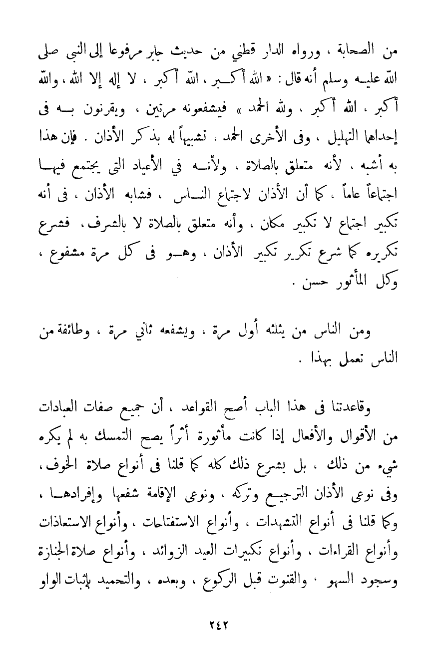مِنْ الصَّحَابَةِ وَرَوَاهُ الدارقطني مِنْ حَدِيثِ جَابِرٍ مَرْفُوعًا إلَى النَّبِيِّ صَلَّى اللَّهُ عَلَيْهِ وَسَلَّمَ أَنَّهُ قَالَ: {اللَّهُ أَكْبَرُ اللَّهُ أَكْبَرُ لَا إلَّا إلَّا اللَّهُ وَاَللَّهُ أَكْبَرُ اللَّهُ أَكْبَرُ وَلِلَّهِ الْحَمْدُ} فَيُشَفِّعُونَهُ مَرَّتَيْنِ وَيَقْرِنُونَ بِهِ فِي إحْدَاهُمَا التَّهْلِيلَ وَفِي الْأُخْرَى الْحَمْدَ تَشْبِيهًا لَهُ بِذِكْرِ الْأَذَانِ. فَإِنَّ هَذَا بِهِ أَشْبَهُ لِأَنَّهُ مُتَعَلِّقٌ بِالصَّلَاةِ وَلِأَنَّهُ فِي الْأَعْيَادِ الَّتِي يُجْتَمَعُ فِيهَا اجْتِمَاعًا عَامًّا كَمَا أَنَّ الْأَذَانَ لِاجْتِمَاعِ النَّاسِ فَشَابَهَ الْأَذَانَ فِي أَنَّهُ تَكْبِيرُ اجْتِمَاعٍ لَا تَكْبِيرُ مَكَانٍ وَأَنَّهُ مُتَعَلِّقٌ بِالصَّلَاةِ لَا بِالشَّرَفِ فَشُرِعَ تَكْرِيرُهُ كَمَا شُرِعَ تَكْرِيرُ تَكْبِيرِ الْأَذَانِ وَهُوَ فِي كُلِّ مَرَّةٍ مَشْفُوعٌ وَكُلُّ الْمَأْثُورِ حَسَنٌ. وَمِنْ النَّاسِ مَنْ يُثَلِّثُهُ أَوَّلَ مَرَّةٍ وَيُشَفِّعُهُ ثَانِيَ مَرَّةٍ وَطَائِفَةٌ مِنْ النَّاسِ تَعْمَلُ بِهَذَا. وَقَاعِدَتُنَا فِي هَذَا الْبَابِ أَصَحُّ الْقَوَاعِدِ أَنَّ جَمِيعَ صِفَاتِ الْعِبَادَاتِ مِنْ الْأَقْوَالِ وَالْأَفْعَالِ إذَا كَانَتْ مَأْثُورَةً أَثَرًا يَصِحُّ التَّمَسُّكُ بِهِ لَمْ يُكْرَهْ شَيْءٌ مِنْ ذَلِكَ بَلْ يُشْرَعُ ذَلِكَ كُلُّهُ كَمَا قُلْنَا فِي أَنْوَاعِ صَلَاةِ الْخَوْفِ وَفِي نَوْعَيْ الْأَذَانِ التَّرْجِيعِ وَتَرْكِهِ وَنَوْعَيْ الْإِقَامَةِ شَفْعِهَا وَإِفْرَادِهَا وَكَمَا قُلْنَا فِي أَنْوَاعِ التَّشَهُّدَاتِ وَأَنْوَاعِ الِاسْتِفْتَاحَاتِ وَأَنْوَاعِ الِاسْتِعَاذَاتِ وَأَنْوَاعِ الْقِرَاءَاتِ وَأَنْوَاعِ تَكْبِيرَاتِ الْعِيدِ الزَّوَائِدِ وَأَنْوَاعِ صَلَاةِ الْجِنَازَةِ وَسُجُودِ السَّهْوِ وَالْقُنُوتِ قَبْلَ الرُّكُوعِ وَبَعْدَهُ وَالتَّحْمِيدِ بِإِثْبَاتِ الْوَاوِ