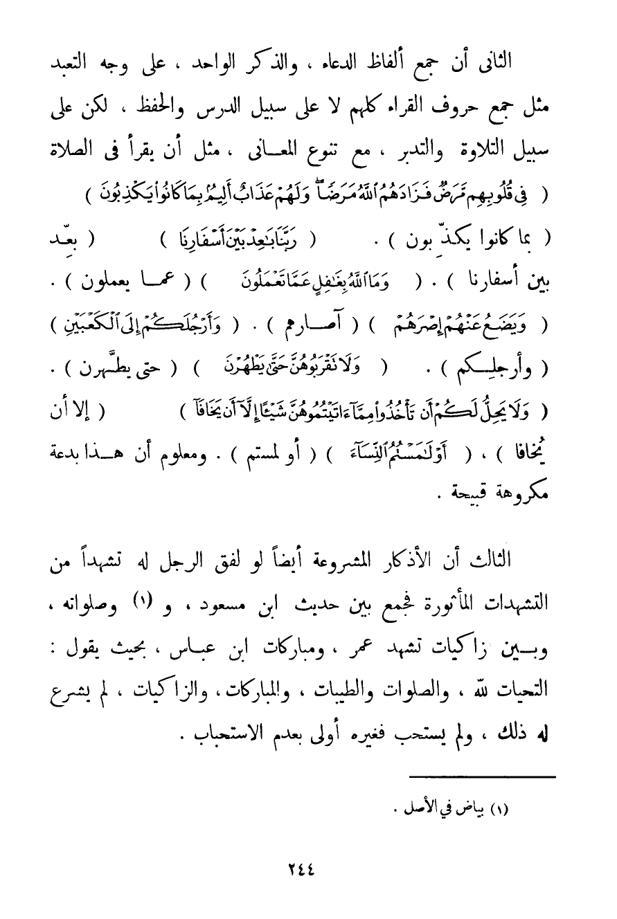 الثَّانِي أَنَّ جَمْعَ أَلْفَاظِ الدُّعَاءِ وَالذِّكْرِ الْوَاحِدِ عَلَى وَجْهِ التَّعَبُّدِ مِثْلُ جَمْعِ حُرُوفِ الْقُرَّاءِ كُلِّهِمْ لَا عَلَى سَبِيلِ الدَّرْسِ وَالْحِفْظِ لَكِنْ عَلَى سَبِيلِ التِّلَاوَةِ وَالتَّدَبُّرِ مَعَ تَنَوُّعِ الْمَعَانِي مِثْلَ أَنْ يَقْرَأَ فِي الصَّلَاةِ {فِي قُلُوبِهِمْ مَرَضٌ فَزَادَهُمُ اللَّهُ مَرَضًا وَلَهُمْ عَذَابٌ أَلِيمٌ بِمَا كَانُوا يَكْذِبُونَ} (بِمَا كَانُوا يُكَذِّبُونَ. {رَبَّنَا بَاعِدْ بَيْنَ أَسْفَارِنَا} (بَعِّدْ بَيْنِ أَسْفَارِنَا. {وَمَا اللَّهُ بِغَافِلٍ عَمَّا تَعْمَلُونَ} (عَمَّا يَعْمَلُونَ. {وَيَضَعُ عَنْهُمْ إصْرَهُمْ} (آصَارَهُمْ. {وَأَرْجُلَكُمْ إلَى الْكَعْبَيْنِ} (وَأَرْجُلِكُمْ. {وَلَا تَقْرَبُوهُنَّ حَتَّى يَطْهُرْنَ} (حَتَّى يَطَّهَّرْنَ. {وَلَا يَحِلُّ لَكُمْ أَنْ تَأْخُذُوا مِمَّا آتَيْتُمُوهُنَّ شَيْئًا إلَّا أَنْ يَخَافَا} (إلَّا أَنْ يُخَافَا {أَوْ لَامَسْتُمُ النِّسَاءَ} (أَوْ لَمَسْتُمْ. وَمَعْلُومٌ أَنَّ هَذَا بِدْعَةٌ مَكْرُوهَةٌ قَبِيحَةٌ. الثَّالِثُ أَنَّ الْأَذْكَارَ الْمَشْرُوعَةَ أَيْضًا لَوْ لَفَّقَ الرَّجُلُ لَهُ تَشَهُّدًا مِنْ التَّشَهُّدَاتِ الْمَأْثُورَةِ فَجَمَعَ بَيْنَ حَدِيثِ ابْنِ مَسْعُودٍ، وَ. . . (1) وَصَلَوَاتِهِ وَبَيْنَ زَاكِيَاتِ تَشَهُّدِ عُمَرَ وَمُبَارَكَاتِ ابْنِ عَبَّاسٍ بِحَيْثُ يَقُولُ: التَّحِيَّاتُ لِلَّهِ وَالصَّلَوَاتُ وَالطَّيِّبَاتُ وَالْمُبَارَكَاتُ وَالزَّاكِيَاتُ لَمْ يُشْرَعْ لَهُ ذَلِكَ وَلَمْ يُسْتَحَبَّ فَغَيْرُهُ أَوْلَى بِعَدَمِ الِاسْتِحْبَابِ.