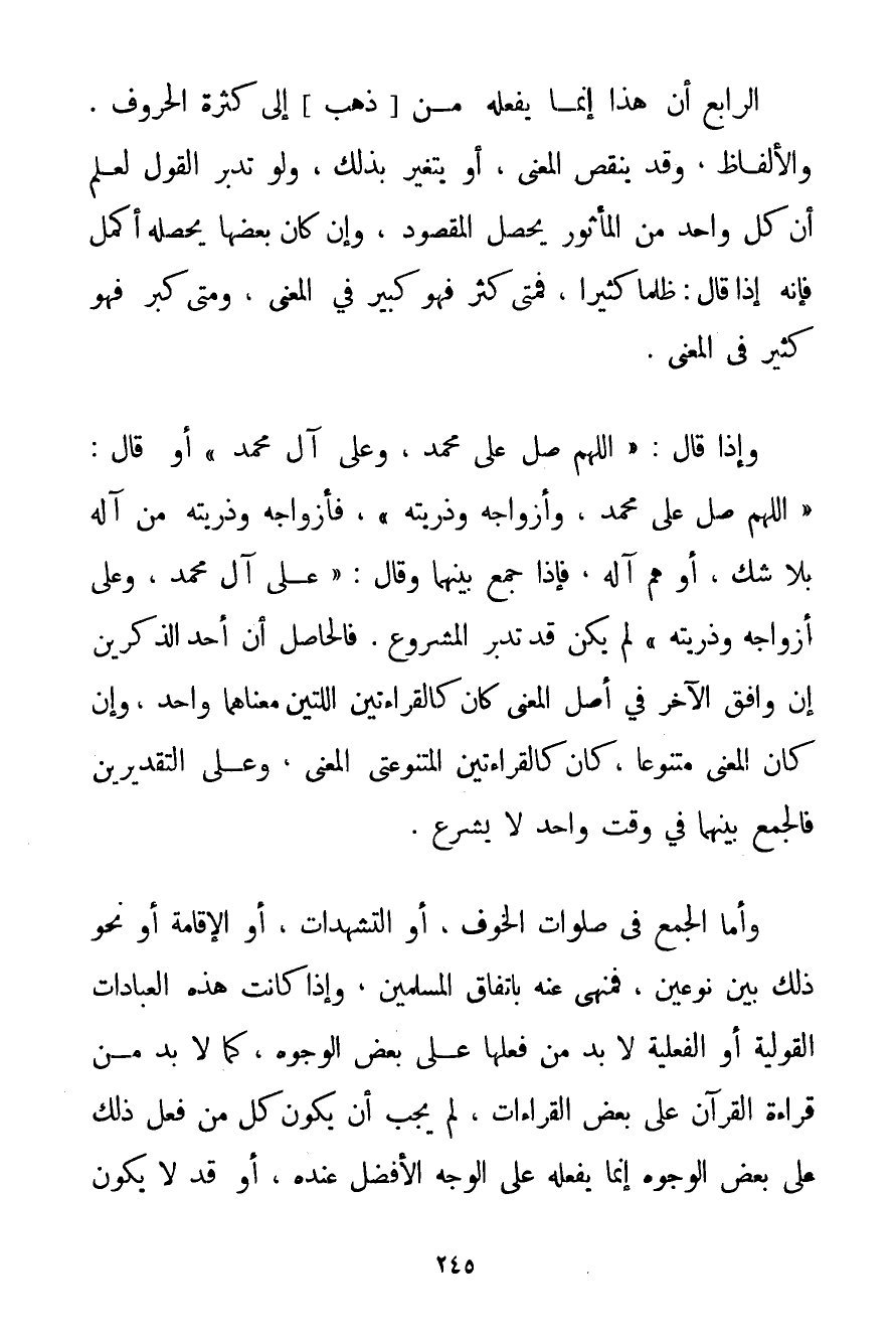 الرَّابِعُ أَنَّ هَذَا إنَّمَا يَفْعَلُهُ مَنْ ذَهَبَ إلَى كَثْرَةِ الْحُرُوفِ. وَالْأَلْفَاظِ وَقَدْ يَنْقُصُ الْمَعْنَى أَوْ يَتَغَيَّرُ بِذَلِكَ وَلَوْ تَدَبَّرَ الْقَوْلَ لَعَلِمَ أَنَّ كُلَّ وَاحِدٍ مِنْ الْمَأْثُورِ يُحَصِّلُ الْمَقْصُودَ وَإِنْ كَانَ بَعْضُهَا يُحَصِّلُهُ أَكْمَلَ فَإِنَّهُ إذَا قَالَ: ظُلْمًا كَثِيرًا فَمَتَى كَثُرَ فَهُوَ كَبِيرٌ فِي الْمَعْنَى وَمَتَى كَبُرَ فَهُوَ كَثِيرٌ فِي الْمَعْنَى. وَإِذَا قَالَ: " اللَّهُمَّ صَلِّ عَلَى مُحَمَّدٍ وَعَلَى آلِ مُحَمَّدٍ " أَوْ قَالَ: " اللَّهُمَّ صَلِّ عَلَى مُحَمَّدٍ وَأَزْوَاجِهِ وَذُرِّيَّتِهِ " فَأَزْوَاجُهُ وَذُرِّيَّتُهُ مِنْ آلِهِ بِلَا شَكٍّ أَوْ هُمْ آلُهُ فَإِذَا جَمَعَ بَيْنَهُمَا وَقَالَ: " عَلَى آلِ مُحَمَّدٍ وَعَلَى أَزْوَاجِهِ وَذُرِّيَّتِهِ " لَمْ يَكُنْ قَدْ تَدَبَّرَ الْمَشْرُوعَ. فَالْحَاصِلُ أَنَّ أَحَدَ الذِّكْرَيْنِ إنْ وَافَقَ الْآخَرَ فِي أَصْلِ الْمَعْنَى كَانَ كَالْقِرَاءَتَيْنِ اللَّتَيْنِ مَعْنَاهُمَا وَاحِدٌ وَإِنْ كَانَ الْمَعْنَى مُتَنَوِّعًا كَانَ كَالْقِرَاءَتَيْنِ الْمُتَنَوِّعَتَيْ الْمَعْنَى وَعَلَى التَّقْدِيرَيْنِ فَالْجَمْعُ بَيْنَهُمَا فِي وَقْتٍ وَاحِدٍ لَا يُشْرَعُ. وَأَمَّا الْجَمْعُ فِي صَلَوَاتِ الْخَوْفِ أَوْ التَّشَهُّدَاتِ أَوْ الْإِقَامَةِ أَوْ نَحْوِ ذَلِكَ بَيْنَ نَوْعَيْنِ فَمَنْهِيٌّ عَنْهُ بِاتِّفَاقِ الْمُسْلِمِينَ وَإِذَا كَانَتْ هَذِهِ الْعِبَادَاتُ الْقَوْلِيَّةُ أَوْ الْفِعْلِيَّةُ لَا بُدَّ مِنْ فِعْلِهَا عَلَى بَعْضِ الْوُجُوهِ كَمَا لَا بُدَّ مِنْ قِرَاءَةِ الْقُرْآنِ عَلَى بَعْضِ الْقِرَاءَاتِ لَمْ يَجِبْ أَنْ يَكُونَ كُلُّ مَنْ فَعَلَ ذَلِكَ عَلَى بَعْضِ الْوُجُوهِ إنَّمَا يَفْعَلُهُ عَلَى الْوَجْهِ الْأَفْضَلِ عِنْدَهُ أَوْ قَدْ لَا يَكُونُ