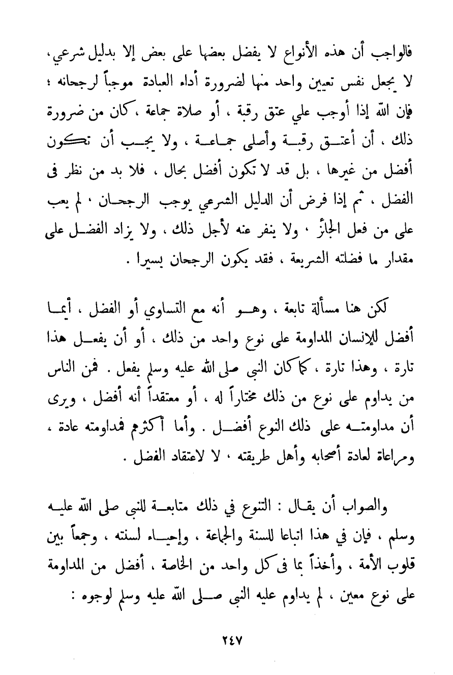فَالْوَاجِبُ أَنَّ هَذِهِ الْأَنْوَاعَ لَا يُفَضَّلُ بَعْضُهَا عَلَى بَعْضٍ إلَّا بِدَلِيلٍ شَرْعِيٍّ لَا يُجْعَلُ نَفْسُ تَعْيِينٍ وَاحِدٍ مِنْهَا لِضَرُورَةِ أَدَاءِ الْعِبَادَةِ مُوجِبًا لِرُجْحَانِهِ؛ فَإِنَّ اللَّهَ إذَا أَوْجَبَ عَلَيَّ عِتْقَ رَقَبَةٍ أَوْ صَلَاةَ جَمَاعَةٍ كَانَ مِنْ ضَرُورَةِ ذَلِكَ أَنْ أَعْتِقَ رَقَبَةً وَأُصَلِّيَ جَمَاعَةً وَلَا يَجِبُ أَنْ تَكُونَ أَفْضَلَ مِنْ غَيْرِهَا بَلْ قَدْ لَا تَكُونُ أَفْضَلَ بِحَالِ فَلَا بُدَّ مِنْ نَظَرٍ فِي الْفَضْلِ ثُمَّ إذَا فُرِضَ أَنَّ الدَّلِيلَ الشَّرْعِيَّ يُوجِبُ الرُّجْحَانَ لَمْ يُعَبْ عَلَى مَنْ فَعَلَ الْجَائِزَ وَلَا يُنْفَرْ عَنْهُ لِأَجْلِ ذَلِكَ وَلَا يُزَادُ الْفَضْلُ عَلَى مِقْدَارِ مَا فَضَّلَتْهُ الشَّرِيعَةُ فَقَدْ يَكُونُ الرُّجْحَانُ يَسِيرًا. لَكِنْ هُنَا مَسْأَلَةٌ تَابِعَةٌ وَهُوَ أَنَّهُ مَعَ التَّسَاوِي أَوْ الْفَضْلِ أَيُّمَا أَفْضَلُ لِلْإِنْسَانِ الْمُدَاوَمَةُ عَلَى نَوْعٍ وَاحِدٍ مِنْ ذَلِكَ أَوْ أَنْ يَفْعَلَ هَذَا تَارَةً وَهَذَا تَارَةً كَمَا كَانَ النَّبِيُّ صَلَّى اللَّهُ عَلَيْهِ وَسَلَّمَ يَفْعَلُ. فَمِنْ النَّاسِ مَنْ يُدَاوِمُ عَلَى نَوْعٍ مِنْ ذَلِكَ مُخْتَارًا لَهُ أَوْ مُعْتَقِدًا أَنَّهُ أَفْضَلُ وَيَرَى أَنَّ مُدَاوَمَتَهُ عَلَى ذَلِكَ النَّوْعِ أَفْضَلُ. وَأَمَّا أَكْثَرُهُمْ فَمُدَاوَمَتُهُ عَادَةٌ وَمُرَاعَاةٌ لِعَادَةِ أَصْحَابِهِ وَأَهْلِ طَرِيقَتِهِ لَا لِاعْتِقَادِ الْفَضْلِ. وَالصَّوَابُ أَنْ يُقَالَ: التَّنَوُّعُ فِي ذَلِكَ مُتَابَعَةٌ لِلنَّبِيِّ صَلَّى اللَّهُ عَلَيْهِ وَسَلَّمَ - فَإِنَّ فِي هَذَا اتِّبَاعًا لِلسُّنَّةِ وَالْجَمَاعَةِ وَإِحْيَاءً لِسُنَّتِهِ وَجَمْعًا بَيْنَ قُلُوبِ الْأُمَّةِ وَأَخْذًا بِمَا فِي كُلِّ وَاحِدٍ مِنْ الْخَاصَّةِ - أَفْضَلُ مِنْ الْمُدَاوَمَةِ عَلَى نَوْعٍ مُعَيَّنٍ لَمْ يُدَاوِمْ عَلَيْهِ النَّبِيُّ صَلَّى اللَّهُ عَلَيْهِ وَسَلَّمَ لِوُجُوهِ: