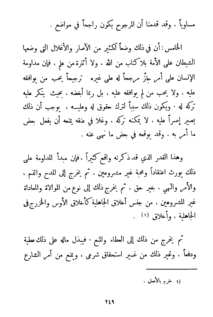 مُسَاوِيًا وَقَدْ قَدَّمْنَا أَنَّ الْمَرْجُوحَ يَكُونُ رَاجِحًا فِي مَوَاضِعَ. الْخَامِسُ: أَنَّ فِي ذَلِكَ وَضْعًا لِكَثِيرٍ مِنْ الْآصَارِ وَالْأَغْلَالِ الَّتِي وَضَعَهَا الشَّيْطَانُ عَلَى الْأُمَّةِ بِلَا كِتَابٍ مِنْ اللَّهِ وَلَا أَثَارَةٍ مِنْ عِلْمٍ فَإِنَّ مُدَاوَمَةَ الْإِنْسَانِ عَلَى أَمْرٍ جَائِزٍ مُرَجِّحًا لَهُ عَلَى غَيْرِهِ تَرْجِيحًا يُحِبُّ مَنْ يُوَافِقُهُ عَلَيْهِ وَلَا يُحِبُّ مَنْ لَمْ يُوَافِقْهُ عَلَيْهِ بَلْ رُبَّمَا أَبْغَضَهُ بِحَيْثُ يُنْكِرُ عَلَيْهِ تَرْكَهُ لَهُ وَيَكُونُ ذَلِكَ سَبَبًا لِتَرْكِ حُقُوقٍ لَهُ وَعَلَيْهِ يُوجِبُ أَنَّ ذَلِكَ يَصِيرُ إصْرًا عَلَيْهِ لَا يُمْكِنُهُ تَرْكُهُ وَغَلَا فِي عُنُقِهِ يَمْنَعُهُ أَنْ يَفْعَلَ بَعْضَ مَا أُمِرَ بِهِ وَقَدْ يُوقِعُهُ فِي بَعْضِ مَا نُهِيَ عَنْهُ. وَهَذَا الْقَدْرُ الَّذِي قَدْ ذَكَرْته وَاقِعٌ كَثِيرًا فَإِنَّ مَبْدَأَ الْمُدَاوَمَةِ عَلَى ذَلِكَ يُورِثُ اعْتِقَادًا وَمَحَبَّةً غَيْرَ مَشْرُوعَيْنِ ثُمَّ يَخْرُجُ إلَى الْمَدْحِ وَالذَّمِّ وَالْأَمْرِ وَالنَّهْيِ بِغَيْرِ حَقٍّ ثُمَّ يَخْرُجُ ذَلِكَ إلَى نَوْعٍ مِنْ الْمُوَالَاةِ وَالْمُعَادَاةِ غَيْرِ الْمَشْرُوعَيْنِ مِنْ جِنْسِ أَخْلَاقِ الْجَاهِلِيَّةِ كَأَخْلَاقِ الْأَوْسِ وَالْخَزْرَجِ فِي الْجَاهِلِيَّةِ وَأَخْلَاقِ. . . (1) .
