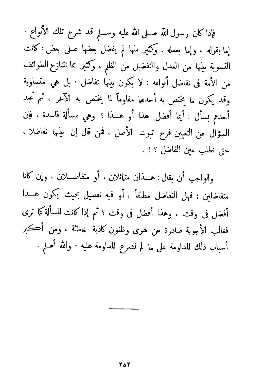 فَإِذَا كَانَ رَسُولُ اللَّهِ صَلَّى اللَّهُ عَلَيْهِ وَسَلَّمَ قَدْ شَرَعَ تِلْكَ الْأَنْوَاعَ إمَّا بِقَوْلِهِ وَإِمَّا بِعَمَلِهِ وَكَثِيرٌ مِنْهَا لَمْ يُفَضِّلْ بَعْضَهَا عَلَى بَعْضٍ: كَانَتْ التَّسْوِيَةُ بَيْنَهَا مِنْ الْعَدْلِ وَالتَّفْضِيلُ مِنْ الظُّلْمِ وَكَثِيرٌ مِمَّا تَتَنَازَعُ الطَّوَائِفُ مِنْ الْأُمَّةِ فِي تَفَاضُلِ أَنْوَاعِهِ: لَا يَكُونُ بَيْنَهَا تَفَاضُلٌ بَلْ هِيَ مُتَسَاوِيَةٌ وَقَدْ يَكُونُ مَا يَخْتَصُّ بِهِ أَحَدُهُمَا مُقَاوِمًا لِمَا يَخْتَصُّ بِهِ الْآخَرُ ثُمَّ تَجِدُ أَحَدَهُمْ يَسْأَلُ: أَيُّمَا أَفْضَلُ هَذَا أَوْ هَذَا؟ وَهِيَ مَسْأَلَةٌ فَاسِدَةٌ فَإِنَّ السُّؤَالَ عَنْ التَّعْيِينِ فَرْعُ ثُبُوتِ الْأَصْلِ فَمَنْ قَالَ إنَّ بَيْنَهُمَا تَفَاضُلًا حَتَّى نَطْلُبَ عَيْنَ الْفَاضِلِ. وَالْوَاجِبُ أَنْ يُقَالَ: هَذَانِ مُتَمَاثِلَانِ أَوْ مُتَفَاضِلَانِ وَإِنْ كَانَا مُتَفَاضِلَيْنِ: فَهَلْ التَّفَاضُلُ مُطْلَقًا أَوْ فِيهِ تَفْصِيلٌ بِحَيْثُ يَكُونُ هَذَا أَفْضَلَ فِي وَقْتٍ وَهَذَا أَفْضَلَ فِي وَقْتٍ؟ ثُمَّ إذَا كَانَتْ الْمَسْأَلَةُ كَمَا تَرَى فَغَالِبُ الْأَجْوِبَةِ صَادِرَةٌ عَنْ هَوًى وَظُنُونٍ كَاذِبَةٍ خَاطِئَةٍ وَمِنْ أَكْبَرِ أَسْبَابِ ذَلِكَ الْمُدَاوَمَةُ عَلَى مَا لَمْ تُشْرَعْ الْمُدَاوَمَةُ عَلَيْهِ وَاَللَّهُ أَعْلَمُ.