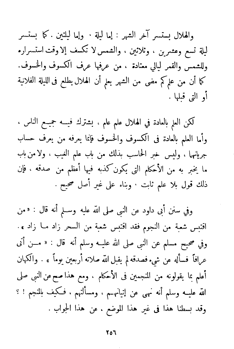وَالْهِلَالُ يَسْتَسِرُّ آخِرَ الشَّهْرِ: إمَّا لَيْلَةً وَإِمَّا لَيْلَتَيْنِ. كَمَا يَسْتَسِرُّ لَيْلَةَ تِسْعٍ وَعِشْرِينَ وَثَلَاثِينَ وَالشَّمْسُ لَا تَكْسِفُ إلَّا وَقْتَ اسْتِسْرَارِهِ وَلِلشَّمْسِ وَالْقَمَرِ لَيَالِي مُعْتَادَةٌ مَنْ عَرَفَهَا عَرَفَ الْكُسُوفَ وَالْخُسُوفَ. كَمَا أَنَّ مَنْ عَلِمَ كَمْ مَضَى مِنْ الشَّهْرِ يَعْلَمُ أَنَّ الْهِلَالَ يَطْلُعُ فِي اللَّيْلَةِ الْفُلَانِيَّةِ أَوْ الَّتِي قَبْلَهَا. لَكِنَّ الْعِلْمَ بِالْعَادَةِ فِي الْهِلَالِ عِلْمٌ عَامٌّ يَشْتَرِكُ فِيهِ جَمِيعُ النَّاسِ وَأَمَّا الْعِلْمُ بِالْعَادَةِ فِي الْكُسُوفِ وَالْخُسُوفِ فَإِنَّمَا يَعْرِفُهُ مَنْ يَعْرِفُ حِسَابَ جَرَيَانِهِمَا وَلَيْسَ خَبَرُ الْحَاسِبِ بِذَلِكَ مِنْ بَابِ عِلْمِ الْغَيْبِ وَلَا مِنْ بَابِ مَا يُخْبِرُ بِهِ مِنْ الْأَحْكَامِ الَّتِي يَكُونُ كَذِبُهُ فِيهَا أَعْظَمَ مِنْ صِدْقِهِ فَإِنَّ ذَلِكَ قَوْلٌ بِلَا عِلْمٍ ثَابِتٍ وَبِنَاءً عَلَى غَيْرِ أَصْلٍ صَحِيحٍ. وَفِي سُنَنِ أَبِي دَاوُد عَنْ النَّبِيِّ صَلَّى اللَّهُ عَلَيْهِ وَسَلَّمَ أَنَّهُ قَالَ: {مَنْ اقْتَبَسَ شُعْبَةً مِنْ النُّجُومِ فَقَدْ اقْتَبَسَ شُعْبَةً مِنْ السِّحْرِ زَادَ مَا زَادَ} . وَفِي صَحِيحِ مُسْلِمٍ عَنْ النَّبِيِّ صَلَّى اللَّهُ عَلَيْهِ وَسَلَّمَ أَنَّهُ قَالَ: {مَنْ أَتَى عَرَّافًا فَسَأَلَهُ عَنْ شَيْءٍ فَصَدَّقَهُ لَمْ يَقْبَلْ اللَّهُ صَلَاتَهُ أَرْبَعِينَ يَوْمًا} . وَالْكُهَّانُ أَعْلَمُ بِمَا يَقُولُونَهُ مِنْ الْمُنَجِّمِينَ فِي الْأَحْكَامِ وَمَعَ هَذَا صَحَّ عَنْ النَّبِيِّ صَلَّى اللَّهُ عَلَيْهِ وَسَلَّمَ أَنَّهُ نَهَى عَنْ إتْيَانِهِمْ وَمَسْأَلَتِهِمْ فَكَيْفَ بِالْمُنَجِّمِ؟ وَقَدْ بَسَطْنَا هَذَا فِي غَيْرِ هَذَا الْمَوْضِعِ عَنْ هَذَا الْجَوَابِ.