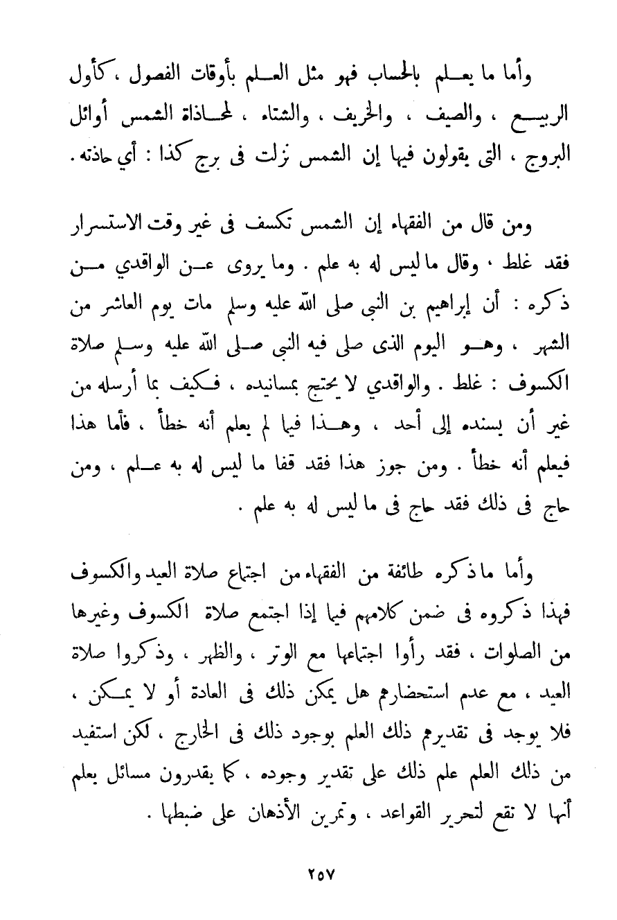 وَأَمَّا مَا يُعْلَمُ بِالْحِسَابِ فَهُوَ مِثْلُ الْعِلْمِ بِأَوْقَاتِ الْفُصُولِ كَأَوَّلِ الرَّبِيعِ وَالصَّيْفِ وَالْخَرِيفِ وَالشِّتَاءِ لِمُحَاذَاةِ الشَّمْسِ أَوَائِلَ الْبُرُوجِ الَّتِي يَقُولُونَ فِيهَا إنَّ الشَّمْسَ نَزَلَتْ فِي بُرْجِ كَذَا: أَيْ حَاذَتْهُ. وَمَنْ قَالَ مِنْ الْفُقَهَاءِ إنَّ الشَّمْسَ تَكْسِفُ فِي غَيْرِ وَقْتِ الِاسْتِسْرَارِ فَقَدْ غَلِطَ وَقَالَ مَا لَيْسَ لَهُ بِهِ عِلْمٌ. وَمَا يُرْوَى عَنْ الواقدي مِنْ ذِكْرِهِ: أَنَّ إبْرَاهِيمَ بْنَ النَّبِيِّ صَلَّى اللَّهُ عَلَيْهِ وَسَلَّمَ مَاتَ يَوْمَ الْعَاشِرِ مِنْ الشَّهْرِ وَهُوَ الْيَوْمُ الَّذِي صَلَّى فِيهِ النَّبِيُّ صَلَّى اللَّهُ عَلَيْهِ وَسَلَّمَ صَلَاةَ الْكُسُوفِ: غَلَطٌ. والواقدي لَا يُحْتَجُّ بِمَسَانِيدِهِ فَكَيْفَ بِمَا أَرْسَلَهُ مِنْ غَيْرِ أَنْ يُسْنِدَهُ إلَى أَحَدٍ وَهَذَا فِيمَا لَمْ يُعْلَمْ أَنَّهُ خَطَأٌ فَأَمَّا هَذَا فَيُعْلَمُ أَنَّهُ خَطَأٌ. وَمَنْ جَوَّزَ هَذَا فَقَدْ قَفَا مَا لَيْسَ لَهُ بِهِ عِلْمٌ وَمَنْ حَاجَّ فِي ذَلِكَ فَقَدْ حَاجَّ فِي مَا لَيْسَ لَهُ بِهِ عِلْمٌ. وَأَمَّا مَا ذَكَرَهُ طَائِفَةٌ مِنْ الْفُقَهَاءِ مِنْ اجْتِمَاعِ صَلَاةِ الْعِيدِ وَالْكُسُوفِ فَهَذَا ذَكَرُوهُ فِي ضِمْنِ كَلَامِهِمْ فِيمَا إذَا اجْتَمَعَ صَلَاةُ الْكُسُوفِ وَغَيْرُهَا مِنْ الصَّلَوَاتِ فَقَدْ رَأَوْا اجْتِمَاعَهَا مَعَ الْوِتْرِ وَالظُّهْرِ وَذَكَرُوا صَلَاةَ الْعِيدِ مَعَ عَدَمِ اسْتِحْضَارِهِمْ هَلْ يُمْكِنُ ذَلِكَ فِي الْعَادَةِ أَوْ لَا يُمْكِنُ فَلَا يُوجَدُ فِي تَقْدِيرِهِمْ ذَلِكَ الْعِلْمُ بِوُجُودِ ذَلِكَ فِي الْخَارِجِ لَكِنْ اُسْتُفِيدَ مِنْ ذَلِكَ الْعِلْمِ عِلْمُ ذَلِكَ عَلَى تَقْدِيرِ وُجُودِهِ كَمَا يُقَدِّرُونَ مَسَائِلَ يُعْلَمُ أَنَّهَا لَا تَقَعُ لِتَحْرِيرِ الْقَوَاعِدِ وَتَمْرِينِ الْأَذْهَانِ عَلَى ضَبْطِهَا.