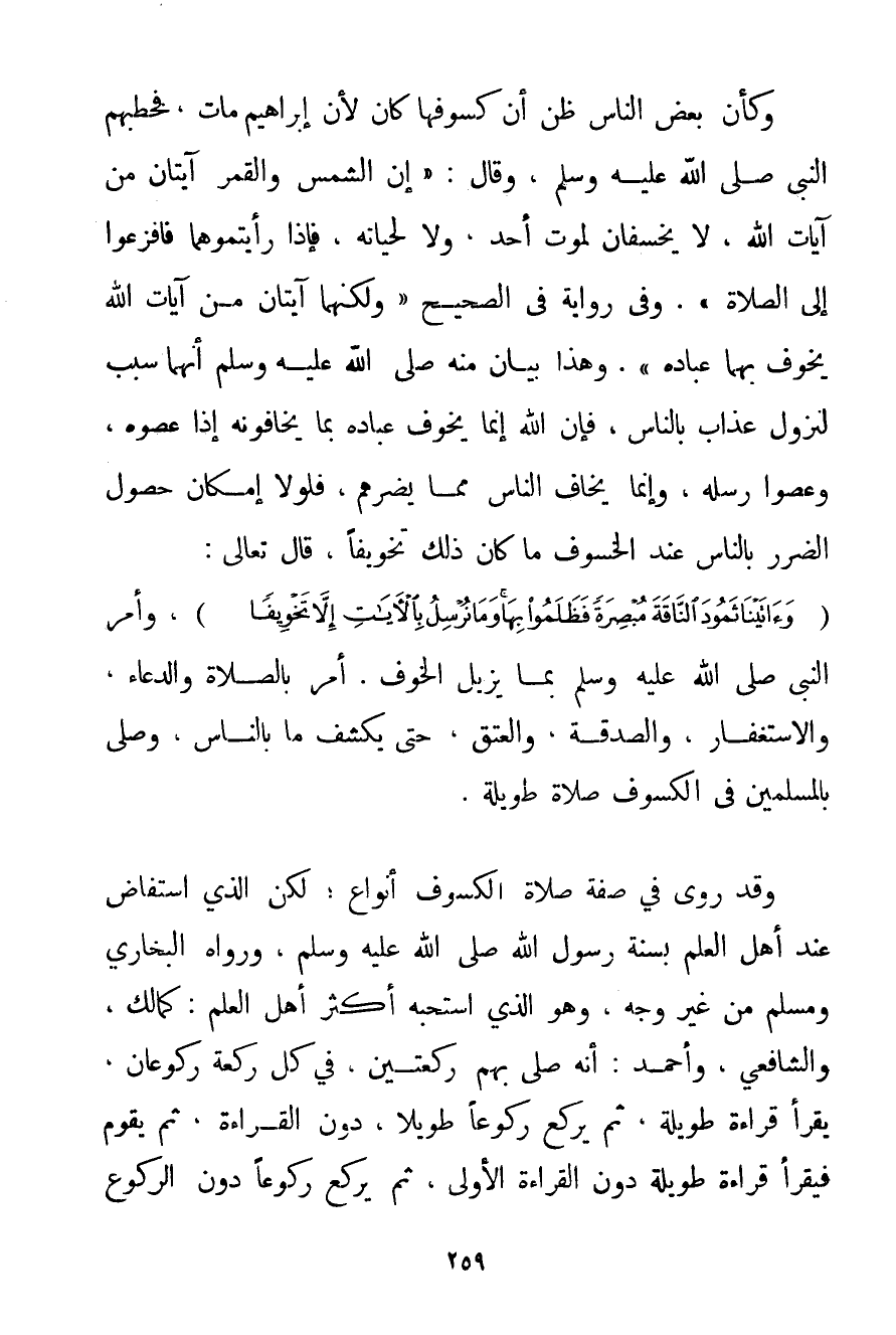 وَكَأَنَّ بَعْضَ النَّاسِ ظَنَّ أَنَّ كُسُوفَهَا كَانَ لِأَنَّ إبْرَاهِيمَ مَاتَ فَخَطَبَهُمْ النَّبِيُّ صَلَّى اللَّهُ عَلَيْهِ وَسَلَّمَ وَقَالَ: {إنَّ الشَّمْسَ وَالْقَمَرَ آيَتَانِ مِنْ آيَاتِ اللَّهِ لَا يَخْسِفَانِ لِمَوْتِ أَحَدٍ وَلَا لِحَيَاتِهِ فَإِذَا رَأَيْتُمُوهُمَا فَافْزَعُوا إلَى الصَّلَاةِ} . وَفِي رِوَايَةٍ فِي الصَّحِيحِ {وَلَكِنَّهُمَا آيَتَانِ مِنْ آيَاتِ اللَّهِ يُخَوِّفُ بِهِمَا عِبَادَهُ} . وَهَذَا بَيَانٌ مِنْهُ صَلَّى اللَّهُ عَلَيْهِ وَسَلَّمَ أَنَّهُمَا سَبَبٌ لِنُزُولِ عَذَابٍ بِالنَّاسِ فَإِنَّ اللَّهَ إنَّمَا يُخَوِّفُ عِبَادَهُ بِمَا يَخَافُونَهُ إذَا عَصَوْهُ وَعَصَوْا رُسُلَهُ وَإِنَّمَا يَخَافُ النَّاسُ مِمَّا يَضُرُّهُمْ فَلَوْلَا إمْكَانُ حُصُولِ الضَّرَرِ بِالنَّاسِ عِنْدَ الْخُسُوفِ مَا كَانَ ذَلِكَ تَخْوِيفًا قَالَ تَعَالَى: {وَآتَيْنَا ثَمُودَ النَّاقَةَ مُبْصِرَةً فَظَلَمُوا بِهَا وَمَا نُرْسِلُ بِالْآيَاتِ إلَّا تَخْوِيفًا} وَأَمَرَ النَّبِيُّ صَلَّى اللَّهُ عَلَيْهِ وَسَلَّمَ بِمَا يُزِيلُ الْخَوْفَ، أَمَرَ بِالصَّلَاةِ وَالدُّعَاءِ وَالِاسْتِغْفَارِ وَالصَّدَقَةِ وَالْعِتْقِ حَتَّى يُكْشَفَ مَا بِالنَّاسِ وَصَلَّى بِالْمُسْلِمِينَ فِي الْكُسُوفِ صَلَاةً طَوِيلَةً.