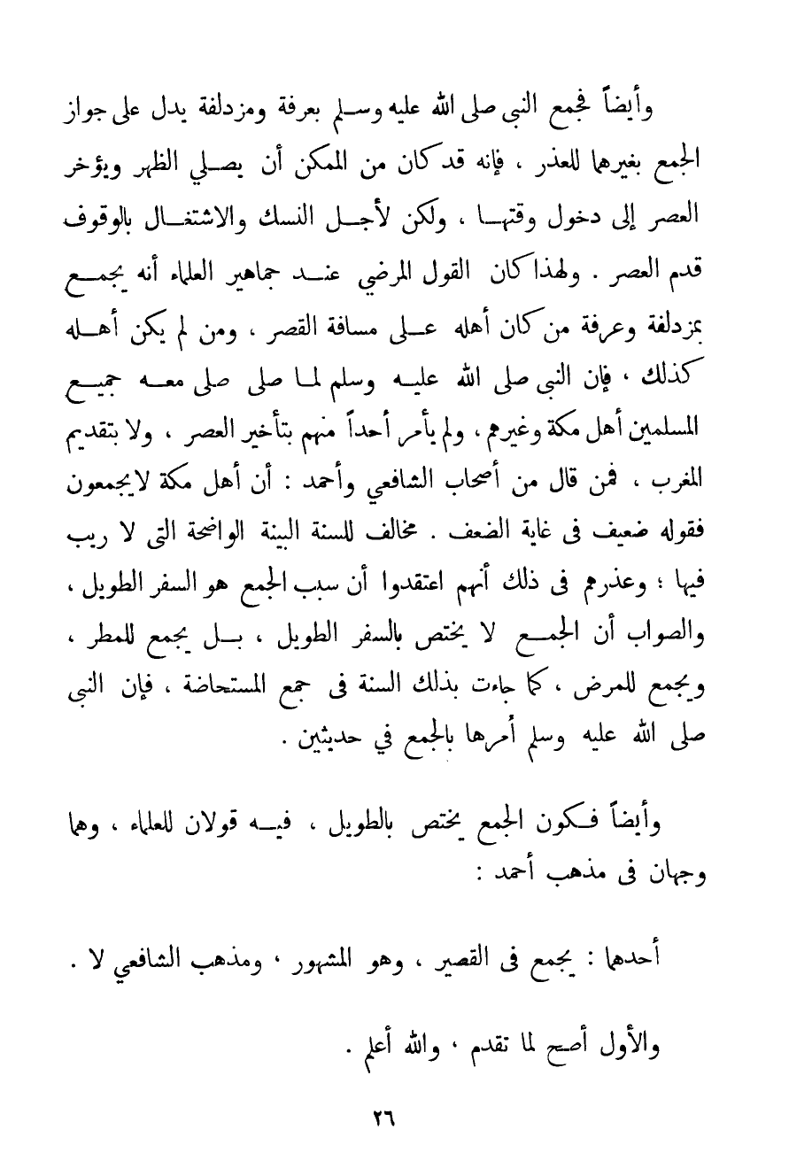 وَأَحْمَد. وَأَيْضًا فَجَمْعُ النَّبِيِّ صَلَّى اللَّهُ عَلَيْهِ وَسَلَّمَ بِعَرَفَةَ وَمُزْدَلِفَةَ يَدُلُّ عَلَى جَوَازِ الْجَمْعِ بِغَيْرِهِمَا لِلْعُذْرِ فَإِنَّهُ قَدْ كَانَ مِنْ الْمُمْكِنِ أَنْ يُصَلِّيَ الظُّهْرَ وَيُؤَخِّرَ الْعَصْرَ إلَى دُخُولِ وَقْتِهَا وَلَكِنْ لِأَجْلِ النُّسُكِ وَالِاشْتِغَالِ بِالْوُقُوفِ قُدِّمَ الْعَصْرُ. وَلِهَذَا كَانَ الْقَوْلُ الْمَرْضِيُّ عِنْدَ جَمَاهِيرِ الْعُلَمَاءِ أَنَّهُ يَجْمَعُ بمزدلفة وَعَرَفَةَ مَنْ كَانَ أَهْلُهُ عَلَى مَسَافَةِ الْقَصْرِ وَمَنْ لَمْ يَكُنْ أَهْلُهُ كَذَلِكَ فَإِنَّ النَّبِيَّ صَلَّى اللَّهُ عَلَيْهِ وَسَلَّمَ لَمَّا صَلَّى صَلَّى مَعَهُ جَمِيعُ الْمُسْلِمِينَ أَهْلُ مَكَّةَ وَغَيْرُهُمْ وَلَمْ يَأْمُرْ أَحَدًا مِنْهُمْ بِتَأْخِيرِ الْعَصْرِ وَلَا بِتَقْدِيمِ الْمَغْرِبِ فَمَنْ قَالَ مِنْ أَصْحَابِ الشَّافِعِيِّ وَأَحْمَد: أَنَّ أَهْلَ مَكَّةَ لَا يَجْمَعُونَ فَقَوْلُهُ ضَعِيفٌ فِي غَايَةِ الضَّعْفِ مُخَالِفٌ لِلسُّنَّةِ الْبَيِّنَةِ الْوَاضِحَةِ الَّتِي لَا رَيْبَ فِيهَا؛ وَعُذْرُهُمْ فِي ذَلِكَ أَنَّهُمْ اعْتَقَدُوا أَنَّ سَبَبَ الْجَمْعِ هُوَ السَّفَرُ الطَّوِيلُ وَالصَّوَابُ أَنَّ الْجَمْعَ لَا يَخْتَصُّ بِالسَّفَرِ الطَّوِيلِ بَلْ يُجْمَعُ لِلْمَطَرِ وَيُجْمَعُ لِلْمَرَضِ كَمَا جَاءَتْ بِذَلِكَ السُّنَّةُ فِي جَمْعِ الْمُسْتَحَاضَةِ فَإِنَّ النَّبِيَّ صَلَّى اللَّهُ عَلَيْهِ وَسَلَّمَ أَمَرَهَا بِالْجَمْعِ فِي حَدِيثَيْنِ. وَأَيْضًا فَكَوْنُ الْجَمْعِ يَخْتَصُّ بِالطَّوِيلِ فِيهِ قَوْلَانِ لِلْعُلَمَاءِ وَهُمَا وَجْهَانِ فِي مَذْهَبِ أَحْمَد: أَحَدُهُمَا: يُجْمَعُ فِي الْقَصِيرِ وَهُوَ الْمَشْهُورُ وَمَذْهَبُ الشَّافِعِيِّ لَا. وَالْأَوَّلُ أَصَحُّ لِمَا تَقَدَّمَ وَاَللَّهُ أَعْلَمُ.