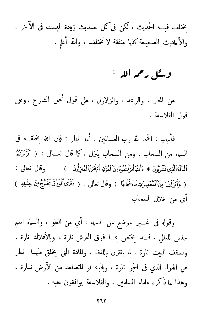 الْحَمْدُ لِلَّهِ رَبِّ الْعَالَمِينَ، أَمَّا الْمَطَرُ: فَإِنَّ اللَّهَ يَخْلُقُهُ فِي السَّمَاءِ مِنْ السَّحَابِ وَمِنْ السَّحَابِ يَنْزِلُ كَمَا قَالَ تَعَالَى: {أَفَرَأَيْتُمُ الْمَاءَ الَّذِي تَشْرَبُونَ} {أَأَنْتُمْ أَنْزَلْتُمُوهُ مِنَ الْمُزْنِ أَمْ نَحْنُ الْمُنْزِلُونَ} وَقَالَ تَعَالَى: {وَأَنْزَلْنَا مِنَ الْمُعْصِرَاتِ مَاءً ثَجَّاجًا} وَقَالَ تَعَالَى: {فَتَرَى الْوَدْقَ يَخْرُجُ مِنْ خِلَالِهِ} أَيْ مِنْ خِلَالِ السَّحَابِ. وَقَوْلُهُ فِي غَيْرِ مَوْضِعٍ مِنْ السَّمَاءِ: أَيْ مِنْ الْعُلُوِّ وَالسَّمَاءُ اسْمُ جِنْسٍ لِلْعَالِي قَدْ يَخْتَصُّ بِمَا فَوْقَ الْعَرْشِ تَارَةً وَبِالْأَفْلَاكِ تَارَةً وَبِسَقْفِ الْبَيْتِ تَارَةً لِمَا يَقْتَرِنُ بِاللَّفْظِ وَالْمَادَّةُ الَّتِي يُخْلَقُ مِنْهَا الْمَطَرُ هِيَ الْهَوَاءُ الَّذِي فِي الْجَوِّ تَارَةً وَبِالْبُخَارِ الْمُتَصَاعِدِ مِنْ الْأَرْضِ تَارَةً وَهَذَا مَا ذَكَرَهُ عُلَمَاءُ الْمُسْلِمِينَ وَالْفَلَاسِفَةُ يُوَافِقُونَ عَلَيْهِ.