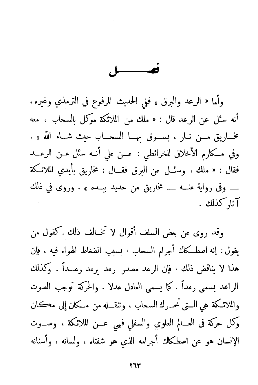 وَأَمَّا " الرَّعْدُ وَالْبَرْقُ " فَفِي الْحَدِيثِ الْمَرْفُوعِ فِي التِّرْمِذِيِّ وَغَيْرِهِ {أَنَّهُ سُئِلَ عَنْ الرَّعْدِ قَالَ: مَلَكٌ مِنْ الْمَلَائِكَةِ مُوَكَّلٌ بِالسَّحَابِ مَعَهُ مخاريق مِنْ نَارٍ يَسُوقُ بِهَا السَّحَابَ حَيْثُ شَاءَ اللَّهُ} . وَفِي مَكَارِمِ الْأَخْلَاقِ للخرائطي: عَنْ عَلِيٍّ أَنَّهُ سُئِلَ عَنْ الرَّعْدِ فَقَالَ: " مَلَكٌ وَسُئِلَ عَنْ الْبَرْقِ فَقَالَ: مخاريق بِأَيْدِي الْمَلَائِكَةِ - وَفِي رِوَايَةٍ عَنْهُ - مخاريق مِنْ حَدِيدٍ بِيَدِهِ ". وَرُوِيَ فِي ذَلِكَ آثَارٌ كَذَلِكَ. وَقَدْ رُوِيَ عَنْ بَعْضِ السَّلَفِ أَقْوَالٌ لَا تُخَالِفُ ذَلِكَ. كَقَوْلِ مَنْ يَقُولُ: إنَّهُ اصْطِكَاكُ أَجْرَامِ السَّحَابِ بِسَبَبِ انْضِغَاطِ الْهَوَاءِ فِيهِ فَإِنَّ هَذَا لَا يُنَاقِضُ ذَلِكَ فَإِنَّ الرَّعْدَ مَصْدَرُ رَعَدَ يَرْعَدُ رَعْدًا. وَكَذَلِكَ الرَّاعِدُ يُسَمَّى رَعْدًا. كَمَا يُسَمَّى الْعَادِلُ عَدْلًا. وَالْحَرَكَةُ تُوجِبُ الصَّوْتَ وَالْمَلَائِكَةُ هِيَ الَّتِي تُحَرِّكُ السَّحَابَ وَتَنْقُلُهُ مِنْ مَكَانٍ إلَى مَكَانٍ وَكُلُّ حَرَكَةٍ فِي الْعَالَمِ الْعُلْوِيِّ وَالسُّفْلِيِّ فَهِيَ عَنْ الْمَلَائِكَةِ وَصَوْتُ الْإِنْسَانِ هُوَ عَنْ اصْطِكَاكِ أَجْرَامِهِ الَّذِي هُوَ شَفَتَاهُ وَلِسَانُهُ وَأَسْنَانُهُ