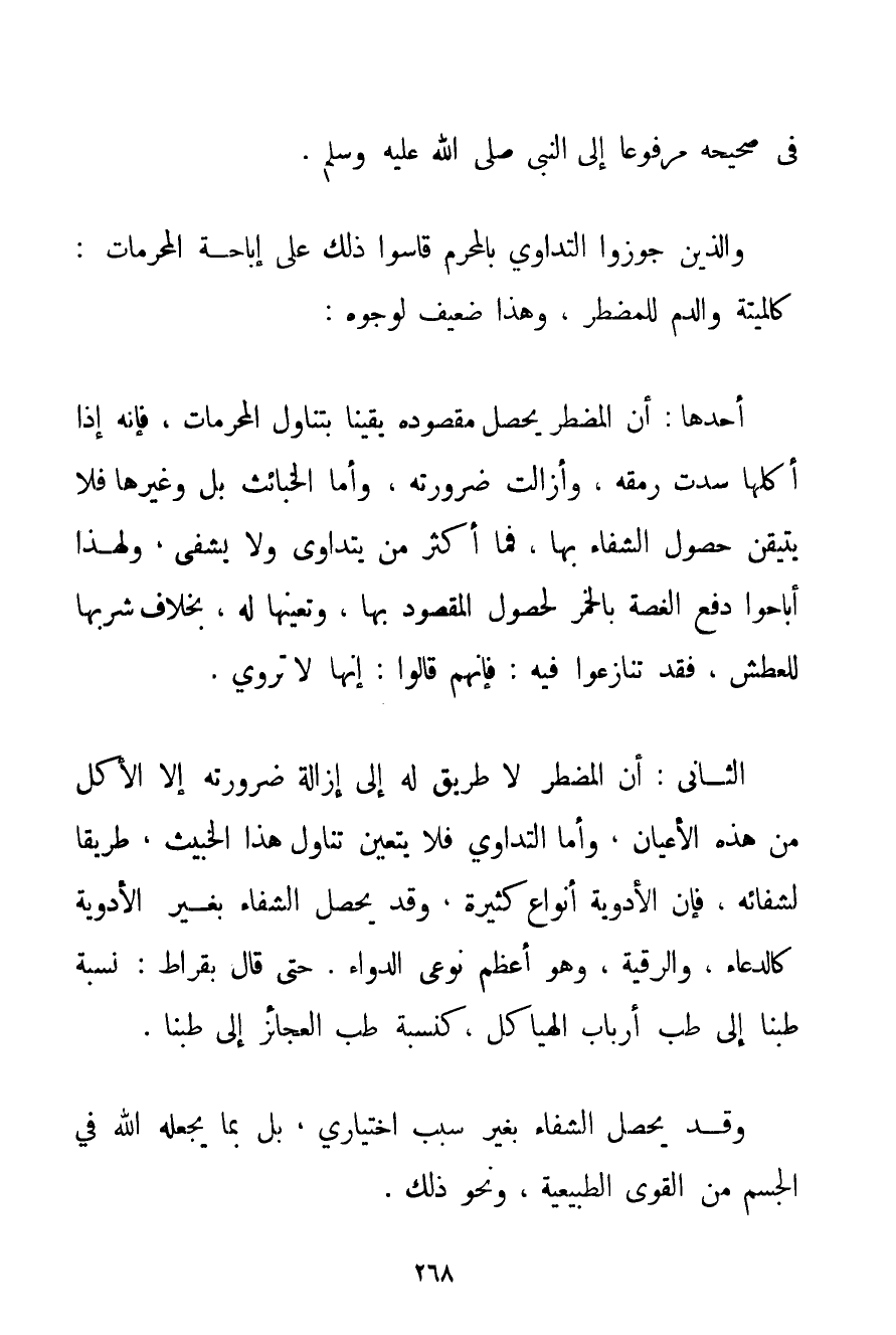 فِي صَحِيحِهِ مَرْفُوعًا إلَى النَّبِيِّ صَلَّى اللَّهُ عَلَيْهِ وَسَلَّمَ. وَاَلَّذِينَ جَوَّزُوا التَّدَاوِي بِالْمُحَرَّمِ قَاسُوا ذَلِكَ عَلَى إبَاحَةِ الْمُحَرَّمَاتِ: كَالْمَيْتَةِ وَالدَّمِ لِلْمُضْطَرِّ وَهَذَا ضَعِيفٌ لِوُجُوهِ: أَحَدُهَا: أَنَّ الْمُضْطَرَّ يَحْصُلُ مَقْصُودُهُ يَقِينًا بِتَنَاوُلِ الْمُحَرَّمَاتِ فَإِنَّهُ إذَا أَكَلَهَا سَدَّتْ رَمَقَهُ وَأَزَالَتْ ضَرُورَتَهُ وَأَمَّا الْخَبَائِثُ بَلْ وَغَيْرُهَا فَلَا يُتَيَقَّنُ حُصُولُ الشِّفَاءِ بِهَا فَمَا أَكْثَرَ مَنْ يَتَدَاوَى وَلَا يُشْفَى وَلِهَذَا أَبَاحُوا دَفْعَ الْغُصَّةِ بِالْخَمْرِ لِحُصُولِ الْمَقْصُودِ بِهَا وَتَعَيُّنِهَا لَهُ بِخِلَافِ شُرْبِهَا لِلْعَطَشِ فَقَدْ تَنَازَعُوا فِيهِ: فَإِنَّهُمْ قَالُوا: إنَّهَا لَا تَرْوِي. الثَّانِي: أَنَّ الْمُضْطَرَّ لَا طَرِيقَ لَهُ إلَى إزَالَةِ ضَرُورَتِهِ إلَّا الْأَكْلُ مِنْ هَذِهِ الْأَعْيَانِ وَأَمَّا التَّدَاوِي فَلَا يَتَعَيَّنُ تَنَاوُلُ هَذَا الْخَبِيثِ طَرِيقًا لِشِفَائِهِ فَإِنَّ الْأَدْوِيَةَ أَنْوَاعٌ كَثِيرَةٌ وَقَدْ يَحْصُلُ الشِّفَاءُ بِغَيْرِ الْأَدْوِيَةِ كَالدُّعَاءِ وَالرُّقْيَةِ وَهُوَ أَعْظَمُ نَوْعَيْ الدَّوَاءِ. حَتَّى قَالَ بقراط: نِسْبَةُ طِبِّنَا إلَى طِبِّ أَرْبَابِ الْهَيَاكِلِ كَنِسْبَةِ طِبِّ الْعَجَائِزِ إلَى طِبِّنَا. وَقَدْ يَحْصُلُ الشِّفَاءُ بِغَيْرِ سَبَبٍ اخْتِيَارِيٍّ بَلْ بِمَا يَجْعَلُهُ اللَّهُ فِي الْجِسْمِ مِنْ الْقُوَى الطَّبِيعِيَّةِ وَنَحْوِ ذَلِكَ.