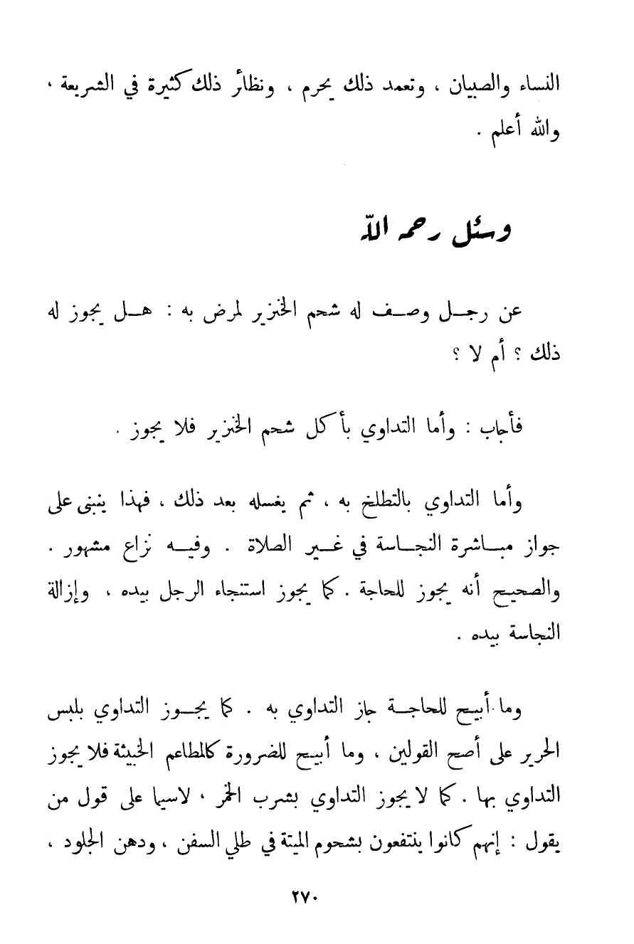 عَنْ رَجُلٍ وُصِفَ لَهُ شَحْمُ الْخِنْزِيرِ لِمَرَضٍ بِهِ: هَلْ يَجُوزُ لَهُ ذَلِكَ؟ أَمْ لَا؟ .