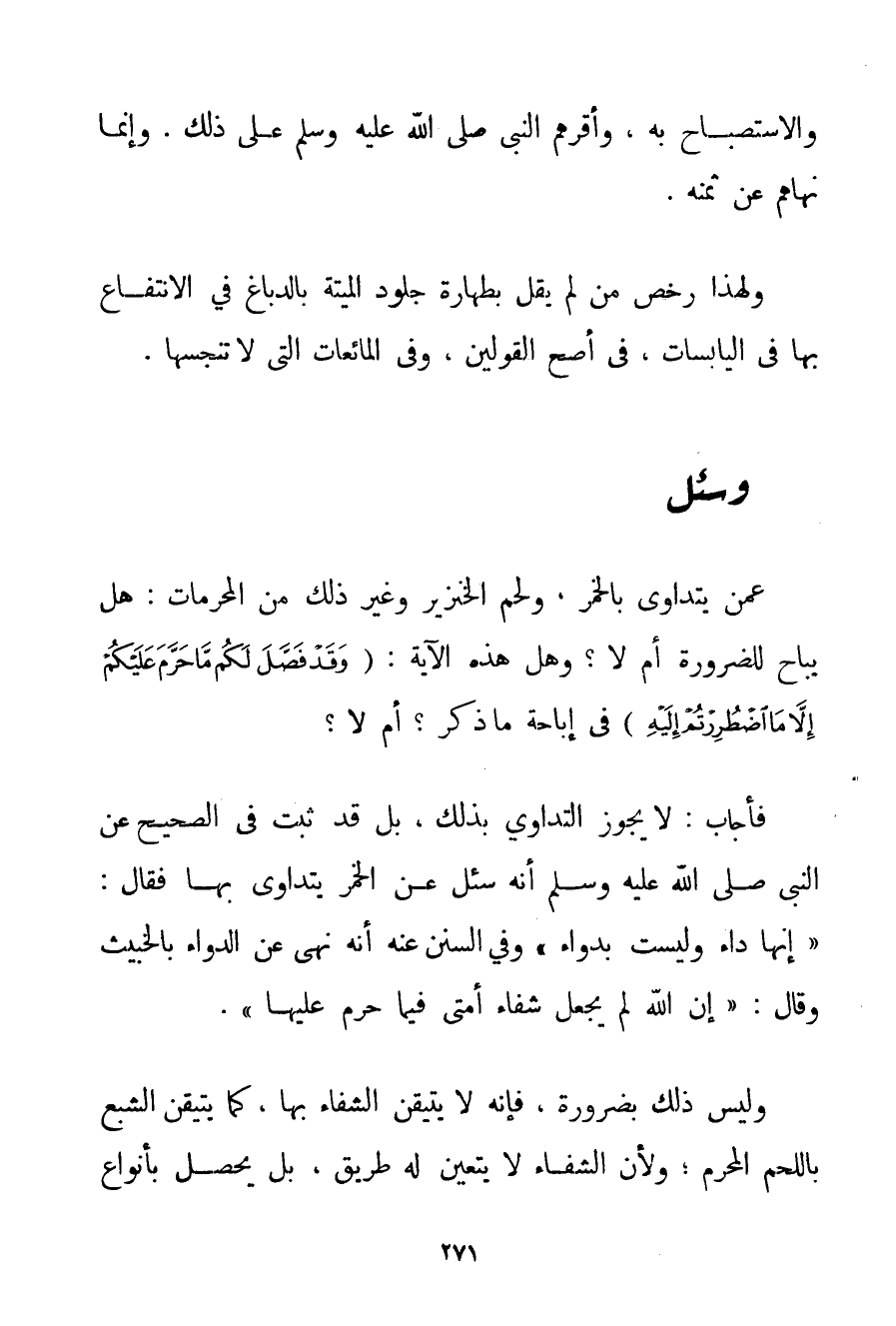 لَا يَجُوزُ التَّدَاوِي بِذَلِكَ بَلْ قَدْ ثَبَتَ فِي الصَّحِيحِ {عَنْ النَّبِيِّ صَلَّى اللَّهُ عَلَيْهِ وَسَلَّمَ أَنَّهُ سُئِلَ عَنْ الْخَمْرِ يُتَدَاوَى بِهَا فَقَالَ: إنَّهَا دَاءٌ وَلَيْسَتْ بِدَوَاءِ} وَفِي السُّنَنِ {عَنْهُ أَنَّهُ نَهَى عَنْ الدَّوَاءِ بِالْخَبِيثِ وَقَالَ: إنَّ اللَّهَ لَمْ يَجْعَلْ شِفَاءَ أُمَّتِي فِيمَا حَرَّمَ عَلَيْهَا} . وَلَيْسَ ذَلِكَ بِضَرُورَةِ فَإِنَّهُ لَا يُتَيَقَّنُ الشِّفَاءُ بِهَا كَمَا يُتَيَقَّنُ الشِّبَعُ بِاللَّحْمِ الْمُحَرَّمِ؛ وَلِأَنَّ الشِّفَاءَ لَا يَتَعَيَّنُ لَهُ طَرِيقٌ بَلْ يَحْصُلُ بِأَنْوَاعِ