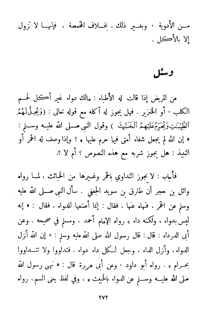 لَا يَجُوزُ التَّدَاوِي بِالْخَمْرِ وَغَيْرِهَا مِنْ الْخَبَائِثِ لِمَا رَوَاهُ وَائِلُ بْنُ حجر {أَنَّ طَارِقَ بْنَ سويد الجعفي. سَأَلَ النَّبِيَّ صَلَّى اللَّهُ عَلَيْهِ وَسَلَّمَ عَنْ الْخَمْرِ فَنَهَاهُ عَنْهَا فَقَالَ: إنَّمَا أَصْنَعُهَا لِلدَّوَاءِ فَقَالَ: إنَّهُ لَيْسَ بِدَوَاءِ وَلَكِنَّهُ دَاءٌ} رَوَاهُ الْإِمَامُ أَحْمَد وَمُسْلِمٌ فِي صَحِيحِهِ. وَعَنْ أَبِي الدَّرْدَاءِ: قَالَ: قَالَ رَسُولُ اللَّهِ صَلَّى اللَّهُ عَلَيْهِ وَسَلَّمَ {إنَّ اللَّهَ أَنْزَلَ الدَّوَاءَ وَأَنْزَلَ الدَّاءَ وَجَعَلَ لِكُلِّ دَاءٍ دَوَاءً فَتَدَاوَوْا وَلَا تَتَدَاوَوْا بِحَرَامِ} . رَوَاهُ أَبُو دَاوُد وَعَنْ أَبِي هُرَيْرَةَ قَالَ: {نَهَى رَسُولُ اللَّهِ صَلَّى اللَّهُ عَلَيْهِ وَسَلَّمَ عَنْ الدَّوَاءِ بِالْخَبِيثِ} وَفِي لَفْظٍ يَعْنِي السُّمَّ رَوَاهُ