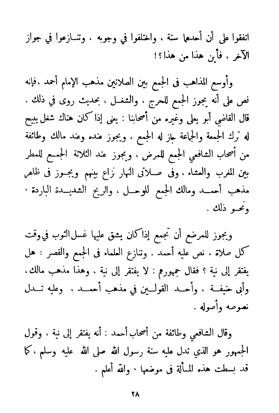 اتَّفَقُوا عَلَى أَنَّ أَحَدَهُمَا سُنَّةٌ وَاخْتَلَفُوا فِي وُجُوبِهِ وَتَنَازَعُوا فِي جَوَازِ الْآخَرِ فَأَيْنَ هَذَا مِنْ هَذَا وَأَوْسَعُ الْمَذَاهِبِ فِي الْجَمْعِ بَيْنَ الصَّلَاتَيْنِ مَذْهَبُ الْإِمَامِ أَحْمَد فَإِنَّهُ نَصَّ عَلَى أَنَّهُ يَجُوزُ الْجَمْعُ لِلْحَرَجِ وَالشُّغْلِ بِحَدِيثِ رُوِيَ فِي ذَلِكَ. قَالَ الْقَاضِي أَبُو يَعْلَى وَغَيْرُهُ مِنْ أَصْحَابِنَا: يَعْنِي إذَا كَانَ هُنَاكَ شُغْلٌ يُبِيحُ لَهُ تَرْكَ الْجُمْعَةِ وَالْجَمَاعَةِ جَازَ لَهُ الْجَمْعُ وَيَجُوزُ عِنْدَهُ وَعِنْدَ مَالِكٍ وَطَائِفَةٍ مِنْ أَصْحَابِ الشَّافِعِيِّ الْجَمْعُ لِلْمَرَضِ وَيَجُوزُ عِنْدَ الثَّلَاثَةِ الْجَمْعُ لِلْمَطَرِ بَيْنَ الْمَغْرِبِ وَالْعِشَاءِ وَفِي صَلَاتَيْ النَّهَارِ نِزَاعٌ بَيْنَهُمْ وَيَجُوزُ فِي ظَاهِرِ مَذْهَبِ أَحْمَد وَمَالِكٍ الْجَمْعُ لِلْوَحْلِ وَالرِّيحِ الشَّدِيدَةِ الْبَارِدَةِ وَنَحْوِ ذَلِكَ. وَيَجُوزُ لِلْمُرْضِعِ أَنْ تَجْمَعَ إذَا كَانَ يَشُقُّ عَلَيْهَا غَسْلُ الثَّوْبِ فِي وَقْتِ كُلِّ صَلَاةٍ نَصَّ عَلَيْهِ أَحْمَد. وَتَنَازَعَ الْعُلَمَاءُ فِي الْجَمْعِ وَالْقَصْرِ: هَلْ يَفْتَقِرُ إلَى نِيَّةٍ؟ فَقَالَ جُمْهُورُهُمْ: لَا يَفْتَقِرُ إلَى نِيَّةٍ وَهَذَا مَذْهَبُ مَالِكٍ وَأَبِي حَنِيفَةَ وَأَحَدُ الْقَوْلَيْنِ فِي مَذْهَبِ أَحْمَد وَعَلَيْهِ تَدُلُّ نُصُوصُهُ وَأُصُولُهُ. وَقَالَ اُ لشافعي وَطَائِفَةٌ مِنْ أَصْحَابِ أَحْمَد: أَنَّهُ يَفْتَقِرُ إلَى نِيَّةٍ وَقَوْلُ الْجُمْهُورِ هُوَ الَّذِي تَدُلُّ عَلَيْهِ سُنَّةُ رَسُولِ اللَّهِ صَلَّى اللَّهُ عَلَيْهِ وَسَلَّمَ كَمَا قَدْ بُسِطَتْ هَذِهِ الْمَسْأَلَةُ فِي مَوْضِعِهَا وَاَللَّهُ أَعْلَمُ.