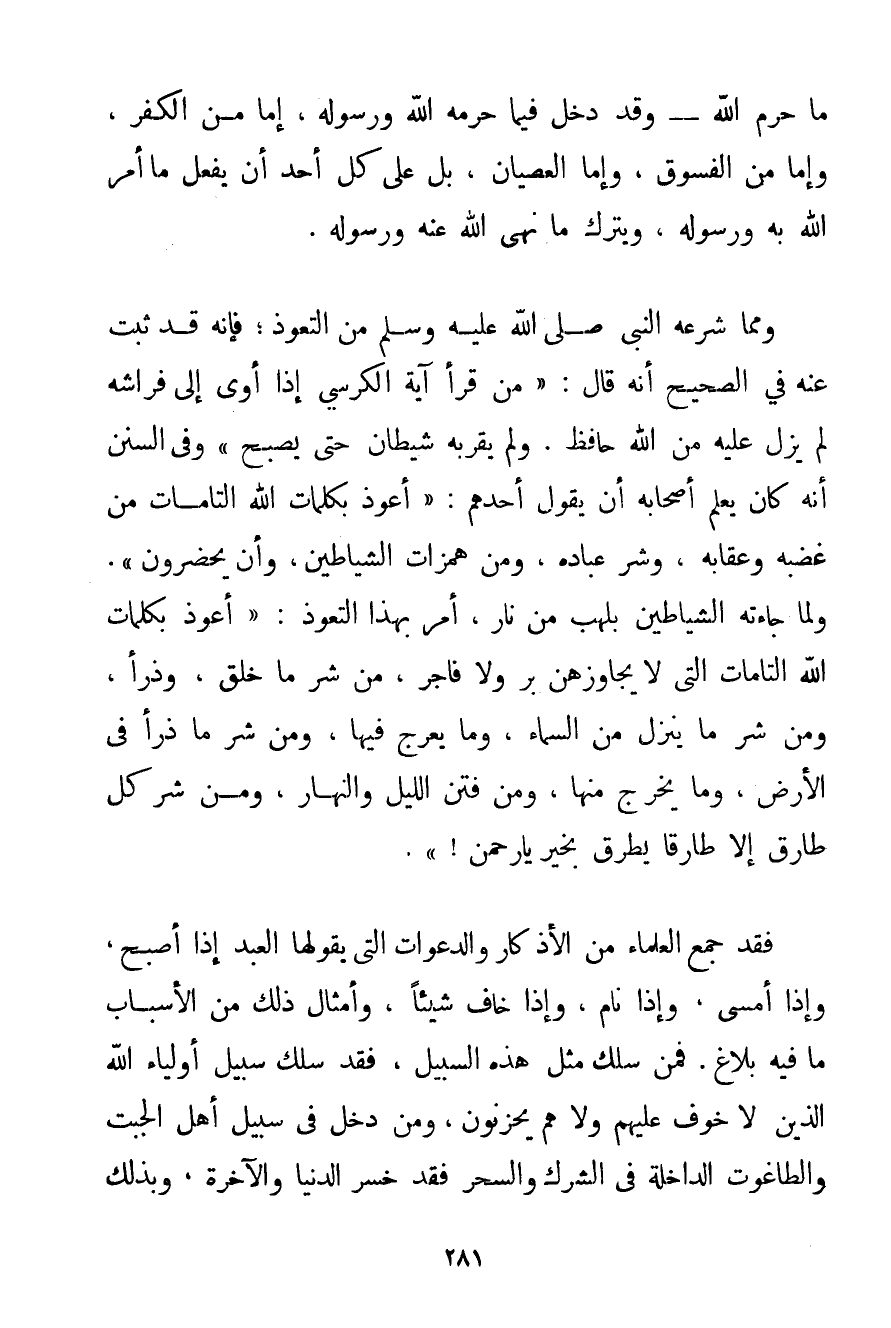 مَا حَرَّمَ اللَّهُ - وَقَدْ دَخَلَ فِيمَا حَرَّمَهُ اللَّهُ وَرَسُولُهُ إمَّا مِنْ الْكُفْرِ وَإِمَّا مِنْ الْفُسُوقِ وَإِمَّا الْعِصْيَانِ بَلْ عَلَى كُلِّ أَحَدٍ أَنْ يَفْعَلَ مَا أَمَرَ اللَّهُ بِهِ وَرَسُولُهُ وَيَتْرُكَ مَا نَهَى اللَّهُ عَنْهُ وَرَسُولُهُ. وَمِمَّا شَرَعَهُ النَّبِيُّ صَلَّى اللَّهُ عَلَيْهِ وَسَلَّمَ مِنْ التَّعَوُّذِ؛ فَإِنَّهُ قَدْ ثَبَتَ عَنْهُ فِي الصَّحِيحِ أَنَّهُ قَالَ: {مَنْ قَرَأَ آيَةَ الْكُرْسِيِّ إذَا أَوَى إلَى فِرَاشِهِ لَمْ يَزَلْ عَلَيْهِ مِنْ اللَّهِ حَافِظٌ. وَلَمْ يَقْرَبْهُ شَيْطَانٌ حَتَّى يُصْبِحَ} وَفِي السُّنَنِ أَنَّهُ كَانَ يُعَلِّمُ أَصْحَابَهُ أَنْ يَقُولَ أَحَدُهُمْ: {أَعُوذُ بِكَلِمَاتِ اللَّهِ التَّامَّاتِ مِنْ غَضَبِهِ وَعِقَابِهِ وَشَرِّ عِبَادِهِ وَمِنْ هَمَزَاتِ الشَّيَاطِينِ وَأَنْ يَحْضُرُونِ} . {وَلَمَّا جَاءَتْهُ الشَّيَاطِينُ بِلَهَبٍ مِنْ نَارٍ أَمَرَ بِهَذَا التَّعَوُّذِ: أَعُوذُ بِكَلِمَاتِ اللَّهِ التَّامَّاتِ الَّتِي لَا يُجَاوِزُهُنَّ بَرٌّ وَلَا فَاجِرٌ مِنْ شَرِّ مَا خَلَقَ وَذَرَأَ وَمِنْ شَرِّ مَا يَنْزِلُ مِنْ السَّمَاءِ وَمَا يَعْرُجُ فِيهَا وَمِنْ شَرِّ مَا ذَرَأَ فِي الْأَرْضِ وَمَا يَخْرُجُ مِنْهَا وَمِنْ فِتَنِ اللَّيْلِ وَالنَّهَارِ وَمِنْ شَرِّ كُلِّ طَارِقٍ إلَّا طَارِقًا يَطْرُقُ بِخَيْرٍ يَا رَحْمَنُ} . فَقَدْ جَمَعَ الْعُلَمَاءُ مِنْ الْأَذْكَارِ وَالدَّعَوَاتِ الَّتِي يَقُولُهَا الْعَبْدُ إذَا أَصْبَحَ وَإِذَا أَمْسَى وَإِذَا نَامَ وَإِذَا خَافَ شَيْئًا وَأَمْثَالِ ذَلِكَ مِنْ الْأَسْبَابِ مَا فِيهِ بَلَاغٌ. فَمَنْ سَلَكَ مِثْلَ هَذِهِ السَّبِيلِ فَقَدْ سَلَكَ سَبِيلَ أَوْلِيَاءِ اللَّهِ الَّذِينَ لَا خَوْفٌ عَلَيْهِمْ وَلَا هُمْ يَحْزَنُونَ وَمَنْ دَخَلَ فِي سَبِيلِ أَهْلِ الْجِبْتِ وَالطَّاغُوتِ الدَّاخِلَةِ فِي الشِّرْكِ وَالسِّحْرِ فَقَدْ خَسِرَ الدُّنْيَا وَالْآخِرَةَ وَبِذَلِكَ ذَمَّ