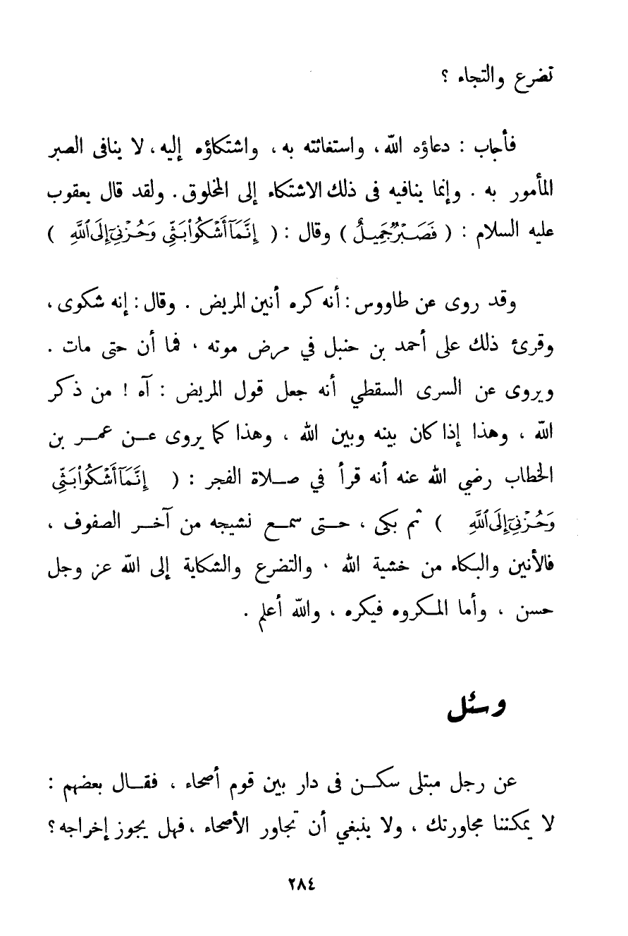 دُعَاؤُهُ اللَّهَ وَاسْتِغَاثَتُهُ بِهِ وَاشْتِكَاؤُهُ إلَيْهِ لَا يُنَافِي الصَّبْرَ الْمَأْمُورَ بِهِ. وَإِنَّمَا يُنَافِيهِ فِي ذَلِكَ الِاشْتِكَاءُ إلَى الْمَخْلُوقِ. وَلَقَدْ قَالَ يَعْقُوبُ عَلَيْهِ السَّلَامُ {فَصَبْرٌ جَمِيلٌ} وَقَالَ: {إنَّمَا أَشْكُو بَثِّي وَحُزْنِي إلَى اللَّهِ.} وَقَدْ رُوِيَ عَنْ طَاوُوسٍ: أَنَّهُ كَرِهَ أَنِينَ الْمَرِيضِ. وَقَالَ: إنَّهُ شَكْوَى وَقُرِئَ ذَلِكَ عَلَى أَحْمَد بْنِ حَنْبَلٍ فِي مَرَضِ مَوْتِهِ فَمَا أَنَّ حَتَّى مَاتَ. وَيُرْوَى عَنْ السُّرِّيِّ السقطي أَنَّهُ جَعَلَ قَوْلَ الْمَرِيضِ: آهْ مِنْ ذِكْرِ اللَّهِ وَهَذَا إذَا كَانَ بَيْنَهُ وَبَيْنَ اللَّهِ وَهَذَا كَمَا يُرْوَى عَنْ عُمَرَ بْنِ الْخَطَّابِ رَضِيَ اللَّهُ عَنْهُ أَنَّهُ قَرَأَ فِي صَلَاةِ الْفَجْرِ: {إنَّمَا أَشْكُو بَثِّي وَحُزْنِي إلَى اللَّهِ} ثُمَّ بَكَى حَتَّى سُمِعَ نَشِيجُهُ مِنْ آخِرِ الصُّفُوفِ فَالْأَنِينُ وَالْبُكَاءُ مِنْ خَشْيَةِ اللَّهِ وَالتَّضَرُّعُ وَالشِّكَايَةُ إلَى اللَّهِ عَزَّ وَجَلَّ حَسَنٌ وَأَمَّا الْمَكْرُوهُ فَيُكْرَهُ وَاَللَّهُ أَعْلَمُ.