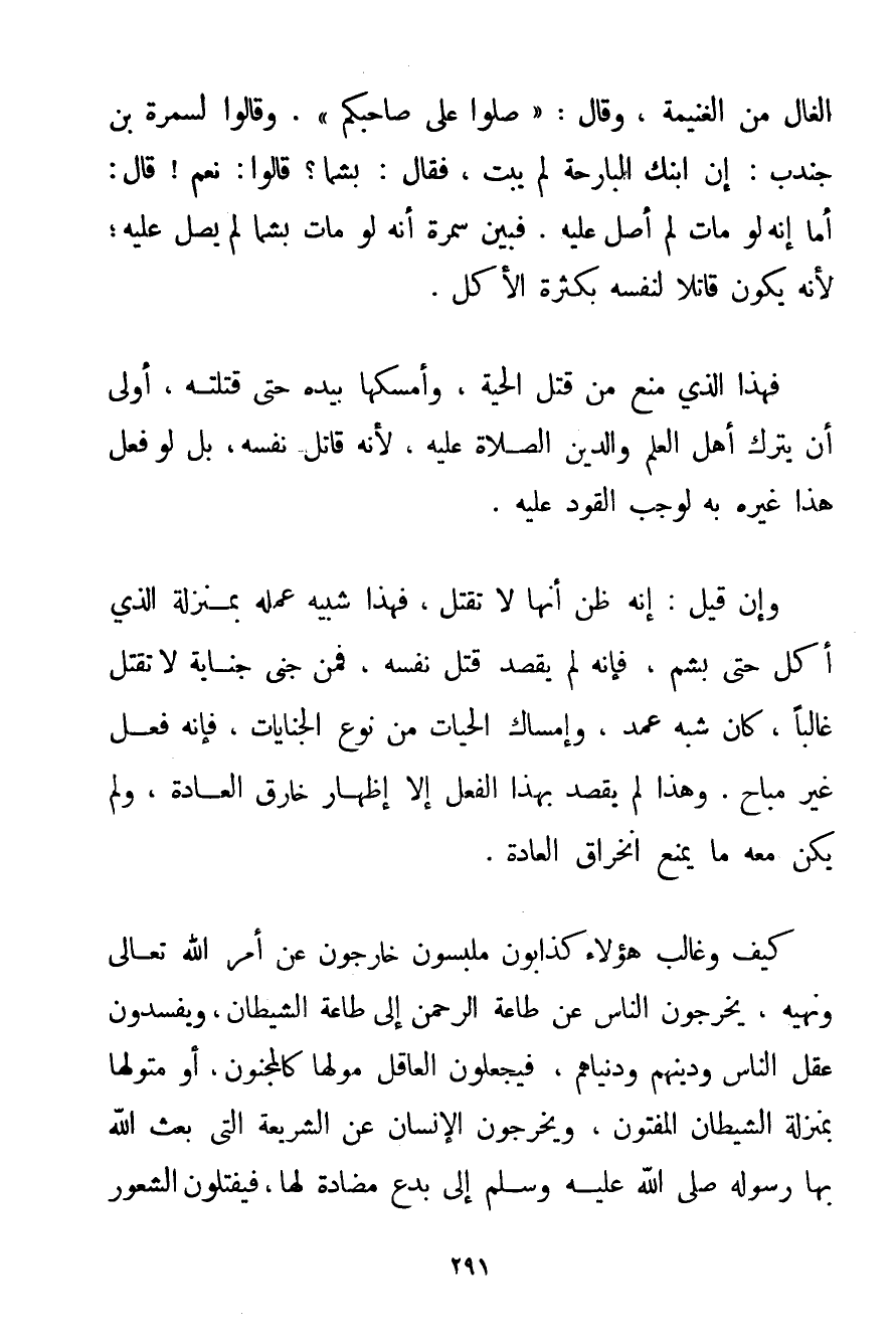 الْغَالِّ مِنْ الْغَنِيمَةِ وَقَالَ: صَلُّوا عَلَى صَاحِبِكُمْ} . وَقَالُوا لسمرة بْنِ جُنْدُبٍ: إنَّ ابْنَك الْبَارِحَةَ لَمْ يَبِتْ فَقَالَ: بَشَمًا؟ قَالُوا: نَعَمْ قَالَ: أَمَا إنَّهُ لَوْ مَاتَ لَمْ أُصَلِّ عَلَيْهِ، فَبَيَّنَ سَمُرَةُ أَنَّهُ لَوْ مَاتَ بَشَمًا لَمْ يُصَلِّ عَلَيْهِ؛ لِأَنَّهُ يَكُونُ قَاتِلًا لِنَفْسِهِ بِكَثْرَةِ الْأَكْلِ. فَهَذَا الَّذِي مَنَعَ مِنْ قَتْلِ الْحَيَّةِ وَأَمْسَكَهَا بِيَدِهِ حَتَّى قَتَلَتْهُ أَوْلَى أَنْ يَتْرُكَ أَهْلُ الْعِلْمِ وَالدِّينِ الصَّلَاةَ عَلَيْهِ لِأَنَّهُ قَاتِلُ نَفْسِهِ بَلْ لَوْ فَعَلَ هَذَا غَيْرُهُ بِهِ لَوَجَبَ الْقَوَدُ عَلَيْهِ. وَإِنْ قِيلَ: إنَّهُ ظَنَّ أَنَّهَا لَا تَقْتُلُ فَهَذَا شَبِيهُ عَمَلِهِ بِمَنْزِلَةِ الَّذِي أَكَلَ حَتَّى بَشَمَ فَإِنَّهُ لَمْ يَقْصِدْ قَتْلَ نَفْسِهِ فَمَنْ جَنَى جِنَايَةً لَا تَقْتُلُ غَالِبًا كَانَ شِبْهَ عَمْدٍ وَإِمْسَاكُ الْحَيَّاتِ مِنْ نَوْعِ الْجِنَايَاتِ فَإِنَّهُ فِعْلٌ غَيْرُ مُبَاحٍ. وَهَذَا لَمْ يَقْصِدْ بِهَذَا الْفِعْلِ إلَّا إظْهَارَ خَارِقِ الْعَادَةِ وَلَمْ يَكُنْ مَعَهُ مَا يَمْنَعُ انْخِرَاقَ الْعَادَةِ. كَيْفَ وَغَالِبُ هَؤُلَاءِ كَذَّابُونَ مُلْبِسُونَ خَارِجُونَ عَنْ أَمْرِ اللَّهِ تَعَالَى وَنَهْيِهِ يُخْرِجُونَ النَّاسَ عَنْ طَاعَةِ الرَّحْمَنِ إلَى طَاعَةِ الشَّيْطَانِ وَيُفْسِدُونَ عَقْلَ النَّاسِ وَدِينَهُمْ وَدُنْيَاهُمْ فَيَجْعَلُونَ الْعَاقِلَ مُولَهًا كَالْمَجْنُونِ أَوْ مُتَوَلِّهًا بِمَنْزِلَةِ الشَّيْطَانِ الْمَفْتُونِ وَيُخْرِجُونَ الْإِنْسَانَ عَنْ الشَّرِيعَةِ الَّتِي بَعَثَ اللَّهُ بِهَا رَسُولَهُ صَلَّى اللَّهُ عَلَيْهِ وَسَلَّمَ إلَى بِدَعٍ مُضَادَّةٍ لَهَا فَيَفْتِلُونَ الشُّعُورَ