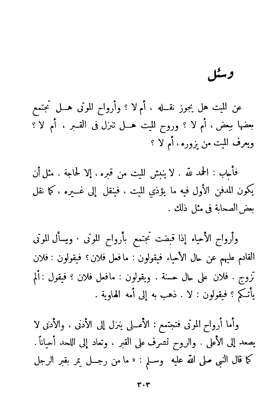 عَنْ الْمَيِّتِ هَلْ يَجُوزُ نَقْلُهُ أَمْ لَا؟ وَأَرْوَاحُ الْمَوْتَى هَلْ تَجْتَمِعُ بَعْضُهَا بِبَعْضِ أَمْ لَا؟ وَرُوحُ الْمَيِّتِ هَلْ تَنْزِلُ فِي الْقَبْرِ أَمْ لَا؟ وَيَعْرِفُ الْمَيِّتُ مَنْ يَزُورُهُ أَمْ لَا؟