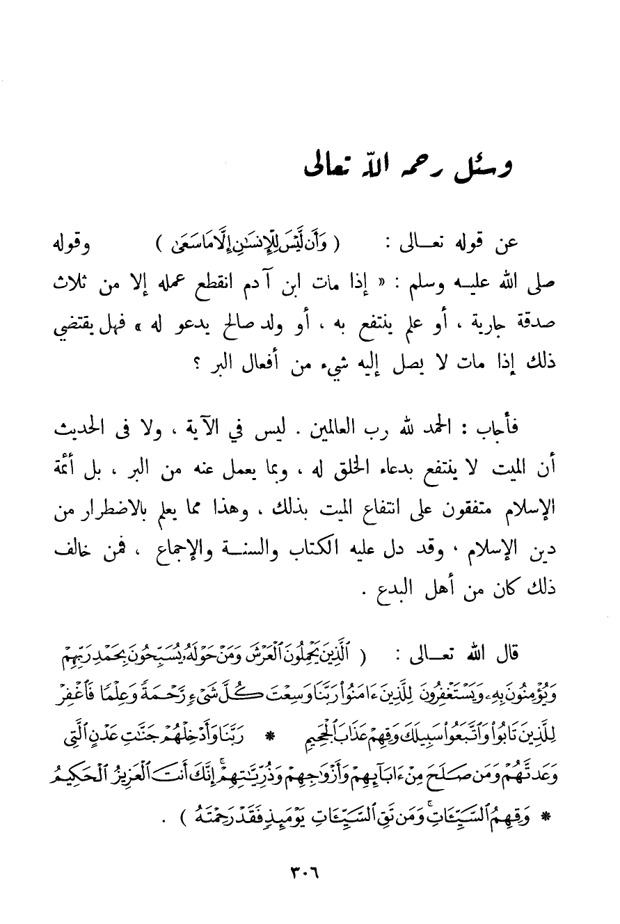 الْحَمْدُ لِلَّهِ رَبِّ الْعَالَمِينَ، لَيْسَ فِي الْآيَةِ وَلَا فِي الْحَدِيثِ أَنَّ الْمَيِّتَ لَا يَنْتَفِعُ بِدُعَاءِ الْخَلْقِ لَهُ وَبِمَا يُعْمَلُ عَنْهُ مِنْ الْبِرِّ بَلْ أَئِمَّةُ الْإِسْلَامِ مُتَّفِقُونَ عَلَى انْتِفَاعِ الْمَيِّتِ بِذَلِكَ وَهَذَا مِمَّا يُعْلَمُ بِالِاضْطِرَارِ مِنْ دِينِ الْإِسْلَامِ وَقَدْ دَلَّ عَلَيْهِ الْكِتَابُ وَالسُّنَّةُ وَالْإِجْمَاعُ فَمَنْ خَالَفَ ذَلِكَ كَانَ مِنْ أَهْلِ الْبِدَعِ. قَالَ اللَّهُ تَعَالَى: {الَّذِينَ يَحْمِلُونَ الْعَرْشَ وَمَنْ حَوْلَهُ يُسَبِّحُونَ بِحَمْدِ رَبِّهِمْ وَيُؤْمِنُونَ بِهِ وَيَسْتَغْفِرُونَ لِلَّذِينَ آمَنُوا رَبَّنَا وَسِعْتَ كُلَّ شَيْءٍ رَحْمَةً وَعِلْمًا فَاغْفِرْ لِلَّذِينَ تَابُوا وَاتَّبَعُوا سَبِيلَكَ وَقِهِمْ عَذَابَ الْجَحِيمِ} {رَبَّنَا وَأَدْخِلْهُمْ جَنَّاتِ عَدْنٍ الَّتِي وَعَدْتَهُمْ وَمَنْ صَلَحَ مِنْ آبَائِهِمْ وَأَزْوَاجِهِمْ وَذُرِّيَّاتِهِمْ إنَّكَ أَنْتَ الْعَزِيزُ الْحَكِيمُ} {وَقِهِمُ