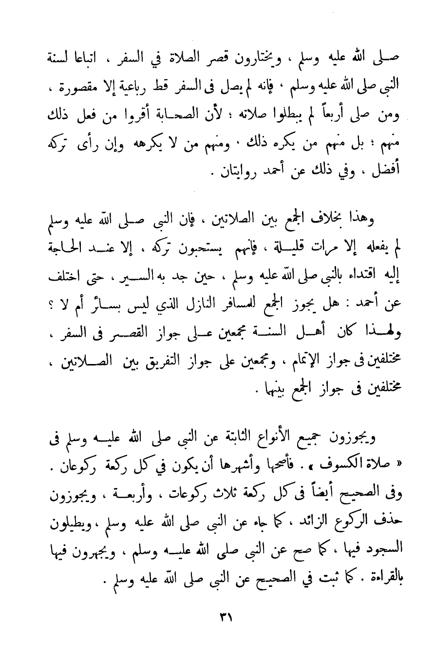 صَلَّى اللَّهُ عَلَيْهِ وَسَلَّمَ وَيَخْتَارُونَ قَصْرَ الصَّلَاةِ فِي السَّفَرِ اتِّبَاعًا لِسُنَّةِ النَّبِيِّ صَلَّى اللَّهُ عَلَيْهِ وَسَلَّمَ فَإِنَّهُ لَمْ يُصَلِّ فِي السَّفَرِ قَطُّ رُبَاعِيَّةً إلَّا مَقْصُورَةً وَمَنْ صَلَّى أَرْبَعًا لَمْ يُبْطِلُوا صَلَاتَهُ؛ لِأَنَّ الصَّحَابَةَ أَقَرُّوا مَنْ فَعَلَ ذَلِكَ مِنْهُمْ؛ بَلْ مِنْهُمْ مَنْ يَكْرَهُ ذَلِكَ وَمِنْهُمْ مَنْ لَا يَكْرَهُهُ وَإِنْ رَأَى تَرْكَهُ أَفْضَلَ وَفِي ذَلِكَ عَنْ أَحْمَد رِوَايَتَانِ. وَهَذَا بِخِلَافِ الْجَمْعِ بَيْنَ الصَّلَاتَيْنِ فَإِنَّ النَّبِيَّ صَلَّى اللَّهُ عَلَيْهِ وَسَلَّمَ لَمْ يَفْعَلْهُ إلَّا مَرَّاتٍ قَلِيلَةً فَإِنَّهُمْ يَسْتَحِبُّونَ تَرْكَهُ إلَّا عِنْدَ الْحَاجَةِ إلَيْهِ اقْتِدَاءً بِالنَّبِيِّ صَلَّى اللَّهُ عَلَيْهِ وَسَلَّمَ حِينَ جَدَّ بِهِ السَّيْرُ حَتَّى اُخْتُلِفَ عَنْ أَحْمَد: هَلْ يَجُوزُ الْجَمْعُ لِلْمُسَافِرِ النَّازِلِ الَّذِي لَيْسَ بِسَائِرٍ أَمْ لَا؟ وَلِهَذَا كَانَ أَهْلُ السُّنَّةِ مُجْمِعِينَ عَلَى جَوَازِ الْقَصْرِ فِي السَّفَرِ مُخْتَلِفِينَ فِي جَوَازِ الْإِتْمَامِ وَمُجْمِعِينَ عَلَى جَوَازِ التَّفْرِيقِ بَيْنَ الصَّلَاتَيْنِ مُخْتَلِفِينَ فِي جَوَازِ الْجَمْعِ بَيْنَهُمَا. وَيُجَوِّزُونَ جَمِيعَ الْأَنْوَاعِ الثَّابِتَةِ عَنْ النَّبِيِّ صَلَّى اللَّهُ عَلَيْهِ وَسَلَّمَ فِي " صَلَاةِ الْكُسُوفِ ". فَأَصَحُّهَا وَأَشْهَرُهَا أَنْ يَكُونَ فِي كُلِّ رَكْعَةٍ رُكُوعَانِ. وَفِي الصَّحِيحِ أَيْضًا فِي كُلِّ رَكْعَةٍ ثَلَاثُ ركوعات وَأَرْبَعَةٌ وَيُجَوِّزُونَ حَذْفَ الرُّكُوعِ الزَّائِدِ كَمَا جَاءَ عَنْ النَّبِيِّ صَلَّى اللَّهُ عَلَيْهِ وَسَلَّمَ وَيُطِيلُونَ السُّجُودَ فِيهَا كَمَا صَحَّ عَنْ النَّبِيِّ صَلَّى اللَّهُ عَلَيْهِ وَسَلَّمَ وَيَجْهَرُونَ فِيهَا بِالْقِرَاءَةِ. كَمَا ثَبَتَ فِي الصَّحِيحِ عَنْ النَّبِيِّ صَلَّى اللَّهُ عَلَيْهِ وَسَلَّمَ.
