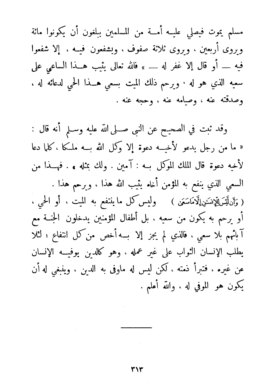 مُسْلِمٍ يَمُوتُ فَيُصَلِّي عَلَيْهِ أُمَّةٌ مِنْ الْمُسْلِمِينَ يَبْلُغُونَ أَنْ يَكُونُوا مِائَةً وَيُرْوَى أَرْبَعِينَ وَيُرْوَى ثَلَاثَةَ صُفُوفٍ وَيُشَفَّعُونَ فِيهِ إلَّا شُفِّعُوا فِيهِ - أَوْ قَالَ إلَّا غُفِرَ لَهُ -} فَاَللَّهُ تَعَالَى يُثِيبُ هَذَا السَّاعِيَ عَلَى سَعْيِهِ الَّذِي هُوَ لَهُ وَيَرْحَمُ ذَلِكَ الْمَيِّتَ بِسَعْيِ هَذَا الْحَيِّ لِدُعَائِهِ لَهُ وَصَدَقَتِهِ عَنْهُ وَصِيَامِهِ عَنْهُ وَحَجِّهِ عَنْهُ. وَقَدْ ثَبَتَ فِي الصَّحِيحِ عَنْ النَّبِيِّ صَلَّى اللَّهُ عَلَيْهِ وَسَلَّمَ أَنَّهُ قَالَ: {مَا مِنْ رَجُلٍ يَدْعُو لِأَخِيهِ دَعْوَةً إلَّا وَكَّلَ اللَّهُ بِهِ مَلَكًا كُلَّمَا دَعَا لِأَخِيهِ دَعْوَةً قَالَ الْمَلَكُ الْمُوَكَّلُ بِهِ: آمِينَ، وَلَك بِمِثْلِهِ} . فَهَذَا مِنْ السَّعْيِ الَّذِي يَنْفَعُ بِهِ الْمُؤْمِنُ أَخَاهُ يُثِيبُ اللَّهُ هَذَا وَيَرْحَمُ هَذَا، {وَأَنْ لَيْسَ لِلْإِنْسَانِ إلَّا مَا سَعَى} وَلَيْسَ كُلُّ مَا يَنْتَفِعُ بِهِ الْمَيِّتُ أَوْ الْحَيُّ أَوْ يُرْحَمُ بِهِ يَكُونُ مِنْ سَعْيِهِ بَلْ أَطْفَالُ الْمُؤْمِنِينَ يَدْخُلُونَ الْجَنَّةَ مَعَ آبَائِهِمْ بِلَا سَعْيٍ فَاَلَّذِي لَمْ يَجُزْ إلَّا بِهِ أَخَصُّ مِنْ كُلِّ انْتِفَاعٍ؛ لِئَلَّا يَطْلُبَ الْإِنْسَانُ الثَّوَابَ عَلَى غَيْرِ عَمَلِهِ وَهُوَ كَالدَّيْنِ يُوَفِّيهِ الْإِنْسَانُ عَنْ غَيْرِهِ فَتَبْرَأُ ذِمَّتُهُ لَكِنْ لَيْسَ لَهُ مَا وَفَّى بِهِ الدَّيْنَ وَيَنْبَغِي لَهُ أَنْ يَكُونَ هُوَ الْمُوَفِّي لَهُ وَاَللَّهُ أَعْلَمُ.