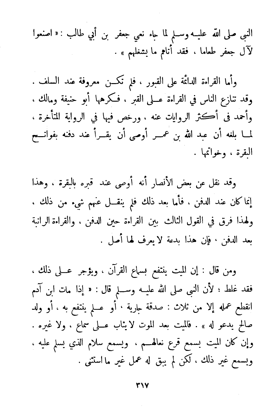 النَّبِيُّ صَلَّى اللَّهُ عَلَيْهِ وَسَلَّمَ لَمَّا جَاءَ نَعْيُ جَعْفَرِ بْنِ أَبِي طَالِبٍ: {اصْنَعُوا لِآلِ جَعْفَرٍ طَعَامًا فَقَدْ أَتَاهُمْ مَا يَشْغَلُهُمْ} . وَأَمَّا الْقِرَاءَةُ الدَّائِمَةُ عَلَى الْقُبُورِ فَلَمْ تَكُنْ مَعْرُوفَةً عِنْدَ السَّلَفِ.