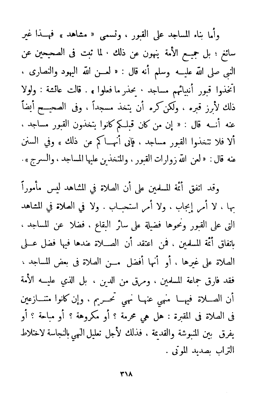 وَأَمَّا بِنَاءُ الْمَسَاجِدِ عَلَى الْقُبُورِ وَتُسَمَّى " مَشَاهِدَ " فَهَذَا غَيْرُ سَائِغٍ؛ بَلْ جَمِيعُ الْأُمَّةِ يَنْهَوْنَ عَنْ ذَلِكَ لِمَا ثَبَتَ فِي الصَّحِيحَيْنِ عَنْ النَّبِيِّ صَلَّى اللَّهُ عَلَيْهِ وَسَلَّمَ أَنَّهُ قَالَ: {لَعَنَ اللَّهُ الْيَهُودَ وَالنَّصَارَى اتَّخَذُوا قُبُورَ أَنْبِيَائِهِمْ مَسَاجِدَ يُحَذِّرُ مَا فَعَلُوا} . قَالَتْ عَائِشَةُ: وَلَوْلَا ذَلِكَ لَأُبْرِزَ قَبْرُهُ وَلَكِنْ كُرِهَ أَنْ يُتَّخَذَ مَسْجِدًا وَفِي الصَّحِيحِ أَيْضًا عَنْهُ أَنَّهُ قَالَ: {إنَّ مَنْ كَانَ قَبْلَكُمْ كَانُوا يَتَّخِذُونَ الْقُبُورَ مَسَاجِدَ أَلَا فَلَا تَتَّخِذُوا الْقُبُورَ مَسَاجِدَ فَإِنِّي أَنْهَاكُمْ عَنْ ذَلِكَ} وَفِي السُّنَنِ عَنْهُ قَالَ: {لَعَنَ اللَّهُ زَوَّارَاتِ الْقُبُورِ وَالْمُتَّخِذِينَ عَلَيْهَا الْمَسَاجِدَ وَالسُّرُجَ} . وَقَدْ اتَّفَقَ أَئِمَّةُ الْمُسْلِمِينَ عَلَى أَنَّ الصَّلَاةَ فِي الْمَشَاهِدِ لَيْسَ مَأْمُورًا بِهَا لَا أَمْرَ إيجَابٍ وَلَا أَمْرَ اسْتِحْبَابٍ. وَلَا فِي الصَّلَاةِ فِي الْمَشَاهِدِ الَّتِي عَلَى الْقُبُورِ وَنَحْوِهَا فَضِيلَةٌ عَلَى سَائِرِ الْبِقَاعِ فَضْلًا عَنْ الْمَسَاجِدِ بِاتِّفَاقِ أَئِمَّةِ الْمُسْلِمِينَ فَمَنْ اعْتَقَدَ أَنَّ الصَّلَاةَ عِنْدَهَا فِيهَا فَضْلٌ عَلَى الصَّلَاةِ عَلَى غَيْرِهَا أَوْ أَنَّهَا أَفْضَلُ مِنْ الصَّلَاةِ فِي بَعْضِ الْمَسَاجِدِ فَقَدْ فَارَقَ جَمَاعَةَ الْمُسْلِمِينَ وَمَرَقَ مِنْ الدِّينِ بَلْ الَّذِي عَلَيْهِ الْأُمَّةُ أَنَّ الصَّلَاةَ فِيهَا مَنْهِيٌّ عَنْهَا نَهْيَ تَحْرِيمٍ وَإِنْ كَانُوا مُتَنَازِعِينَ فِي الصَّلَاةِ فِي الْمَقْبَرَةِ: هَلْ هِيَ مُحَرَّمَةٌ؟ أَوْ مَكْرُوهَةٌ؟ أَوْ مُبَاحَةٌ؟ أَوْ يُفَرَّقُ بَيْنَ الْمَنْبُوشَةِ وَالْقَدِيمَةِ فَذَلِكَ لِأَجْلِ تَعْلِيلِ النَّهْيِ بِالنَّجَاسَةِ لِاخْتِلَاطِ التُّرَابِ بِصَدِيدِ الْمَوْتَى.
