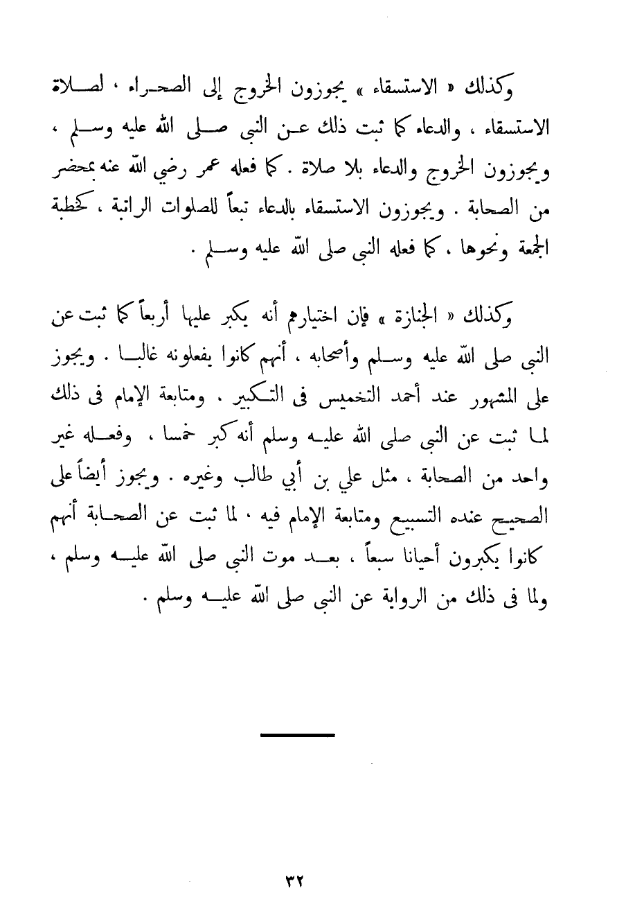 وَكَذَلِكَ " الِاسْتِسْقَاءُ " يُجَوِّزُونَ الْخُرُوجَ إلَى الصَّحْرَاءِ لِصَلَاةِ الِاسْتِسْقَاءِ وَالدُّعَاءِ كَمَا ثَبَتَ ذَلِكَ عَنْ النَّبِيِّ صَلَّى اللَّهُ عَلَيْهِ وَسَلَّمَ وَيُجَوِّزُونَ الْخُرُوجَ وَالدُّعَاءَ بِلَا صَلَاةٍ. كَمَا فَعَلَهُ عُمَرُ رَضِيَ اللَّهُ عَنْهُ بِمَحْضَرٍ مِنْ الصَّحَابَةِ. وَيُجَوِّزُونَ الِاسْتِسْقَاءَ بِالدُّعَاءِ تَبَعًا لِلصَّلَوَاتِ الرَّاتِبَةِ كَخُطْبَةِ الْجُمْعَةِ وَنَحْوِهَا كَمَا فَعَلَهُ النَّبِيُّ صَلَّى اللَّهُ عَلَيْهِ وَسَلَّمَ. وَكَذَلِكَ " الْجِنَازَةُ " فَإِنَّ اخْتِيَارَهُمْ أَنَّهُ يُكَبَّرُ عَلَيْهَا أَرْبَعًا كَمَا ثَبَتَ عَنْ النَّبِيِّ صَلَّى اللَّهُ عَلَيْهِ وَسَلَّمَ وَأَصْحَابِهِ أَنَّهُمْ كَانُوا يَفْعَلُونَهُ غَالِبًا. وَيَجُوزُ عَلَى الْمَشْهُورِ عِنْدَ أَحْمَد التَّخْمِيسُ فِي التَّكْبِيرِ وَمُتَابَعَةُ الْإِمَامِ فِي ذَلِكَ لِمَا ثَبَتَ عَنْ النَّبِيِّ صَلَّى اللَّهُ عَلَيْهِ وَسَلَّمَ أَنَّهُ كَبَّرَ خَمْسًا وَفَعَلَهُ غَيْرُ وَاحِدٍ مِنْ الصَّحَابَةِ مِثْلُ عَلِيِّ بْنِ أَبِي طَالِبٍ وَغَيْرِهِ. وَيَجُوزُ أَيْضًا عَلَى الصَّحِيحِ عِنْدَهُ التَّسْبِيعُ وَمُتَابَعَةُ الْإِمَامِ فِيهِ لِمَا ثَبَتَ عَنْ الصَّحَابَةِ أَنَّهُمْ كَانُوا يُكَبِّرُونَ أَحْيَانًا سَبْعًا بَعْدَ مَوْتِ النَّبِيِّ صَلَّى اللَّهُ عَلَيْهِ وَسَلَّمَ وَلِمَا فِي ذَلِكَ مِنْ الرِّوَايَةِ عَنْ النَّبِيِّ صَلَّى اللَّهُ عَلَيْهِ وَسَلَّمَ.