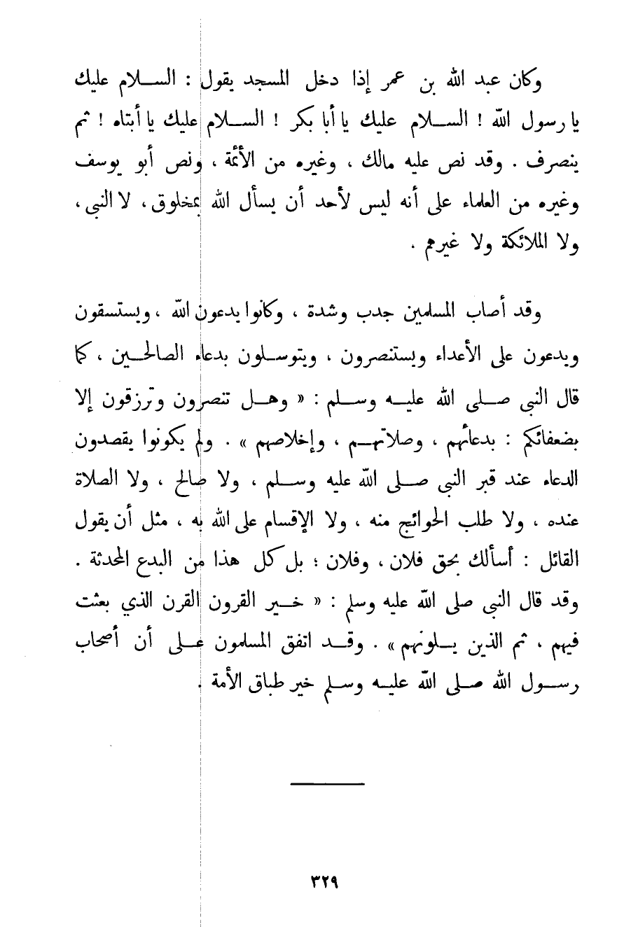 وَكَانَ عَبْدُ اللَّهِ بْنُ عُمَرَ إذَا دَخَلَ الْمَسْجِدَ يَقُولُ: السَّلَامُ عَلَيْك يَا رَسُولَ اللَّهِ السَّلَامُ عَلَيْك يَا أَبَا بَكْرٍ السَّلَامُ عَلَيْك يَا أَبَتَاهُ ثُمَّ يَنْصَرِفُ، وَقَدْ نَصَّ عَلَيْهِ مَالِكٌ وَغَيْرُهُ مِنْ الْأَئِمَّةِ وَنَصَّ أَبُو يُوسُف وَغَيْرُهُ مِنْ الْعُلَمَاءِ عَلَى أَنَّهُ لَيْسَ لِأَحَدٍ أَنْ يَسْأَلَ اللَّهَ بِمَخْلُوقِ لَا النَّبِيِّ وَلَا الْمَلَائِكَةِ وَلَا غَيْرِهِمْ. وَقَدْ أَصَابَ الْمُسْلِمِينَ جَدْبٌ وَشِدَّةٌ وَكَانُوا يَدْعُونَ اللَّهَ وَيَسْتَسْقُونَ وَيَدْعُونَ عَلَى الْأَعْدَاءِ وَيَسْتَنْصِرُونَ وَيَتَوَسَّلُونَ بِدُعَاءِ الصَّالِحِينَ كَمَا قَالَ النَّبِيُّ صَلَّى اللَّهُ عَلَيْهِ وَسَلَّمَ {وَهَلْ تُنْصَرُونَ وَتُرْزَقُونَ إلَّا بِضُعَفَائِكُمْ: بِدُعَائِهِمْ وَصَلَاتِهِمْ وَإِخْلَاصِهِمْ} . وَلَمْ يَكُونُوا يَقْصِدُونَ الدُّعَاءَ عِنْدَ قَبْرِ النَّبِيِّ صَلَّى اللَّهُ عَلَيْهِ وَسَلَّمَ وَلَا صَالِحٍ وَلَا الصَّلَاةَ عِنْدَهُ وَلَا طَلَبَ الْحَوَائِجِ مِنْهُ وَلَا الْإِقْسَامَ عَلَى اللَّهِ بِهِ مِثْلَ أَنْ يَقُولَ الْقَائِلُ: أَسْأَلُك بِحَقِّ فُلَانٍ وَفُلَانٍ؛ بَلْ كُلُّ هَذَا مِنْ الْبِدَعِ الْمُحْدَثَةِ. وَقَدْ قَالَ النَّبِيُّ صَلَّى اللَّهُ عَلَيْهِ وَسَلَّمَ {خَيْرُ الْقُرُونِ الْقَرْنُ الَّذِي بُعِثْت فِيهِمْ ثُمَّ الَّذِينَ يَلُونَهُمْ} . وَقَدْ اتَّفَقَ الْمُسْلِمُونَ عَلَى أَنَّ أَصْحَابَ رَسُولِ اللَّهِ صَلَّى اللَّهُ عَلَيْهِ وَسَلَّمَ خَيْرُ طِبَاقِ الْأُمَّةِ.